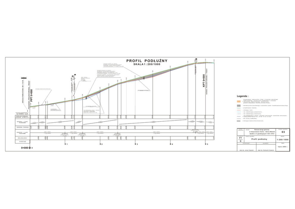 + 0,00 + 0,30 KPT 0+500 KONIEC PROJEKTOWANEJ TRASY + 0,30 0+472 L + 1,69 + 0,91 + 0,40 + 0,31 + 0,30 + 0,76 + 0,39 gruntowa droga dojazdowa do gruntów rolnych + 0,36 + 0,31 + 0,36 Legenda : koryto - warstwa gruntu pozyskanego z wykonania rowów i kształtowania korpusu drogi , rów odwadniający prawostronny - projektowana niweleta , koryto rów odwadniający i odparowujący prawostronny 154.72 155.02 154.72 154.72 działki o nr geodezyjnych 634 i 675/1 stadium PT temat rysunku : 2 3 4 5 projektował : numer rysunku : 03 skala: Profil podłużny branża D 1 Remont drogi gminnej obiekt : w miejscowości Sutno ; Gmina Mielnik 25.00 154.32 numer zlecenia i = 3.00% daszkowy P I K I E TA Ż 0+000 istniejąca nawierzchnia bitumiczna , prosta L = 25.00 m 72.00 50.00 50.00 75.00 60.00 50.00 i = 3.00% daszkowy rów odwadniający z dnem i skarpami umocnionymi elementami betonowymi , według KPED karty 01.03 , 01.04 , 01.37 , 01.38 , - dno koryta podbudowy , i = 1,20 % l = 25.00 m W4 km 0+472 załamanie osi trasy α = 1,48 g prosta L = 28.00 m i = 3.00% daszkowy W3 km 0+250 załamanie osi trasy α = 0,83 g 25.00 154.62 153.77 153.47 150.13 146.67 144.74 143.90 143.17 142.64 140.56 138.21 134.64 i = 1,43 % l = 28.00 m l = 22.00 m prosta L = 222.00 m i = 3.00% daszkowy 50.00 i = 3,86 % i = 5,42 % l = 200.00 m prosta L = 100.00 m W2 km 0+150 załamanie osi trasy α = 2,22 g 151.06 148.36 145.65 144.30 143.48 142.94 140.95 - rów odwadniający lewostronny , 138.97 135.00 133.84 133.59 20.00 i = 3.00% daszkowy - rów odwadniający prawostronny , % i = 7,94 m l = 100.00 prosta L = 50.00 m W1 km 0+100 załamanie osi trasy α = 2,78 g 50.00 ODLEGŁOŚCI 45.00 25.00 i = 3.00% daszkowy 27.00 prosta L = 100.00 m PROSTE I ŁUKI POZIOME 133.54 133.28 132.52 (130.61) 130.91 130.98 (130.22) 132.88 130.91 l = 82.00 m l = 20.00 m 130.50 (129.52) 04 % i = 5. m 3.00 l=2 i = 3.57 % i = 2.05 % i = 2.72 % l = 25.00 m 129.82 131.09 130.50 129.82 S PA D K I I Ł U K I PIONOWE - istniejący teren , rów odwadniający z dnem i skarpami umocnionymi elementami betonowymi , według KPED karty 01.03 , 01.04 , 01.37 , 01.38 , Hp= 125.00 m n.p.m. RZĘDNE TERENU rów odwadniający prawostronny projektowana nawierzchnia drogi z kruszywa naturalnego stabilizowanego mechanicznie ( podbudowa z kruszywa naturalnego stabilizowanego mechanicznie , grubość podbudowy zmienna minimum 30 cm) , POZIOM PORÓWNAWCZY PROJEKTOWANE RZĘDNE NIWELETY studzienka wpadowa , dno betonowe z betonu B-20 , ścianki murowane z bloczków betonowych , skarpy umocnione płytami betonowymi , H = 133,58m + 0,30 gruntowa droga dojazdowa do gruntów rolnych 0+120 L 0+127 P r e p e r r o b o c z y, narożnik fundamentu kapliczki , + 0,11 + 0,00 + 0,00 PPT 0+000 istniejąca nawierzchnia bitumiczna , + 0,00 POCZĄTEK PROJEKTOWANEJ TRASY D R O G A P O W I AT O WA N R 1 7 8 1 B istniejący przepust do remontu , wymiana na rury betonowe średnicy 40 cm , typu WIPRO , ścianki czołowe murowane z bloczków betonowych , L = 10.00 m , km 0+16 0 z e s t u d z i e n k ą w p a d o w ą , n a w l o c i e p r z e p u s t u , s t r. l e w a gruntowa droga dojazdowa do gruntów rolnych SKALA 1 : 200/1000 + 0,30 PROFIL PODŁUŻNY + 0,93 istniejący przepust do remontu , wymiana na rury betonowe średnicy 40 cm , typu WIPRO , ścianki czołowe murowane z bloczków betonowych , L = 10.00 m , km 0+325 sprawdził : 1:200 / 1000 data : l i p i e c 2 0 0 6 r. 0 mgr inż. Jerzy Czapiuk mgr inż. Romuald Czapiuk