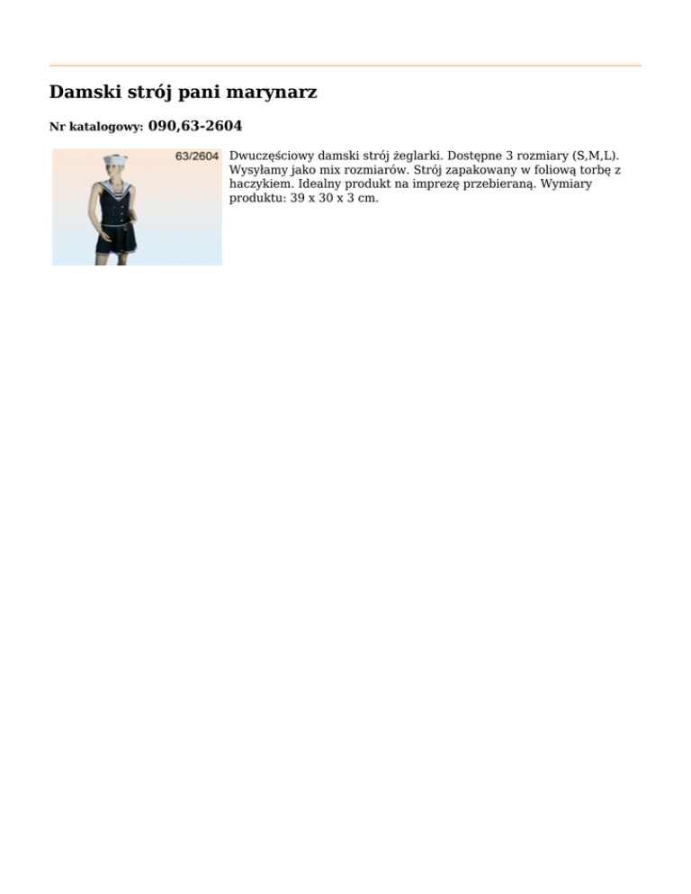 Damski strój pani marynarz Nr katalogowy: 090,63-2604 Dwuczęściowy damski strój żeglarki. Dostępne 3 rozmiary (S,M,L). Wysyłamy jako mix rozmiarów. Strój zapakowany w foliową torbę z haczykiem. Idealny produkt na imprezę przebieraną. Wymiary produktu: 39 x 30 x 3 cm.