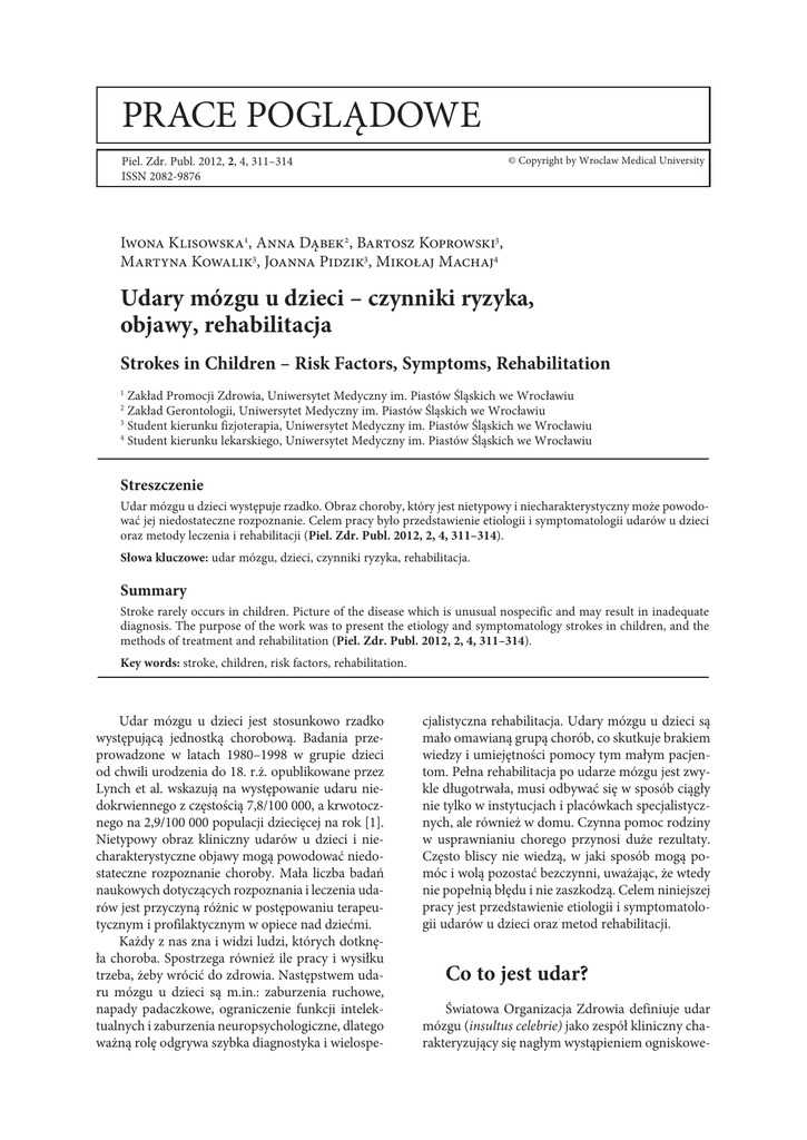 prace poglądowe Piel. Zdr. Publ. 2012, 2, 4, 311–314 ISSN 2082-9876 © Copyright by Wroclaw Medical University Iwona Klisowska1, Anna Dąbek2, Bartosz Koprowski3, Martyna Kowalik3, Joanna Pidzik3, Mikołaj Machaj4 Udary mózgu u dzieci – czynniki ryzyka, objawy, rehabilitacja Strokes in Children – Risk Factors, Symptoms, Rehabilitation Zakład Promocji Zdrowia, Uniwersytet Medyczny im. Piastów Śląskich we Wrocławiu Zakład Gerontologii, Uniwersytet Medyczny im. Piastów Śląskich we Wrocławiu 3 Student kierunku fizjoterapia, Uniwersytet Medyczny im. Piastów Śląskich we Wrocławiu 4 Student kierunku lekarskiego, Uniwersytet Medyczny im. Piastów Śląskich we Wrocławiu 1 2 Streszczenie Udar mózgu u dzieci występuje rzadko. Obraz choroby, który jest nietypowy i niecharakterystyczny może powodować jej niedostateczne rozpoznanie. Celem pracy było przedstawienie etiologii i symptomatologii udarów u dzieci oraz metody leczenia i rehabilitacji (Piel. Zdr. Publ. 2012, 2, 4, 311–314). Słowa kluczowe: udar mózgu, dzieci, czynniki ryzyka, rehabilitacja. Summary Stroke rarely occurs in children. Picture of the disease which is unusual nospecific and may result in inadequate diagnosis. The purpose of the work was to present the etiology and symptomatology strokes in children, and the methods of treatment and rehabilitation (Piel. Zdr. Publ. 2012, 2, 4, 311–314). Key words: stroke, children, risk factors, rehabilitation. Udar mózgu u dzieci jest stosunkowo rzadko występującą jednostką chorobową. Badania przeprowadzone w latach 1980–1998 w grupie dzieci od chwili urodzenia do 18. r.ż. opublikowane przez Lynch et al. wskazują na występowanie udaru niedokrwiennego z częstością 7,8/100 000, a krwotocznego na 2,9/100 000 populacji dziecięcej na rok [1]. Nietypowy obraz kliniczny udarów u dzieci i niecharakterystyczne objawy mogą powodować niedostateczne rozpoznanie choroby. Mała liczba badań naukowych dotyczących rozpoznania i leczenia udarów jest przyczyną różnic w postępowaniu terapeutycznym i profilaktycznym w opiece nad dziećmi. Każdy z nas zna i widzi ludzi, których dotknęła choroba. Spostrzega również ile pracy i wysiłku trzeba, żeby wrócić do zdrowia. Następstwem udaru mózgu u dzieci są m.in.: zaburzenia ruchowe, napady padaczkowe, ograniczenie funkcji intelektualnych i zaburzenia neuropsychologiczne, dlatego ważną rolę odgrywa szybka diagnostyka i wielospe- cjalistyczna rehabilitacja. Udary mózgu u dzieci są mało omawianą grupą chorób, co skutkuje brakiem wiedzy i umiejętności pomocy tym małym pacjentom. Pełna rehabilitacja po udarze mózgu jest zwykle długotrwała, musi odbywać się w sposób ciągły nie tylko w instytucjach i placówkach specjalistycznych, ale również w domu. Czynna pomoc rodziny w usprawnianiu chorego przynosi duże rezultaty. Często bliscy nie wiedzą, w jaki sposób mogą pomóc i wolą pozostać bezczynni, uważając, że wtedy nie popełnią błędu i nie zaszkodzą. Celem niniejszej pracy jest przedstawienie etiologii i symptomatologii udarów u dzieci oraz metod rehabilitacji. Co to jest udar? Światowa Organizacja Zdrowia definiuje udar mózgu (insultus celebrie) jako zespół kliniczny charakteryzujący się nagłym wystąpieniem ogniskowe- 312 I. Klisowska et al. go, a czasem uogólnionego zaburzenia czynności mózgu, którego objawy utrzymują się dłużej niż 24 godz. i nie mają innej przyczyny niż naczyniowa. WHO podaje również, że udar mózgu jest trzecią pod względem częstości przyczyną zgonów w krajach wysoko rozwiniętych (po chorobach układu krążenia i nowotworowych) oraz że częstość występowania zachorowań w Polsce wynosi 175/100 000 wśród mężczyzn i 125/100 000 u kobiet. U dzieci liczba rozpoznanych udarów mózgu jest znacznie mniejsza. Ze względu na mechanizm powstawania wyróżnia się dwa typy udarów mózgu: o typie krwotocznym i o typie niedokrwiennym. Udar o typie krwotocznym, potocznie zwany wylewem, powstaje najczęściej na skutek pęknięcia naczynia mózgowego (np. tętniaka mózgu), pęknięcia naczynia miażdżycowego lub urazów mózgowo-czaszkowych, a częstość jego występowania szacuje się na ok. 15%. Udary o typie niedokrwiennym natomiast dzieli się na udary zakrzepowe i zatorowe, które występują znacznie częściej niż krwotoczne. Szacuje się, że ok. 85% wszystkich udarów są to właśnie udary o typie niedokrwiennym [2]. – choroby serca: zaburzenia rytmu serca i przewodzenia, wrodzone i nabyte wady serca, choroba reumatyczna; – nieprawidłowości strukturalne: malformacje naczyniowe, dysplazja włóknisto-mięśniowa; – układowe choroby naczyń: cukrzyca, hipernatremia, nadciśnienie tętnicze; – choroby układowe tkanki łącznej: choroba Kawasaki, zapalenie guzkowe tętnic, zespół hemolityczno-mocznicowy, choroba Takayashu, choroba Schonleina-Henocha, toczeń rumieniowaty układowy; – uszkodzenia naczyń: uraz mechaniczny; – skurcz naczyń: migrena, stosowanie kokainy; – choroby metaboliczne: homocystynuria, choroby mitochondrialne (zespół MELAS), dyslipoproteinemia [1]. Czynnikiem ryzyka pierwszego udaru może być również rodzinne występowanie, szczególnie w sytuacji zaburzeń gospodarki lipidowej, a także zaburzeń immunologicznych czynników krzepnięcia [1]. Przyczyny udarów u dzieci U noworodków i małych dzieci najczęstszym objawem jakichkolwiek zaburzeń ze strony naczyń jest napad padaczkowy. Do innych objawów należą: drażliwość lub senność, zaburzenia oddychania, często uwypuklenie ciemiączka. U małego dziecka niedowłady mogą nie być widoczne od początku wystąpienia udaru. U dzieci starszych rozpoznanie udaru jest nieco łatwiejsze, chociaż zwykle nie zostaje on rozpoznany z powodu małej wiedzy rodziców – na ogół uważa się, że udar mózgu może występować tylko u ludzi starszych. Wiele objawów może być podobnych do tych, które występują podc