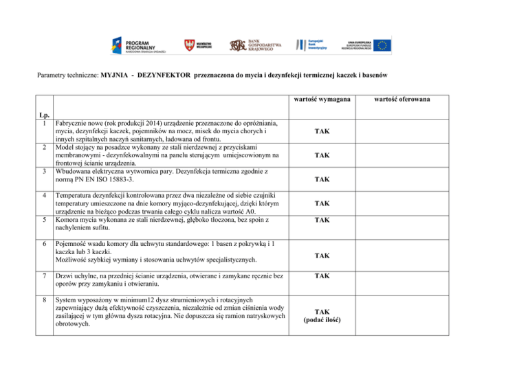 Parametry techniczne: MYJNIA - DEZYNFEKTOR przeznaczona do mycia i dezynfekcji termicznej kaczek i basenów wartość wymagana Lp. 1 Fabrycznie nowe (rok produkcji 2014) urządzenie przeznaczone do opróżniania, mycia, dezynfekcji kaczek, pojemników na mocz, misek do mycia chorych i innych szpitalnych naczyń sanitarnych, ładowana od frontu. 2 Model stojący na posadzce wykonany ze stali nierdzewnej z przyciskami membranowymi - dezynfekowalnymi na panelu sterującym umiejscowionym na frontowej ścianie urządzenia. 3 Wbudowana elektryczna wytwornica pary. Dezynfekcja termiczna zgodnie z normą PN EN ISO 15883-3. 4 5 6 Temperatura dezynfekcji kontrolowana przez dwa niezależne od siebie czujniki temperatury umieszczone na dnie komory myjąco-dezynfekującej, dzięki którym urządzenie na bieżąco podczas trwania całego cyklu nalicza wartość A0. Komora mycia wykonana ze stali nierdzewnej, głęboko tłoczona, bez spoin z nachyleniem sufitu. Pojemność wsadu komory dla uchwytu standardowego: 1 basen z pokrywką i 1 kaczka lub 3 kaczki. Możliwość szybkiej wymiany i stosowania uchwytów specjalistycznych. 7 Drzwi uchylne, na przedniej ścianie urządzenia, otwierane i zamykane ręcznie bez oporów przy zamykaniu i otwieraniu. 8 System wyposażony w minimum12 dysz strumieniowych i rotacyjnych zapewniający dużą efektywność czyszczenia, niezależnie od zmian ciśnienia wody zasilającej w tym główna dysza rotacyjna. Nie dopuszcza się ramion natryskowych obrotowych. TAK TAK TAK TAK TAK TAK TAK TAK (podać ilość) wartość oferowana 9 10 Drzwi komory wyposażone w uszczelkę z trwałego tworzywa sztucznego gwarantującą paroszczelność. Bezwzględnie wymagany brak przecieków pary wodnej z urządzenia podczas procesu mycia, dezynfekcji termicznej oraz suszenia. Wewnętrzna automatyczna dezynfekcja termiczna wszystkich rur doprowadzających wodę oraz dysz strumieniowych. TAK TAK 11 Komputerowe (procesor) sterowanie pracą urządzenia z możliwością rejestracji wyników na PC oraz przeprowadzenia walidacji. 12 Ergonomiczny ekran wyświetlający wartość A0 podczas procesu dezynfekcji oraz informacje niezbędne do obsługi i kontroli urządzenia w języku polskim. TAK 13 Optyczne i akustyczne informacje o usterkach. TAK 14 Programy dla mniej i bardziej zabrudzonych przedmiotów, poddawanych procesowi mycia i dezynfekcji. Minimum 3 programy standardowe. Wymiary zewnętrzne +/- 5% Szerokość : 500 mm. Głębokość : 450 mm. Wysokość : 1700 mm Wydajności pompy wody w zakresie od 60 do 90 litrów/min, moc pompy w zakresie od 0,4 do 0,6 kW. Urządzenie wyposażone w automatyczne, mechaniczne schładzanie i suszenie wsadu strumieniem powietrza, tzn. po zakończonym cyklu pracy wsad poddawany temu procesowi ma być schłodzony, suchy, bez skroplin wody na powierzchni i wewnątrz naczyń tj. suszenie ma być zgodne z definicją suszenia określoną normą PN EN ISO 15883-1. Otwór pomiarowy w komorze myjąco-dezynfekującej umożliwiający dokonanie dodatkowego, niezależnego od systemu kontroli urządzenia pomiaru wskaźnika A0 w trakcie procesu dezynfekcji zgodnie z ISO PN EN 15 883-1. Możliwość ustawienia w myjni wartości współczynnika A0 3000 - osiąganym w czasie max. 2,5 minuty. 15 16 17 18 19 20 Maksymalne zużycie wody na 1 cykl: program oszczędny - do 13 litrów program normalny - do 20 litrów TAK TAK TAK TAK TAK TAK TAK TAK 21 22 23 24 program intensywny - do 25 litrów Maksymalny poziom wytwarzanego hałasu 53 dB Urządzenie wyposażone w opcję przechodzenia w „stan czuwania” umożliwiający zmniejszenie zużycia energii. Zasilanie z 1-fazowej sieci elektroenergetycznej 230V 50 Hz max 2,7kW lub 3N PE ~ 400V, 50 Hz max. 4,6 kW. Podłączenie zimnej i ciepłej wody użytkowej – instalacja ½ cala. Izolacja od sieci wodociągowej zgodnie z europejską normą DIN/EN 1717 z przerwą powietrzną typu AA. 25 Podłączenie odpływu ścienne lub podłogowe 100 Ǿ. 26 Instrukcja obsługi w języku polskim (wraz z dostawą urządzenia). 27 Wyrób medyczny oznaczony znakiem CE -zgodny z normami krajowymi i europejskimi. 28 29 30 31 32 Deklaracja zgodności, dokument potwierdzający, iż przedmiot zamówienia został sklasyfikowany jako wyrób medyczny i znajduje się w bazie danych, wyrobów medycznych o której mowa w art. 64 ust. 1 ustawy z dnia 20 maja 2010r. o wyrobach medycznych (Dz. U z 2010r. Nr 107 poz. 679 ze zm.) . TAK TAK TAK TAK TAK TAK TAK TAK Zgodność z normą EN ISO 15883-1 i EN ISO 15883-3 potwierdzona certyfikatem zewnętrznej instytucji. Okres gwarancji minimum 60 miesięcy. TAK Zagwarantowana dostępność serwisu, części zamiennych przez 10 lat od daty zainstalowaniai uruchomienia. Pakiet startowy dla każdego urządzenia składający się z: TAK 5 szt. basenów szpitalnych plastikowych (kolor do uzgodnienia z Zamawiającym) 5 sztuk kaczek szpitalnych plastikowych, białych TAK TAK 1 poj. 5l środek odkamieniająco – nabłyszczający. 33 System otwarty tzn. Zamawiający może używać każdy obecny na rynku (dopuszczony do obrotu) środek nabłyszczająco – odkamieniający. TAK 34 35 Warunki serwisu: czas podjęcia naprawy - 24 godzin od momentu otrzymania pisemnej informacji o awarii. Czas naprawy z koniecznością oraz bez konieczności wymiany części - 48 godzin od momentu otrzymania pisemnej informacji o awarii. Czas naprawy z koniecznością sprowadzenia i wymiany części – 3 dni robocze od momentu otrzymania pisemnej informacji o awarii. TAK Przegląd sprzętu w okresie gwarancji -minimum 1x w roku. TAK