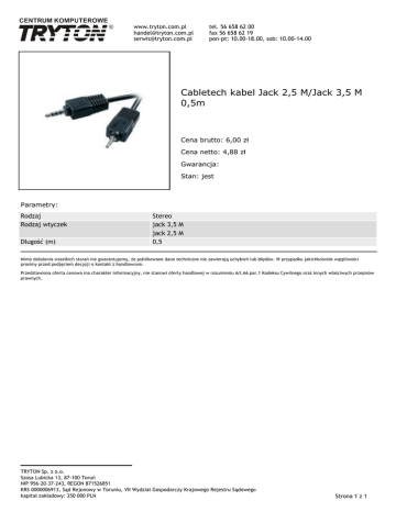 www.tryton.com.pl [email protected] [email protected] tel. 56 658 62 00 fax 56 658 62 19 pon-pt: 10.00-18.00, sob: 10.00-14.00 Cabletech kabel Jack 2,5 M/Jack 3,5 M 0,5m Cena brutto: 6,00 zł Cena netto: 4,88 zł Gwarancja: Stan: jest Parametry: Rodzaj Rodzaj wtyczek Długość (m) Stereo jack 3,5 M jack 2,5 M 0,5 Mimo dołożenia wszelkich starań nie gwarantujemy, że publikowane dane techniczne nie zawierają uchybień lub błędów. W przypadku jakichkolwiek wątpliwości prosimy przed podjęciem decyzji o kontakt z handlowcem. Przedstawiona oferta cenowa ma charakter informacyjny, nie stanowi oferty handlowej w rozumieniu Art.66 par.1 Kodeksu Cywilnego oraz innych właściwych przepisów prawnych. TRYTON Sp. z o.o. Szosa Lubicka 13, 87-100 Toruń NIP 956-20-37-243, REGON 871526851 KRS 0000006913, Sąd Rejonowy w Toruniu, VII Wydział Gospodarczy Krajowego Rejestru Sądowego kapitał zakładowy: 250 000 PLN Strona 1 z 1