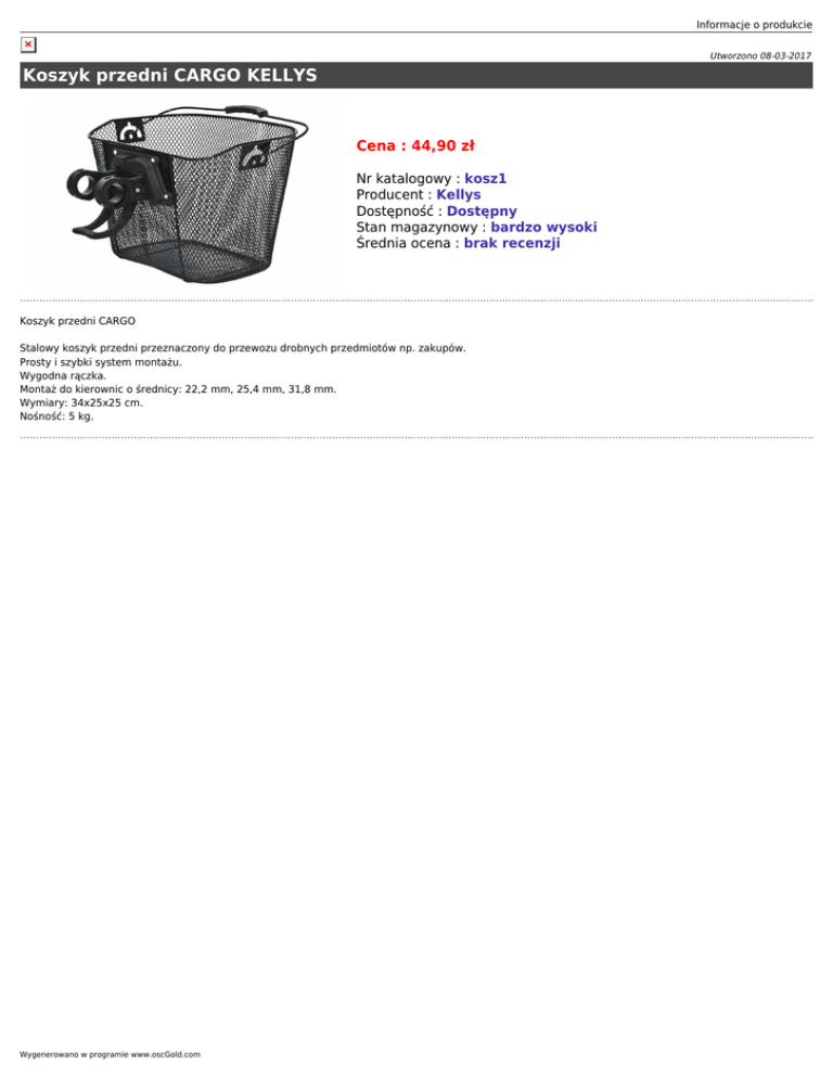 Informacje o produkcie Utworzono 08-03-2017 Koszyk przedni CARGO KELLYS Cena : 44,90 zł Nr katalogowy : kosz1 Producent : Kellys Dostępność : Dostępny Stan magazynowy : bardzo wysoki Średnia ocena : brak recenzji Koszyk przedni CARGO Stalowy koszyk przedni przeznaczony do przewozu drobnych przedmiotów np. zakupów. Prosty i szybki system montażu. Wygodna rączka. Montaż do kierownic o średnicy: 22,2 mm, 25,4 mm, 31,8 mm. Wymiary: 34x25x25 cm. Nośność: 5 kg. Wygenerowano w programie www.oscGold.com
