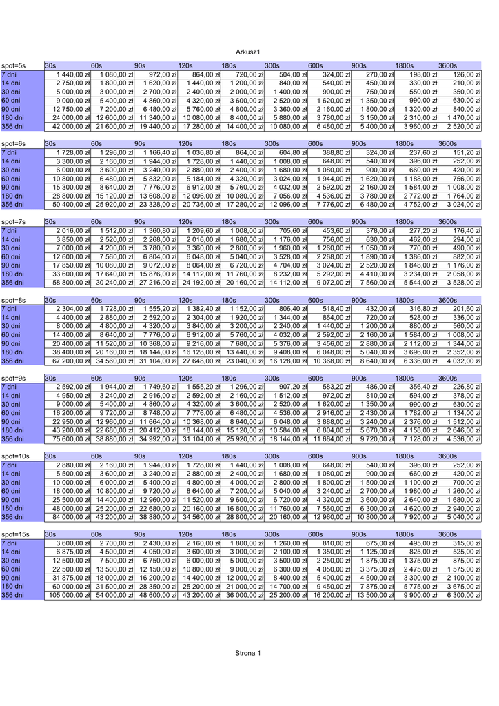 Arkusz1 spot=5s 7 dni 14 dni 30 dni 60 dni 90 dni 180 dni 356 dni 30s 60s 90s 120s 180s 300s 600s 900s 1800s 3600s 1 440,00 zł 1 080,00 zł 972,00 zł 864,00 zł 720,00 zł 504,00 zł 324,00 zł 270,00 zł 198,00 zł 126,00 zł 840,00 zł 540,00 zł 450,00 zł 330,00 zł 210,00 zł 2 750,00 zł 1 800,00 zł 1 620,00 zł 1 440,00 zł 1 200,00 zł 5 000,00 zł 3 000,00 zł 2 700,00 zł 2 400,00 zł 2 000,00 zł 1 400,00 zł 900,00 zł 750,00 zł 550,00 zł 350,00 zł 990,00 zł 630,00 zł 9 000,00 zł 5 400,00 zł 4 860,00 zł 4 320,00 zł 3 600,00 zł 2 520,00 zł 1 620,00 zł 1 350,00 zł 12 750,00 zł 7 200,00 zł 6 480,00 zł 5 760,00 zł 4 800,00 zł 3 360,00 zł 2 160,00 zł 1 800,00 zł 1 320,00 zł 840,00 zł 24 000,00 zł 12 600,00 zł 11 340,00 zł 10 080,00 zł 8 400,00 zł 5 880,00 zł 3 780,00 zł 3 150,00 zł 2 310,00 zł 1 470,00 zł 42 000,00 zł 21 600,00 zł 19 440,00 zł 17 280,00 zł 14 400,00 zł 10 080,00 zł 6 480,00 zł 5 400,00 zł 3 960,00 zł 2 520,00 zł spot=6s 7 dni 14 dni 30 dni 60 dni 90 dni 180 dni 356 dni 30s spot=7s 7 dni 14 dni 30 dni 60 dni 90 dni 180 dni 356 dni 30s spot=8s 7 dni 14 dni 30 dni 60 dni 90 dni 180 dni 356 dni 30s spot=9s 7 dni 14 dni 30 dni 60 dni 90 dni 180 dni 356 dni 30s spot=10s 7 dni 14 dni 30 dni 60 dni 90 dni 180 dni 356 dni 30s spot=15s 7 dni 14 dni 30 dni 60 dni 90 dni 180 dni 356 dni 30s 60s 90s 120s 180s 300s 600s 900s 1800s 3600s 1 728,00 zł 1 296,00 zł 1 166,40 zł 1 036,80 zł 864,00 zł 604,80 zł 388,80 zł 324,00 zł 237,60 zł 151,20 zł 648,00 zł 540,00 zł 396,00 zł 252,00 zł 3 300,00 zł 2 160,00 zł 1 944,00 zł 1 728,00 zł 1 440,00 zł 1 008,00 zł 6 000,00 zł 3 600,00 zł 3 240,00 zł 2 880,00 zł 2 400,00 zł 1 680,00 zł 1 080,00 zł 900,00 zł 660,00 zł 420,00 zł 756,00 zł 10 800,00 zł 6 480,00 zł 5 832,00 zł 5 184,00 zł 4 320,00 zł 3 024,00 zł 1 944,00 zł 1 620,00 zł 1 188,00 zł 15 300,00 zł 8 640,00 zł 7 776,00 zł 6 912,00 zł 5 760,00 zł 4 032,00 zł 2 592,00 zł 2 160,00 zł 1 584,00 zł 1 008,00 zł 28 800,00 zł 15 120,00 zł 13 608,00 zł 12 096,00 zł 10 080,00 zł 7 056,00 zł 4 536,00 zł 3 780,00 zł 2 772,00 zł 1 764,00 zł 50 400,00 zł 25 920,00 zł 23 328,00 zł 20 736,00 zł 17 280,00 zł 12 096,00 zł 7 776,00 zł 6 480,00 zł 4 752,00 zł 3 024,00 zł 60s 90s 120s 180s 300s 600s 900s 1800s 3600s 2 016,00 zł 1 512,00 zł 1 360,80 zł 1 209,60 zł 1 008,00 zł 705,60 zł 453,60 zł 378,00 zł 277,20 zł 176,40 zł 756,00 zł 630,00 zł 462,00 zł 294,00 zł 3 850,00 zł 2 520,00 zł 2 268,00 zł 2 016,00 zł 1 680,00 zł 1 176,00 zł 7 000,00 zł 4 200,00 zł 3 780,00 zł 3 360,00 zł 2 800,00 zł 1 960,00 zł 1 260,00 zł 1 050,00 zł 770,00 zł 490,00 zł 882,00 zł 12 600,00 zł 7 560,00 zł 6 804,00 zł 6 048,00 zł 5 040,00 zł 3 528,00 zł 2 268,00 zł 1 890,00 zł 1 386,00 zł 17 850,00 zł 10 080,00 zł 9 072,00 zł 8 064,00 zł 6 720,00 zł 4 704,00 zł 3 024,00 zł 2 520,00 zł 1 848,00 zł 1 176,00 zł 33 600,00 zł 17 640,00 zł 15 876,00 zł 14 112,00 zł 11 760,00 zł 8 232,00 zł 5 292,00 zł 4 410,00 zł 3 234,00 zł 2 058,00 zł 58 800,00 zł 30 240,00 zł 27 216,00 zł 24 192,00 zł 20 160,00 zł 14 112,00 zł 9 072,00 zł 7 560,00 zł 5 544,00 zł 3 528,00 zł 60s 90s 120s 180s 300s 600s 900s 1800s 3600s 2 304,00 zł 1 728,00 zł 1 555,20 zł 1 382,40 zł 1 152,00 zł 806,40 zł 518,40 zł 432,00 zł 316,80 zł 201,60 zł 864,00 zł 720,00 zł 528,00 zł 336,00 zł 4 400,00 zł 2 880,00 zł 2 592,00 zł 2 304,00 zł 1 920,00 zł 1 344,00 zł 8 000,00 zł 4 800,00 zł 4 320,00 zł 3 840,00 zł 3 200,00 zł 2 240,00 zł 1 440,00 zł 1 200,00 zł 880,00 zł 560,00 zł 14 400,00 zł 8 640,00 zł 7 776,00 zł 6 912,00 zł 5 760,00 zł 4 032,00 zł 2 592,00 zł 2 160,00 zł 1 584,00 zł 1 008,00 zł 20 400,00 zł 11 520,00 zł 10 368,00 zł 9 216,00 zł 7 680,00 zł 5 376,00 zł 3 456,00 zł 2 880,00 zł 2 112,00 zł 1 344,00 zł 38 400,00 zł 20 160,00 zł 18 144,00 zł 16 128,00 zł 13 440,00 zł 9 408,00 zł 6 048,00 zł 5 040,00 zł 3 696,00 zł 2 352,00 zł 67 200,00 zł 34 560,00 zł 31 104,00 zł 27 648,00 zł 23 040,00 zł 16 128,00 zł 10 368,00 zł 8 640,00 zł 6 336,00 zł 4 032,00 zł 60s 90s 120s 180s 300s 600s 900s 1800s 3600s 2 592,00 zł 1 944,00 zł 1 749,60 zł 1 555,20 zł 1 296,00 zł 907,20 zł 583,20 zł 486,00 zł 356,40 zł 226,80 zł 972,00 zł 810,00 zł 594,00 zł 378,00 zł 4 950,00 zł 3 240,00 zł 2 916,00 zł 2 592,00 zł 2 160,00 zł 1 512,00 zł 9 000,00 zł 5 400,00 zł 4 860,00 zł 4 320,00 zł 3 600,00 zł 2 520,00 zł 1 620,00 zł 1 350,00 zł 990,00 zł 630,00 zł 16 200,00 zł 9 720,00 zł 8 748,00 zł 7 776,00 zł 6 480,00 zł 4 536,00 zł 2 916,00 zł 2 430,00 zł 1 782,00 zł 1 134,00 zł 22 950,00 zł 12 960,00 zł 11 664,00 zł 10 368,00 zł 8 640,00 zł 6 048,00 zł 3 888,00 zł 3 240,00 zł 2 376,00 zł 1 512,00 zł 43 200,00 zł 22 680,00 zł 20 412,00 zł 18 144,00 zł 15 120,00 zł 10 584,00 zł 6 804,00 zł 5 670,00 zł 4 158,00 zł 2 646,00 zł 75 600,00 zł 38 880,00 zł 34 992,00 zł 31 104,00 zł 25 920,00 zł 18 144,00 zł 11 664,00 zł 9 720,00 zł 7 128,00 zł 4 536,00 zł 2 880,00 zł 5 500,00 zł 10 000,00 zł 18 000,00 zł 25 500,00 zł 48 000,00 zł 84 000,00 zł 3 600,00 zł 6 875,00 zł 12 500,00 zł 22 500,00 zł 31 875,00 zł 60 000,00 zł 105 000,00 zł 60s 90s 120s 180s 300s 600s 900s 1800s 3600s 2 160,00 zł 1 944,00 zł 1 728,00 zł 1 440,00 zł 1 008,00 zł 648,00 zł 540,00 zł 396,00 zł 252,00 zł 900,00 zł 660,00 zł 420,00 zł 3 600,00 zł 3 240,00 zł 2 880,00 zł 2 400,00 zł 1 680,00 zł 1 080,00 zł 6 000,00 zł 5 400,00 zł 4 800,00 zł 4 000,00 zł 2 800,00 zł 1 800,00 zł 1 500,00 zł 1 100,00 zł 700,00 zł 10 800,00 zł 9 720,00 zł 8 640,00 zł 7 200,00 zł 5 040,00 zł 3 240,00 zł 2 700,00 zł 1 980,00 zł 1 260,00 zł 14 400,00 zł 12 960,00 zł 11 520,00 zł 9 600,00 zł 6 720,00 zł 4 320,00 zł 3 600,00 zł 2 640,00 zł 1 680,00 zł 25 200,00 zł 22 680,00 zł 20 160