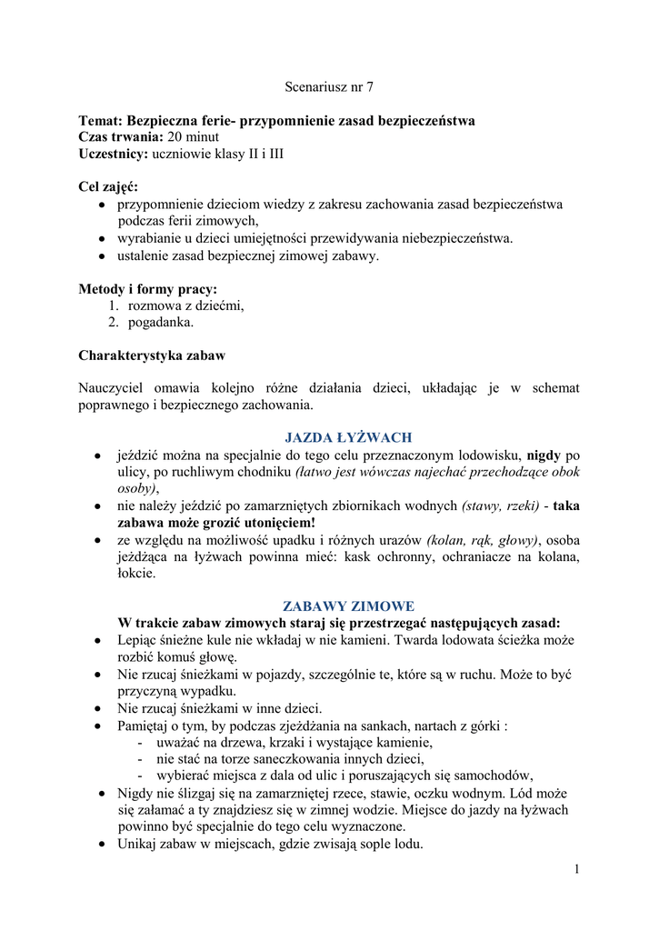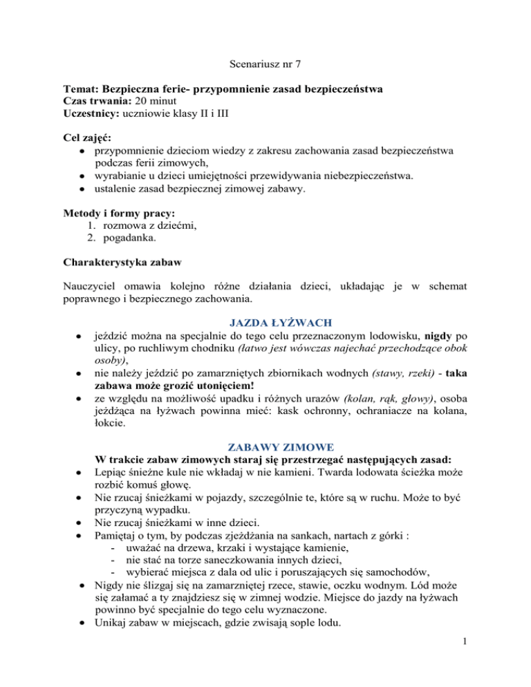 Scenariusz nr 7 Temat: Bezpieczna ferie- przypomnienie zasad bezpieczeństwa Czas trwania: 20 minut Uczestnicy: uczniowie klasy II i III Cel zajęć: przypomnienie dzieciom wiedzy z zakresu zachowania zasad bezpieczeństwa podczas ferii zimowych, wyrabianie u dzieci umiejętności przewidywania niebezpieczeństwa. ustalenie zasad bezpiecznej zimowej zabawy. Metody i formy pracy: 1. rozmowa z dziećmi, 2. pogadanka. Charakterystyka zabaw Nauczyciel omawia kolejno różne działania dzieci, układając je w schemat poprawnego i bezpiecznego zachowania. JAZDA ŁYŻWACH jeździć można na specjalnie do tego celu przeznaczonym lodowisku, nigdy po ulicy, po ruchliwym chodniku (łatwo jest wówczas najechać przechodzące obok osoby), nie należy jeździć po zamarzniętych zbiornikach wodnych (stawy, rzeki) - taka zabawa może grozić utonięciem! ze względu na możliwość upadku i różnych urazów (kolan, rąk, głowy), osoba jeżdżąca na łyżwach powinna mieć: kask ochronny, ochraniacze na kolana, łokcie. ZABAWY ZIMOWE W trakcie zabaw zimowych staraj się przestrzegać następujących zasad: Lepiąc śnieżne kule nie wkładaj w nie kamieni. Twarda lodowata ścieżka może rozbić komuś głowę. Nie rzucaj śnieżkami w pojazdy, szczególnie te, które są w ruchu. Może to być przyczyną wypadku. Nie rzucaj śnieżkami w inne dzieci. Pamiętaj o tym, by podczas zjeżdżania na sankach, nartach z górki : - uważać na drzewa, krzaki i wystające kamienie, - nie stać na torze saneczkowania innych dzieci, - wybierać miejsca z dala od ulic i poruszających się samochodów, Nigdy nie ślizgaj się na zamarzniętej rzece, stawie, oczku wodnym. Lód może się załamać a ty znajdziesz się w zimnej wodzie. Miejsce do jazdy na łyżwach powinno być specjalnie do tego celu wyznaczone. Unikaj zabaw w miejscach, gdzie zwisają sople lodu. 1 Nie baw się na jezdni. Kulig za samochodem lub ciągnikiem może zakończyć się nieszczęśliwie. Ślizganie się na butach trzymając się jadącego pojazdu może być przyczyną wypadku. Ślizgawka na chodniku to zły pomysł. Ktoś może złamać nogę lub rękę gdy na niej upadnie. Cechy bezpiecznej zabawy Uczniowie pod kierunkiem nauczyciela ustalają listę cech bezpiecznej zabawy, najważniejsze wpisują na tablicy. Zabawa jest bezpieczna gdy: odbywa się w miejscach do tego celu przeznaczonych; sprzęt do zabawy i zabawki wykorzystywane są zgodnie z ich przeznaczeniem ; w zabawie wykorzystujemy tylko sprzęt sprawny; uczestnicy zabawy przestrzegają zasad i reguł zabawy; zabezpieczamy się odpowiednio przed wypadkiem lub urazem; wybór zabawy jest zgodny z umiejętnościami uczestników oraz aktualną pogodą (wtedy, gdy zabawa odbywa się na dworze). 2