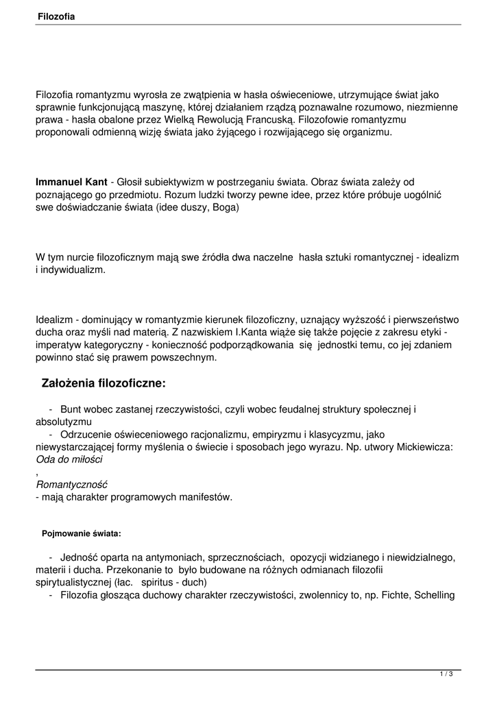 Filozofia Filozofia romantyzmu wyrosła ze zwątpienia w hasła oświeceniowe, utrzymujące świat jako sprawnie funkcjonującą maszynę, której działaniem rządzą poznawalne rozumowo, niezmienne prawa - hasła obalone przez Wielką Rewolucją Francuską. Filozofowie romantyzmu proponowali odmienną wizję świata jako żyjącego i rozwijającego się organizmu. Immanuel Kant - Głosił subiektywizm w postrzeganiu świata. Obraz świata zależy od poznającego go przedmiotu. Rozum ludzki tworzy pewne idee, przez które próbuje uogólnić swe doświadczanie świata (idee duszy, Boga) W tym nurcie filozoficznym mają swe źródła dwa naczelne hasła sztuki romantycznej - idealizm i indywidualizm. Idealizm - dominujący w romantyzmie kierunek filozoficzny, uznający wyższość i pierwszeństwo ducha oraz myśli nad materią. Z nazwiskiem I.Kanta wiąże się także pojęcie z zakresu etyki imperatyw kategoryczny - konieczność podporządkowania się jednostki temu, co jej zdaniem powinno stać się prawem powszechnym. Założenia filozoficzne: - Bunt wobec zastanej rzeczywistości, czyli wobec feudalnej struktury społecznej i absolutyzmu - Odrzucenie oświeceniowego racjonalizmu, empiryzmu i klasycyzmu, jako niewystarczającej formy myślenia o świecie i sposobach jego wyrazu. Np. utwory Mickiewicza: Oda do miłości , Romantyczność - mają charakter programowych manifestów. Pojmowanie świata: - Jedność oparta na antymoniach, sprzecznościach, opozycji widzianego i niewidzialnego, materii i ducha. Przekonanie to było budowane na różnych odmianach filozofii spirytualistycznej (łac. spiritus - duch) - Filozofia głosząca duchowy charakter rzeczywistości, zwolennicy to, np. Fichte, Schelling 1/3 Filozofia Jedną z jej odmian jest oparta na wierzeniach ludowych. Zakładano istnienie świata duchowego, który realizował się we wszystkim co materialne, co widzialne. Między światem ducha i ludzkim zachodzą tzw. odpowiedniości (korespondencje), to co dzieje się w sferze ducha, natychmiast realizuje się w świecie ziemskim. Świat pojmowano jako antynomiczną jedność, która podkreślała: ducha i materię, dobro i zło, uczucie i rozum, młodość i starość, to co wewnętrzne i zewnętrzne, to co na dole i co na górze, prawdy żywe i martwe, wolność i despotyzm, ludy i monarchistyczne rządy, pokrzywdzeni i krzywdziciele, itd. Na tej zasadzie romantycy opierali swoje poczucie tragizmu, które najczęściej dostrzegali na przykładzie części i całości, jednostki i zbiorowości, wolności i konieczności, postępu i tradycji, obowiązkiem działania a nielegalnością czynu. Np. Mickiewicz w III cz. Dziadów, Słowacki w Ko rdianie , Krasiński w Nie-boskiej komedii . Jan Gattieb Fichte - woli, czynowi, ideałowi przyznawał pierwszeństwo przed rzeczywistością i materią. Jego filozofia oscylowała w kierunku idealistycznej metafizyki. Jego zdaniem najważniejsza była wolność oraz indywidualizm jednostki, jej możliwości kreacyjne stawiał na równi z mocą Boga. Fryderyk Schlegel - zajął się rolą artysty w społeczeństwie, głosił ideę sztuki spontanicznej oraz koncepcję uniwersalnej poezji, zbliżającej się do religii. Tworzenie było dla niego aktem boskiej kreacji, w czasie której artysta wznosi się ponad rzeczywistość ziemską, odrzuca wszelkie normy i prawa, dominuje nad swym dziełem i odbiorcą. Wilhelm Schelling - wprowadził do filozofii pojęcie absolutu, czyli jedynego bytu. Część widzialna bytu to przyroda, a niewidzialna to duch. Kładł nacisk na rolę ludzkiej wyobraźni, symbol, mit. Przyrodę pojmował jako twórczą siłę, mającą charakter duchowy. Sztukę traktował jako sposób poznawania rzeczywistości, najwyższy ludzki twór. Artysta przestaje naśladować świat zewnętrzny, usiłuje dotrzeć do ducha, do nieskończoności (irracjonalizm, intuicjonizm). Głosił koncepcje miłości romantycznej jako uczucia, które ma wymiar kosmiczny, od miłości zmysłowej, miłości do kobiety, poprzez więź z bliźnimi, z narodem i sięga aż w sferę nieskończoności, np. Konrad z III cz. Dziadów. 2/3 Filozofia Irracjonalizm - przekonanie o możliwościach pozarozumowego poznania bytu, za pomocą intuicji, wiary i szaleństwa. Odrzuca empiryzm i scjentyzm a świat traktuje jako tajemną księgę, którą odczytać mogą tylko wybrane jednostki. W romantyzmie takimi uprzywilejowanymi badaczami bytu byli poeci, szaleńcy, dzieci i ludzie prości. Georg Wilhelm Fryderyk Hegle - Głosił że byt a więc i historia, to zjawiska intelektualne, które nieustannie się rozwijają. Rozwój ma charakter logiczny. Dzieje świata nie są mozaiką przypadkowych wydarzeń, lecz celowym wcieleniem się w duc ha świata w losy narodów, które są dopełnieniem swoich misji w dziejach. W sposób szczególny dziejowe posłannictwo pełnią jednostki wybitne. Filozofia romantyzmu, zwłaszcza niemieckiego, miała charakter metafizyczny i idealistyczny, odrzucał empiryzm oraz realizm. 3/3