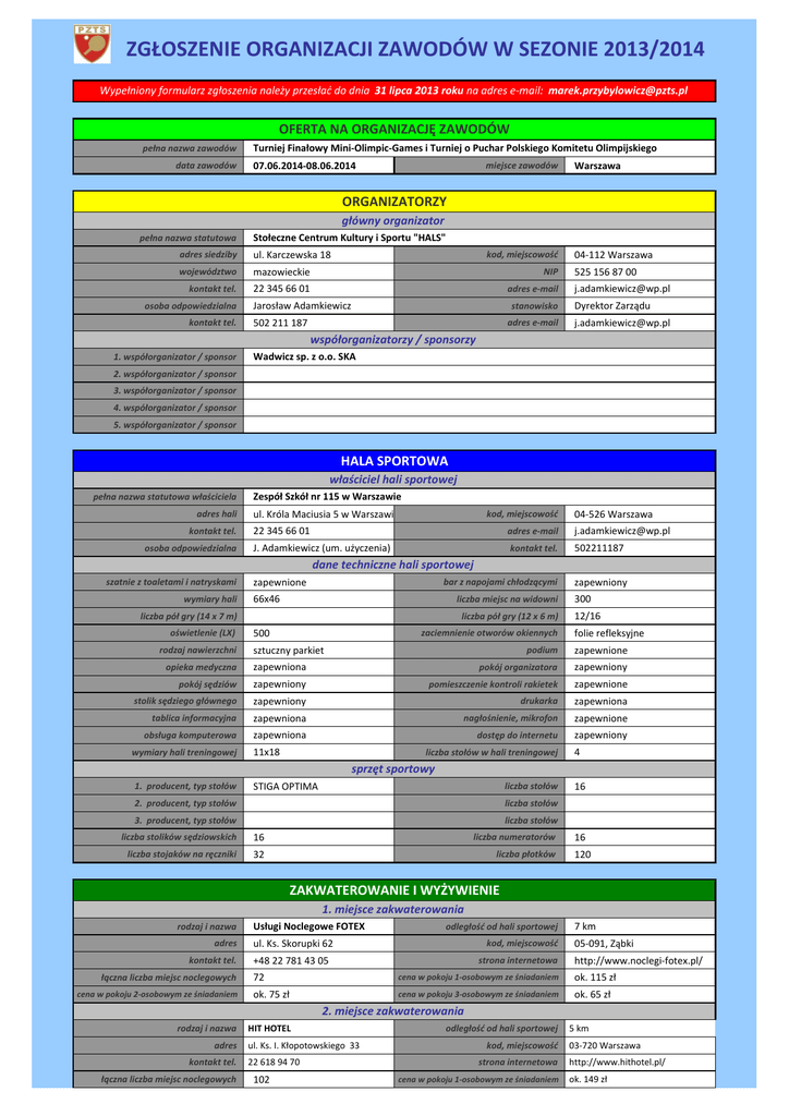 ZGŁOSZENIE ORGANIZACJI ZAWODÓW W SEZONIE 2013/2014 Wypełniony formularz zgłoszenia należy przesłać do dnia 31 lipca 2013 roku na adres e-mail: [email protected] OFERTA NA ORGANIZACJĘ ZAWODÓW pełna nazwa zawodów data zawodów Turniej Finałowy Mini-Olimpic-Games i Turniej o Puchar Polskiego Komitetu Olimpijskiego 07.06.2014-08.06.2014 miejsce zawodów Warszawa kod, miejscowość 04-112 Warszawa ORGANIZATORZY główny organizator pełna nazwa statutowa Stołeczne Centrum Kultury i Sportu "HALS" adres siedziby ul. Karczewska 18 województwo mazowieckie NIP kontakt tel. 22 345 66 01 adres e-mail osoba odpowiedzialna kontakt tel. Jarosław Adamkiewicz stanowisko 502 211 187 adres e-mail 525 156 87 00 [email protected] Dyrektor Zarządu [email protected] współorganizatorzy / sponsorzy 1. współorganizator / sponsor Wadwicz sp. z o.o. SKA 2. współorganizator / sponsor 3. współorganizator / sponsor 4. współorganizator / sponsor 5. współorganizator / sponsor HALA SPORTOWA właściciel hali sportowej pełna nazwa statutowa właściciela Zespół Szkół nr 115 w Warszawie adres hali ul. Króla Maciusia 5 w Warszawie kontakt tel. osoba odpowiedzialna kod, miejscowość 22 345 66 01 J. Adamkiewicz (um. użyczenia) 04-526 Warszawa adres e-mail [email protected] kontakt tel. 502211187 dane techniczne hali sportowej szatnie z toaletami i natryskami wymiary hali zapewnione bar z napojami chłodzącymi 66x46 liczba miejsc na widowni liczba pół gry (14 x 7 m) oświetlenie (LX) rodzaj nawierzchni liczba pół gry (12 x 6 m) 500 zaciemnienie otworów okiennych sztuczny parkiet zapewniony 300 12/16 folie refleksyjne podium zapewnione opieka medyczna zapewniona pokój organizatora zapewniony pokój sędziów zapewniony pomieszczenie kontroli rakietek zapewnione stolik sędziego głównego zapewniony drukarka zapewniona tablica informacyjna zapewniona nagłośnienie, mikrofon zapewnione obsługa komputerowa zapewniona dostęp do internetu zapewniony wymiary hali treningowej 11x18 liczba stołów w hali treningowej 4 sprzęt sportowy 1. producent, typ stołów STIGA OPTIMA liczba stołów 2. producent, typ stołów 16 liczba stołów 3. producent, typ stołów liczba stołów liczba stolików sędziowskich 16 liczba numeratorów liczba stojaków na ręczniki 32 liczba płotków 16 120 ZAKWATEROWANIE I WYŻYWIENIE 1. miejsce zakwaterowania rodzaj i nazwa adres kontakt tel. łączna liczba miejsc noclegowych cena w pokoju 2-osobowym ze śniadaniem Usługi Noclegowe FOTEX odległość od hali sportowej ul. Ks. Skorupki 62 kod, miejscowość +48 22 781 43 05 strona internetowa 7 km 05-091, Ząbki http://www.noclegi-fotex.pl/ 72 cena w pokoju 1-osobowym ze śniadaniem ok. 115 zł ok. 75 zł cena w pokoju 3-osobowym ze śniadaniem ok. 65 zł 2. miejsce zakwaterowania rodzaj i nazwa adres kontakt tel. łączna liczba miejsc noclegowych HIT HOTEL ul. Ks. I. Kłopotowskiego 33 22 618 94 70 102 odległość od hali sportowej kod, miejscowość strona internetowa cena w pokoju 1-osobowym ze śniadaniem 5 km 03-720 Warszawa http://www.hithotel.pl/ ok. 149 zł cena w pokoju 2-osobowym ze śniadaniem ok. 85 zł cena w pokoju 3-osobowym ze śniadaniem ok. 66 zł 3. miejsce zakwaterowania rodzaj i nazwa odległość od hali sportowej adres kod, miejscowość kontakt tel. strona internetowa łączna liczba miejsc noclegowych cena w pokoju 1-osobowym ze śniadaniem cena w pokoju 2-osobowym ze śniadaniem cena w pokoju 3-osobowym ze śniadaniem ceny wyżywienia cena obiadu ok. 15-20 zł ok. 15-20 zł cena kolacji NAGRODY suma nagród finansowych (seniorzy) brak puchary (i medale) dla 4 najlepszych zapewnione 1500 zł suma nagród rzeczowych zapewnione dyplomy dla 4 najlepszych INFORMACJE DODATKOWE Komitet Organizacyjny działania promocyjne materiały prasowe ceremonia otwarcia imprezy towarzyszące ceremonia otwarcia sprawozdanie z zawodów dokumentacja fotograficzna zapewniony zapewnione zapewnione zapewniona zapewnione zapewniona zapewnione zapewniona OSOBY UPOWAŻNIONIONE DO REPREZENTOWANIA ORGANIZATORA NAZWISKO imię Jarosław Adamkiewicz Monika Ejgierd funkcja Dyrektor Zarządu Dyrektor Administracyjny kontakt tel. adres e-mail 502 211 187 [email protected] 22 345 66 01 [email protected] Oświadczamy, że w przypadku przyznania nam organizacji zawodów, podejmiemy z należytą starannością wszelkie działania w celu zorganizowania zawodów zgodnie z umową podpisaną z Polskim Związkiem Tenisa Stołowego. UWAGI PZTS data wpłynięcia zgłoszenia 2013.07.31