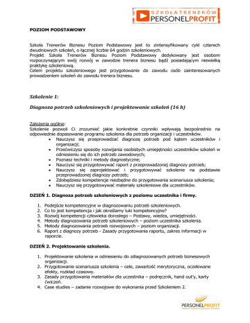 POZIOM PODSTAWOWY Szkoła Trenerów Biznesu Poziom Podstawowy jest to zintensyfikowany cykl czterech dwudniowych szkoleń, o łącznej liczbie 64 godzin szkoleniowych. Projekt Szkoła Trenerów Biznesu Poziom Podstawowy dedykowany jest osobom rozpoczynającym swój rozwój w zawodzie trenera biznesu bądź posiadającym niewielką praktykę szkoleniową. Celem projektu szkoleniowego jest przygotowanie do zawodu osób zainteresowanych prowadzeniem szkoleń do zawodu trenera biznesu. Szkolenie 1: Diagnoza potrzeb szkoleniowych i projektowanie szkoleń (16 h) Założenia ogólne: Szkolenie pozwoli Ci zrozumieć jakie konkretnie czynniki wpływają bezpośrednio na odpowiednie dopasowanie programu szkolenia dla potrzeb organizacji i uczestników.  Nauczysz się przeprowadzać diagnozę potrzeb pod kątem uczestników i organizacji;  Przećwiczysz sposoby rozwijania osobistych umiejętności uczestników szkoleń w odniesieniu się do ich potrzeb zawodowych;  Poznasz techniki i metody diagnostyczne;  Nauczysz się przygotowywać raport z przeprowadzonej diagnozy potrzeb;  Nauczysz się zaprojektować i przygotowywać szkolenie na podstawie przeprowadzonej diagnozy potrzeb;  Zdobędziesz kompetencje niezbędne do przygotowania scenariusza szkolenia;  Nauczysz się przygotowywać materiały szkoleniowe dla uczestników. DZIEŃ 1. Diagnoza potrzeb szkoleniowych z poziomu uczestnika i firmy. 1. 2. 3. 4. 5. 6. Podejście kompetencyjne w diagnozowaniu potrzeb szkoleniowych. Co to jest kompetencja i jak określamy luki kompetencyjne? Rozwój kompetencji człowieka dorosłego – Postawy, wiedza, umiejętności. Metody diagnozowania potrzeb szkoleniowych – poziom uczestnika szkolenia. Metody diagnozowania potrzeb rozwojowych – poziom organizacji. Raport z diagnozy potrzeb - Zasady przygotowania raportu, zakres informacji w raporcie. DZIEŃ 2. Projektowanie szkolenia. 1. Projektowanie szkolenia w odniesieniu do zdiagnozowanych potrzeb biznesowych organizacji. 2. Przygotowanie scenariusza szkolenia – cele, zawartość merytoryczna, oczekiwane efekty, rozkład czasowy. 3. Zasady przygotowania materiałów dla uczestnika – podręcznik, hand out’y, karty ćwiczeń. 4. Case studies – zadanie rozwojowe do wykonania przed Szkoleniem 2. Szkolenie 2: Aktywizujące metody prowadzenia szkoleń (16 h) Założenia ogólne: Szkolenie pozwoli Ci zdobyć wiedzę na temat zasad efektywnego uczenia ludzi dorosłych oraz zdobyć kompetencje niezbędne do przeprowadzenia szkolenia z wykorzystaniem interaktywnych metod pracy z uczestnikami.  Zapoznasz się z najważniejszymi zasadami uczenia dorosłych i ich wykorzystania podczas realizacji szkolenia;  Poznasz ciekawe, różnorodne metody przekazywania wiedzy, trenowania umiejętności i pracy na postawach uczestników;  Nabędziesz umiejętności aktywnego przekazu informacji oraz technik aktywizujących dla uczestników szkolenia;  Zdobędziesz umiejętności przekazywania rozwojowej informacji zwrotnej uczestnikom szkolenia;  Nauczysz się pracy szkoleniowej z wykorzystaniem technik audiowizualnych – materiałów video, audio, prezentacji.  Zdobędziesz kompetencje do przeprowadzenia profesjonalnej prezentacji z wykorzystaniem PowerPoint. DZIEŃ 1.W jaki sposób uczą się dorośli? 1. Uczenie się człowieka dorosłego - Edukacja dorosłych. 2. Style uczenia się dorosłych - koncepcja Kolba, style uczenia się według Honey i Mumford. 3. Przegląd teorii motywacji w procesie rozwoju kompetencji dorosłych – co wzmacnia motywację rozwojową uczestników szkoleń. 4. Przejście od etapu nieświadomej niekompetencji do nieświadomej kompetencji w procesie szkoleniowym. 5. Struktura szkolenia – omówienie wszystkich etapów. Zasady kontraktowania pracy z uczestnikami. DZIEŃ 2. Przegląd efektywnych metod szkoleniowych. 1. 2. 3. 4. 5. Oprawa szkolenia – organizacja przestrzeni na sali szkoleniowej. Wykorzystanie technik audiowizualnych w trakcie realizacji szkolenia. Zasady przygotowania i prowadzenia skutecznej prezentacji. Informacja zwrotna, jako kluczowa technika pracy z uczestnikami szkolenia. Przegląd kluczowych technik szkoleniowych wykorzystywanych do rozwoju kompetencji uczestników szkoleń. 6. Case studies – zadanie rozwojowe do wykonania przed Szkoleniem 3. Szkolenie 3: Trudne sytuacje zawodowe w pracy z grupą (16 h) Założenia główne: Szkolenie pozwoli Ci usprawnić pracę z grupami szkoleniowymi oraz nauczy Cię neutralizować niepożądane sytuacje, którym jako trener musisz stawić czoła.  Rozwiniesz swoje kompetencje w obszarze radzenia sobie z trudnymi sytuacjami zawodowymi;  Dowiesz się w jaki sposób zadbać o logistykę szkolenia, by zoptymalizować jej wpływ na atmosferę na szkoleniu;  Nauczysz się panować nad własnym napięciem emocjonalnym, emocjami uczestników szkoleń, radzenia sobie z jawną i ukrytą agresją uczestników szkoleń;  Poznasz metody postępowania z destrukcyjnymi członkami grupy (uczestnik: bierny, agresywny, niezainteresowany, nadmiernie dociekliwy);  Pogłębisz wiedzę z zakresu asertywności oraz radzenia sobie z manipulacyjnym zachowaniem uczestników;  Będziesz doskonalić metody opanowania emocji pojawiających się na sali szkoleniowej;  Nauczysz się w jaki sposób odpowiadać na tzw. trudne pytania;  Poznasz sposoby wykorzystywania pozytywnych uczestników w walce z destrukcyjnymi uczestnikami;  Zrealizujesz próbkę szkoleniową, i w efekcie otrzymasz rozwojową informację zwrotną od trenera i pozostałych uczestników szkolenia. DZIEŃ 1. Proces grupowy w trakcie szkolenia. 1. 2. 3. 4. 5. Trudne sytuacje zawodowe w pracy trenera - czynniki wynikające z ograniczeń firmy. Trudne sytuacje zawodowe w pracy trenera – czynniki wynikające z grupy. Proces grupowy w trakcie szkolenia – definicja, etapy procesu grupowego. Komunikacyjne metody radzenia sobie w trudnych sytuacjach szkoleniowych. Asertywne techniki radzenia sobie z trudnościami w trakcie szkolenia. DZIEŃ 2. Praca 