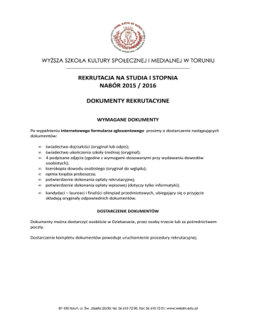 REKRUTACJA NA STUDIA I STOPNIA NABÓR 2015 / 2016 DOKUMENTY REKRUTACYJNE WYMAGANE DOKUMENTY Po wypełnieniu internetowego formularza zgłoszeniowego prosimy o dostarczenie następujących dokumentów: • • • • • • • • świadectwo dojrzałości (oryginał lub odpis); świadectwo ukończenia szkoły średniej (oryginał); 4 podpisane zdjęcia (zgodne z wymogami stosowanymi przy wydawaniu dowodów osobistych); kserokopia dowodu osobistego (oryginał do wglądu); opinia księdza proboszcza; potwierdzenie dokonania opłaty rekrutacyjnej; potwierdzenie dokonania opłaty wpisowej (dotyczy tylko informatyki); kandydaci – laureaci i finaliści olimpiad przedmiotowych, ubiegający się o przyjęcie składają oryginały odpowiednich dokumentów. DOSTARCZENIE DOKUMENTÓW Dokumenty można dostarczyć osobiście w Dziekanacie, przez osoby trzecie lub za pośrednictwem poczty. Dostarczenie kompletu dokumentów powoduje uruchomienie procedury rekrutacyjnej. DODATKOWE DOKUMENTY Dla kandydatów z maturami zagranicznymi • • tłumaczenie przysięgłe świadectwa; zaświadczenie o nostryfikacji. Dla kandydatów, którzy nie posiadają polskiego obywatelstwa • • kserokopia wizy lub karty pobytu albo innego dokumentu uprawniającego do pobytu na terytorium Polski oraz ich oryginał do wglądu w celu potwierdzenia zgodności (przed rozpoczęciem studiów); polisa ubezpieczeniowa na wypadek choroby lub następstw nieszczęśliwych wypadków na okres kształcenia w Polsce albo Europejską Kartę Ubezpieczenia Zdrowotnego lub deklarację przystąpienia do ubezpieczenia w Narodowym Funduszu Zdrowia.