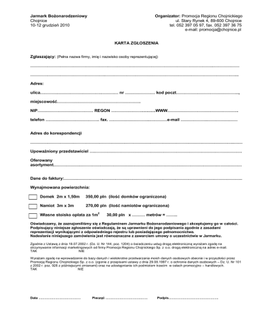 Jarmark Bożonarodzeniowy Chojnice 10-12 grudzień 2010 Organizator: Promocja Regionu Chojnickiego ul. Stary Rynek 4, 89-600 Chojnice tel. 052 397 05 97, fax. 052 397 36 75 e-mail: [email protected] KARTA ZGŁOSZENIA Zgłaszający: (Pełna nazwa firmy, imię i nazwisko osoby reprezentującej) ……………………………………………….………………………………………………………………..……………… ……………………………………………..…………………………………………………………………………….…... Adres: ulica…………………………………….………… nr ………………… kod poczt…………………………………….., miejscowość………………………………………………….. NIP………………………………… REGON …………………............WWW………………………………………….. telefon ……………………………….. fax. ………………………..…………e-mail ……………….………………… Adres do korespondencji ……………………………………………………………………………………………………………………………..…… Upoważniony przedstawiciel ….…………………………………………………………………………………………. Oferowany asortyment…………………………………………………………………………………………………………………… Dane do faktury:…………………………………………………………………………………………………………….. Wynajmowana powierzchnia: Domek 2m x 1,50m 350,00 pln (ilość domków ograniczona) Namiot 3m x 3m 270,00 pln (ilość namiotów ograniczona) 2 Własne stoisko opłata za 1m 30,00 pln x ……… metrów = …….. Oświadczamy, że zaznajomiliśmy się z Regulaminem Jarmarku Bożonarodzeniowego i akceptujemy go w całości. Podpisujący niniejsze zgłoszenie oświadczają, że są uprawnieni do jego podpisania zgodnie z zasadami reprezentacji wynikającymi z odpowiedniego rejestru lub posiadającego pełnomocnictwa. Nadesłanie niniejszego zamówienia jest równoznaczne z zawarciem umowy o uczestnictwie w Jarmarku. Zgodnie z Ustawą z dnia 18.07.2002 r. (Dz. U. Nr 144, poz. 1204) o świadczeniu usług drogą elektroniczną wyrażam zgodę na otrzymywanie informacji marketingowych od firmy Promocja Regionu Chojnickiego Sp. z o.o. drogą elektroniczną na adres e-mail. TAK NIE Wyrażam zgodę na wprowadzenie do bazy danych i wielokrotne przetwarzania moich danych osobowych obecnie i w przyszłości przez Promocję Regionu Chojnickiego Sp. z o.o. (zgonie z przepisami ustawy z dnia 29.08.1997 r. o ochronie danych osobowych – Dz. U. Nr 101 z 2002 r. poz. 926 z późniejszymi zmianami) oraz na udostępnianie ich podmiotom trzecim w celach promocyjno – handlowych. TAK NIE Data ………………………………. Pieczęć ………………………….…… Podpis……………………………………..