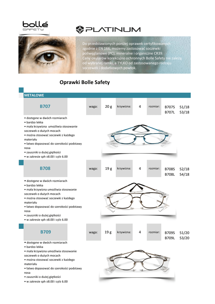 Do przedstawionych poniżej oprawek certyfikowanych zgodnie z EN 166, możemy zastosować soczewki poliwęglanowe (PC), mineralne i organiczne CR39. Ceny okularów korekcyjno ochronnych Bolle Safety nie zależą od wybranej ramki, a TYLKO od zastosowanego rodzaju soczewek i dodatkowych powłok. Oprawki Bolle Safety METALOWE B707 waga: 20 g krzywizna: 4 rozmiar: B707S B707L 51/18 53/18 waga: 19 g krzywizna: 4 rozmiar: B708S B708L 52/18 54/18 waga: 19 g krzywizna: 4 rozmiar: B709S B709L 51/20 53/20 • dostępne w dwóch rozmiarach • bardzo lekka • mała krzywizna umożliwia stosowanie soczewek o dużych mocach • można stosować soczewki z każdego materiału • łatwo dopasować do szerokości podstawy nosa • zauszniki o dużej giętkości • w zakresie sph ±8.00 i cyl± 6.00 B708 • dostępne w dwóch rozmiarach • bardzo lekka • mała krzywizna umożliwia stosowanie soczewek o dużych mocach • można stosować soczewki z każdego materiału • łatwo dopasować do szerokości podstawy nosa • zauszniki o dużej giętkości • w zakresie sph ±8.00 i cyl± 6.00 B709 • dostępne w dwóch rozmiarach • bardzo lekka • mała krzywizna umożliwia stosowanie soczewek o dużych mocach • można stosować soczewki z każdego materiału • łatwo dopasować do szerokości podstawy nosa • zauszniki o dużej giętkości • w zakresie sph ±8.00 i cyl± 6.00 B710 waga: 17 g krzywizna: 4 rozmiar: B710S B710L 50/19 52/19 waga: 18 g krzywizna: 4 rozmiar: B711 48/21 waga: 31 g krzywizna: 4 rozmiar: B712S B712L 52/14 54/14 waga: 30 g krzywizna: 4 rozmiar: • dostępne w dwóch rozmiarach • bardzo lekka • mała krzywizna umożliwia stosowanie soczewek o dużych mocach • można stosować soczewki z każdego materiału • łatwo dopasować do szerokości podstawy nosa • zauszniki o dużej giętkości • w zakresie sph ±8.00 i cyl± 6.00 B711 • bardzo lekka • mała krzywizna umożliwia stosowanie soczewek o dużych mocach • można stosować soczewki z każdego materiału • łatwo dopasować do szerokości podstawy nosa • zauszniki o dużej giętkości • zauszniki płasko przylegają do skroni • doskonałe do stosowania pod ochronne gogle • w zakresie sph ±8.00 i cyl± 6.00 B712 • bardzo lekka • mała krzywizna umożliwia stosowanie soczewek o dużych mocach • można stosować soczewki z PC i CR39 • łatwo dopasować do szerokości podstawy nosa • zauszniki o dużej giętkości dostępne z przeźroczystymi lub przyciemnianymi osłonami bocznymi • w zakresie sph ±8.00 i cyl± 6.00 B806 ALU • mała krzywizna umożliwia stosowanie soczewek o dużych mocach • można stosować soczewki z PC i CR39 zauszniki o dużej giętkości • ramka wykonana z aluminium dostępna również jako wykonana z plastiku • w zakresie sph ±8.00 i cyl± 6.00 B806 ALU 54/17 PLASTIKOWE B806 waga: 24 g krzywizna: 4 rozmiar: B806S B806L 52/17 54/17 waga: 25 g krzywizna: 4 rozmiar: B805 50/18 waga: 31 g krzywizna: 6 rozmiar: B807 57/17 waga: 20 g krzywizna: 4 rozmiar: B808S B808L 48/17 54/17 • mała krzywizna umożliwia stosowanie soczewek o dużych mocach • można stosować soczewki z PC i CR39 • zauszniki o dużej giętkości dostępne z przeźroczystymi lub przyciemnionymi osłonami bocznymi • w zakresie sph ±8.00 i cyl± 6.00 B805 • mała krzywizna umożliwia stosowanie soczewek o dużych mocach • można stosować soczewki z PC i CR39 • zauszniki o dużej giętkości • doskonała ochrona od góry i od dołu • w zakresie sph ±8.00 i cyl± 6.00 B807 • można stosować soczewki z PC i CR39 • dobrze trzymające się zauszniki o dużej giętkości • górna i dolna ochrona • w zakresie sph ±4.00 i cyl± 3.00 B808 • mała krzywizna umożliwia stosowanie soczewek o dużych mocach • można stosować soczewki z PC i CR39 występuje w 2 rozmiarach i kolorach (grafit i czerwony) • model bez śruby - pozwala na szerokie zastosowanie w przemyśle spożywczym i rolnictwie • doskonałe rozwiazanie dla hutników - brak elementów metalowych - okulary równomiernie się nagrzewają i stygną • w zakresie sph ±8.00 i cyl± 6.00 PREMIUM waga: 26 g krzywizna: 6 rozmiar: PREN 60/20 waga: 19 g krzywizna: 6 rozmiar: MACN 53/18 waga: 30 g krzywizna: 6 rozmiar: SLIDN 57/21 waga: 30 g krzywizna: 6 rozmiar: URBN 57/21 • można stosować soczewki z PC i CR39 • bardzo duży rozmiar ramki (szeroki rozstaw oczu, duża głowa) • obejmujący kształt • doskonała ochrona z każdej strony • duże szkła • zauszniki zintegrowane z ochroną boczną • w zakresie sph ±4.00 i cyl± 3.00 MACRO • można stosować soczewki z PC i CR39 • obejmujący kształt • doskonała ochrona z każdej strony • duże szkła zauszniki umożliwiają zmianę kąta soczewek • zauszniki zintegrowane z ochroną boczną • w zakresie sph ±6.00 i cyl± 3.00 SLIDE • można stosować soczewki z PC i CR39 • obejmujący kształt • doskonała ochrona z każdej strony • zauszniki integrowane z ochroną boczną • zauszniki wykonane z 2 rodzajów materiału doskonale utrzymują okulary na swoim miejscu • w zakresie sph ±6.00 i cyl± 3.00 URBAN • można stosować soczewki z PC i CR39 • obejmujący kształt • doskonała ochrona z każdej strony • zauszniki integrowane z ochroną boczną • zauszniki wykonane z 2 rodzajów materiału doskonale utrzymują okulary na swoim miejscu • w zakresie sph ±6.00 i cyl± 3.00 BOSS waga: 19 g krzywizna: 6 rozmiar: BOSSN 55/21 • bardzo lekki model • można stosować soczewki z PC i CR39 • obejmujący kształt • doskonała ochrona z każdej strony • zauszniki integrowane z ochroną boczną • zauszniki wykonane z 2 rodzajów materiału doskonale utrzymują okulary na swoim miejscu • w zakresie sph ±4.00 i cyl± 3.00 Okulary korekcyjno-ochronne do pracy na wysokości, do pracy w trudnych warunkach (zagrożenia szkodliwym pyłami, cieczami i gazami). Ze względu na dużą szczelność ramek, zal