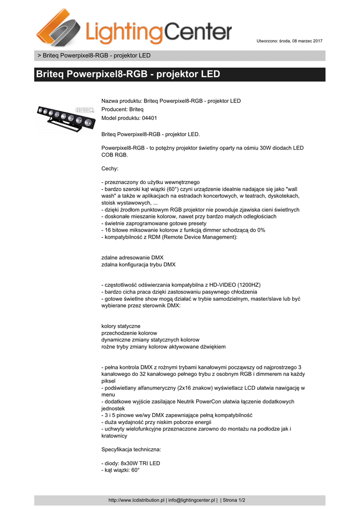 Utworzono: środa, 08 marzec 2017 > Briteq Powerpixel8-RGB - projektor LED Briteq Powerpixel8-RGB - projektor LED Nazwa produktu: Briteq Powerpixel8-RGB - projektor LED Producent: Briteq Model produktu: 04401 Briteq Powerpixel8-RGB - projektor LED. Powerpixel8-RGB - to potężny projektor świetlny oparty na ośmiu 30W diodach LED COB RGB. Cechy: - przeznaczony do użytku wewnętrznego - bardzo szeroki kąt wiązki (60°) czyni urządzenie idealnie nadające się jako "wall wash" a także w aplikacjach na estradach koncertowych, w teatrach, dyskotekach, stoisk wystawowych, ... - dzięki źrodłom punktowym RGB projektor nie powoduje zjawiska cieni świetlnych - doskonałe mieszanie kolorow, nawet przy bardzo małych odległościach - świetnie zaprogramowane gotowe presety - 16 bitowe miksowanie kolorow z funkcją dimmer schodzącą do 0% - kompatybilność z RDM (Remote Device Management): zdalne adresowanie DMX zdalna konfiguracja trybu DMX - częstotliwość odświerzania kompatybilna z HD-VIDEO (1200HZ) - bardzo cicha praca dzięki zastosowaniu pasywnego chłodzenia - gotowe świetlne show mogą działać w trybie samodzielnym, master/slave lub być wybierane przez sterownik DMX: kolory statyczne przechodzenie kolorow dynamiczne zmiany statycznych kolorow rożne tryby zmiany kolorow aktywowane dżwiękiem - pełna kontrola DMX z rożnymi trybami kanałowymi począwszy od najprostrzego 3 kanałowego do 32 kanałowego pełnego trybu z osobnym RGB i dimmerem na każdy piksel - podświetlany alfanumeryczny (2x16 znakow) wyświetlacz LCD ułatwia nawigację w menu - dodatkowe wyjście zasilające Neutrik PowerCon ułatwia łączenie dodatkowych jednostek - 3 i 5 pinowe we/wy DMX zapewniające pełną kompatybilność - duża wydajność przy niskim poborze energii - uchwyty wielofunkcyjne przeznaczone zarowno do montażu na podłodze jak i kratownicy Specyfikacja techniczna: - diody: 8x30W TRI LED - kąt wiązki: 60° http://www.lcdistribution.pl | [email protected] | | Strona 1/2 Utworzono: środa, 08 marzec 2017 > Briteq Powerpixel8-RGB - projektor LED Briteq Powerpixel8-RGB - projektor LED - pobor mocy: 240W - zasilanie: AC 100V-250V, 60Hz-50Hz - bezpiecznik: F3A, 250V - kontrola DMX: 3/4/5/6/12/15/16/32 kanałowa - tryb master/slave - częstotliwość odświeżania diod LED: 1200Hz - wyświetlacz LCD (mode, setup, up, down) - wymiary: 880x60x170 mm - waga: 7,9 kg http://www.lcdistribution.pl | [email protected] | | Strona 2/2
