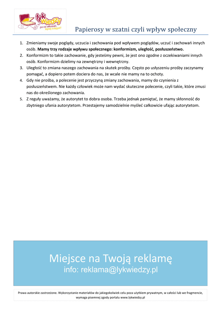 Papierosy w szatni czyli wpływ społeczny 1. Zmieniamy swoje poglądy, uczucia i zachowania pod wpływem poglądów, uczud i zachowao innych osób. Mamy trzy rodzaje wpływu społecznego: konformizm, uległość, posłuszeostwo. 2. Konformizm to takie zachowanie, gdy jesteśmy pewni, że jest ono zgodne z oczekiwaniami innych osób. Konformizm dzielimy na zewnętrzny i wewnętrzny. 3. Uległośd to zmiana naszego zachowania na skutek prośby. Często po usłyszeniu prośby zaczynamy pomagad, a dopiero potem dociera do nas, że wcale nie mamy na to ochoty. 4. Gdy nie prośba, a polecenie jest przyczyną zmiany zachowania, mamy do czynienia z posłuszeostwem. Nie każdy człowiek może nam wydad skuteczne polecenie, czyli takie, które zmusi nas do określonego zachowania. 5. Z reguły uważamy, że autorytet to dobra osoba. Trzeba jednak pamiętad, że mamy skłonnośd do zbytniego ufania autorytetom. Przestajemy samodzielnie myśled całkowicie ufając autorytetom. Prawa autorskie zastrzeżone. Wykorzystanie materiałów do jakiegokolwiek celu poza użytkiem prywatnym, w całości lub we fragmencie, wymaga pisemnej zgody portalu www.lykwiedzy.pl