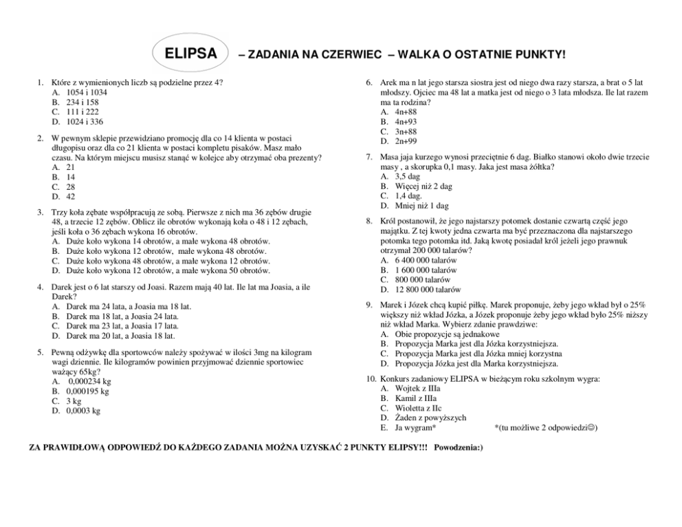 ELIPSA – ZADANIA NA CZERWIEC – WALKA O OSTATNIE PUNKTY! 1. Które z wymienionych liczb są podzielne przez 4? A. 1054 i 1034 B. 234 i 158 C. 111 i 222 D. 1024 i 336 2. W pewnym sklepie przewidziano promocję dla co 14 klienta w postaci długopisu oraz dla co 21 klienta w postaci kompletu pisaków. Masz mało czasu. Na którym miejscu musisz stanąć w kolejce aby otrzymać oba prezenty? A. 21 B. 14 C. 28 D. 42 3. Trzy koła zębate współpracują ze sobą. Pierwsze z nich ma 36 zębów drugie 48, a trzecie 12 zębów. Oblicz ile obrotów wykonają koła o 48 i 12 zębach, jeśli koła o 36 zębach wykona 16 obrotów. A. Duże koło wykona 14 obrotów, a małe wykona 48 obrotów. B. Duże koło wykona 12 obrotów, małe wykona 48 obrotów. C. Duże koło wykona 48 obrotów, a małe wykona 12 obrotów. D. Duże koło wykona 12 obrotów, a małe wykona 50 obrotów. 4. Darek jest o 6 lat starszy od Joasi. Razem mają 40 lat. Ile lat ma Joasia, a ile Darek? A. Darek ma 24 lata, a Joasia ma 18 lat. B. Darek ma 18 lat, a Joasia 24 lata. C. Darek ma 23 lat, a Joasia 17 lata. D. Darek ma 20 lat, a Joasia 18 lat. 5. Pewną odżywkę dla sportowców należy spożywać w ilości 3mg na kilogram wagi dziennie. Ile kilogramów powinien przyjmować dziennie sportowiec ważący 65kg? A. 0,000234 kg B. 0,000195 kg C. 3 kg D. 0,0003 kg 6. Arek ma n lat jego starsza siostra jest od niego dwa razy starsza, a brat o 5 lat młodszy. Ojciec ma 48 lat a matka jest od niego o 3 lata młodsza. Ile lat razem ma ta rodzina? A. 4n+88 B. 4n+93 C. 3n+88 D. 2n+99 7. Masa jaja kurzego wynosi przeciętnie 6 dag. Białko stanowi około dwie trzecie masy , a skorupka 0,1 masy. Jaka jest masa żółtka? A. 3,5 dag B. Więcej niż 2 dag C. 1,4 dag. D. Mniej niż 1 dag 8. Król postanowił, że jego najstarszy potomek dostanie czwartą część jego majątku. Z tej kwoty jedna czwarta ma być przeznaczona dla najstarszego potomka tego potomka itd. Jaką kwotę posiadał król jeżeli jego prawnuk otrzymał 200 000 talarów? A. 6 400 000 talarów B. 1 600 000 talarów C. 800 000 talarów D. 12 800 000 talarów 9. Marek i Józek chcą kupić piłkę. Marek proponuje, żeby jego wkład był o 25% większy niż wkład Józka, a Józek proponuje żeby jego wkład było 25% niższy niż wkład Marka. Wybierz zdanie prawdziwe: A. Obie propozycje są jednakowe B. Propozycja Marka jest dla Józka korzystniejsza. C. Propozycja Marka jest dla Józka mniej korzystna D. Propozycja Józka jest dla Marka korzystniejsza. 10. Konkurs zadaniowy ELIPSA w bieżącym roku szkolnym wygra: A. Wojtek z IIIa B. Kamil z IIIa C. Wioletta z IIc D. Żaden z powyższych E. Ja wygram* *(tu możliwe 2 odpowiedzi☺) ZA PRAWIDŁOWĄ ODPOWIEDŹ DO KAŻDEGO ZADANIA MOŻNA UZYSKAĆ 2 PUNKTY ELIPSY!!! Powodzenia:)