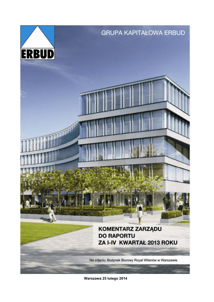 Warszawa 25 lutego 2014 SPIS TREŚCI I. GŁÓWNE DANE FINANSOWE GRUPY ERBUD w I-IV KW. 2013 r. oraz ISTOTNE ZDARZENIA I CZYNNIKI RYNKOWE MAJĄCE WPŁYW NA WYNIKI FINANSOWE . - 3 II. CZYNNIKI ZEWNĘTRZNE I WEWNĘTRZNE ISTOTNE DLA ROZWOJU GRUPY ERBUD............................................................................................................. - 5 1. CZYNNIKI ZEWNĘTRZNE ............................................................................... - 5 1.1. Otoczenie makroekonomiczne ............................................................................................... - 5 1.2. Rynek budowlany ................................................................................................................... - 5 - 2. CZYNNIKI WEWNĘTRZNE ............................................................................. - 5 2.1. Budownictwo kubaturowe w kraju i za granicą ...................................................................... - 6 2.2. Pozostałe segmenty działalności w Grupie............................................................................. - 7 2.3. Przychody i koszty operacyjne................................................................................................ - 8 - 3. PERSPEKTYWY ............................................................................................. - 8 3.1. Otoczenie makroekonomiczne ............................................................................................... - 8 3.2. Rynek budowlany ................................................................................................................... - 8 3.3. Kierunki i cele rozwoju Grupy................................................................................................. - 8 - III. WYNIKI FINANSOWE................................................................................. - 10 1. SPÓŁKI WCHODZĄCE W SKŁAD GRUPY ERBUD ........................................... - 10 2. RACHUNEK ZYSKÓW I STRAT GRUPY………………………………………………………….-103. BILANS GRUPY ERBUD……………………………………………………………………………….- 104. PRZEPŁYWY ŚRODKÓW PIENIĘŻNYCH GRUPY ERBUD ................................. - 12 5. WYBRANE WSKAŹNIKI FINANSOWE ........................................................... - 12 - 2 GRUPA ERBUD KOMENTARZ ZARZĄDU DO RAPORTU ZA I-IV KWARTAŁ 2013 ROKU W IV kw. 2013 r.: PRZYCHODY: 400 517 tys. zł EBITDA: 13 682 tys. zł EBIT: 11 749 tys. zł ZYSK NETTO: 7 794 tys. zł W I-IV kw. 2013 r.: PRZYCHODY: 1 225 103 tys. zł EBITDA: 39 729 tys. zł EBIT: 32 427 tys. zł ZYSK NETTO: 18 373 tys. zł GOTÓWKA: 124 591 tys. zł NADWYŻKA ŚRODKÓW PIENIĘŻNYCH NAD ZOBOWIĄZANIAMI ODSETKOWYMI: 30 241 tys. zł Poniższe dane finansowe za okres I-IV kwartału 2013 roku i porównania są oparte o skonsolidowane wyniki finansowe Grupy Kapitałowej. Kontrakty prezentowane poniżej są wyrażone w wartościach netto. I. GŁÓWNE DANE FINANSOWE GRUPY ERBUD w I-IV KW. 2013 r. oraz ISTOTNE ZDARZENIA I CZYNNIKI RYNKOWE MAJĄCE WPŁYW NA WYNIKI FINANSOWE OTOCZENIE RYNKOWE • Spadek produkcji budowlano-montażowej w Polsce w okresie I-IV kw. 2013 r.: 12% spadku r/r. • W grudniu 2013 r. produkcja budowlano-montażowa wzrosła o 5,8% r/r. Dla porównania w grudniu 2012 r. produkcja budowlano-montażowa odnotowała spadek o 24,9%. Wzrost odnotowano w segmencie budownictwa inżynieryjnego (+11,2% r/r), budownictwa specjalistycznego (+3,7% r/r) oraz w segmencie wznoszenie budynków (+ 1% r/r). GRUPA ERBUD • W okresie październik - grudzień 2013 r. Grupa podpisała w sumie 19 kontraktów na łączną kwotę 366 927 tys. zł wobec 15 kontraktów o łącznej wartości 409 595 tys. zł w analogicznym okresie 2012 r. W całym 2013 r. Grupa podpisała 99 kontraktów na kwotę 1 350 000 tys. zł, wobec 103 kontraktów na kwotę 1 439 898 tys. zł w analogicznym okresie 2012 r. Grupa ERBUD Komentarz Zarządu do raportu za I-IV kwartał 2013 roku W IV kw. 2013 r. sprzedaż w Grupie Budlex wyniosła 51 mieszkań i lokali użytkowych (w oparciu o akty notarialne) wobec 102 w IV kw. 2012 r. Narastająco Grupa sprzedała 184 mieszkania i lokale użytkowe wobec 220 w analogicznym okresie 2012 r. W przedsprzedaży na lata 2014-2015 r. Budlex zawarł umowy przedwstępne na 111 mieszkań i lokali użytkowych na kwotę ok. 31 mln zł wobec 142 mieszkań i lokali na koniec grudnia 2012 r. • W IV kw. 2013 r. przychody Grupy Erbud spadły o 4,3% r/r do 400 517 tys. zł z poziomu 418 674 tys. zł w IV kw. 2012 r. Pozytywny wpływ na sprzedaż Grupy miał segment inżynieryjno-drogowy, który przyśpieszył w IV kw. i wzrósł o 93% r/r, a także segment energetyczny, który zanotował 142% wzrostu przychodów r/r. Segment kubaturowy obniżył sprzedaż w IV kw. 2013 r. o 12,5%, zaś segment deweloperski o 53% r/r. • Narastająco w 2013 r. Grupa miała 1 225 103 tys. zł przychodów, tj. 11,5% spadku r/r, pochodna niższej sprzedaży w segmencie kubaturowym w kraju (o 19% r/r) i mniejszych przerobów w segmencie inżynieryjnym, który w całym roku zanotował spadek o 32,5% r/r. • W IV kw. 2013 r. EBIT Grupy wyniósł 11 749 tys. zł wobec 5 871 tys. zł w IV kw. 2012 r. tj. wzrost o 100,1% r/r. Marża EBIT wyniosła 2,9% wobec 1,4% w IV kw. 2012 r. W IV kw. 2013 r. wszystkie segmenty miały dodatni wpływ na EBIT Grupy. • Narastająco w 2013 r. Grupa osiągnęła EBIT w wysokości 32 427 tys. zł wobec 29 413 tys. zł w 2012 r., tj. 10,25% wzrostu r/r. Marża EBIT w 2013 r. wyniosła 2,7% wobec 2,1% w analogicznym okresie 2012 r. Segment kubaturowy dodał 20,1 mln zł do skonsolidowanego wyniku Grupy, zaś segment deweloperski i inżynieryjno-drogowy odpowiednio 4,5 mln zł i 4,9 mln zł do skonsolidowanego EBIT Grupy. Segment energetyczny dodał 2,8 mln zł do wyniku EBIT Grupy w 2013 r. • Zysk netto Grupy w IV kw. 2013 r. wyniósł 7 794 tys. zł, tj. wzrost o 39% r/r