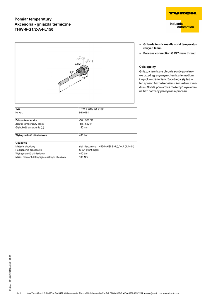 Pomiar temperatury Akcesoria - gniazda termiczne THW-6-G1/2-A4-L150 ■ Gniazda termiczne dla sond temperaturowych 6 mm ■ Process connection G1/2" male thread Opis ogólny Gniazda termiczne chronią sondy pomiarowe przed agresywnym chemicznie medium i wysokim ciśnieniem. Zapobiega się też w ten sposób bezpośredniemu kontaktowi z medium. Sonda pomiarowa może być wymieniana bez potrzeby przerywania procesu. THW-6-G1/2-A4-L150 9910461 Zakres temperatur Zakres temperatury pracy Głębokość zanurzenia (L) -50…350 °C -58…662°F 150 mm Wytrzymałość ciśnieniowa 400 bar Obudowa Materiał obudowy Podłączenie procesowe Wytrzymałość ciśnieniowa Maks. moment dokręcający nakrętki obudowy stal nierdzewna 1.4404 (AISI 316L), V4A (1.4404) G ½″, gwint męski 400 bar 100 Nm Edition • 2016-02-20T08:40:42+01:00 Typ Nr kat. 1/1 Hans Turck GmbH & Co.KG ñ D-45472 Mülheim an der Ruhr ñ Witzlebenstraße 7 ñ Tel. 0208 4952-0 ñ Fax 0208 4952-264 ñ [email protected] ñ www.turck.com