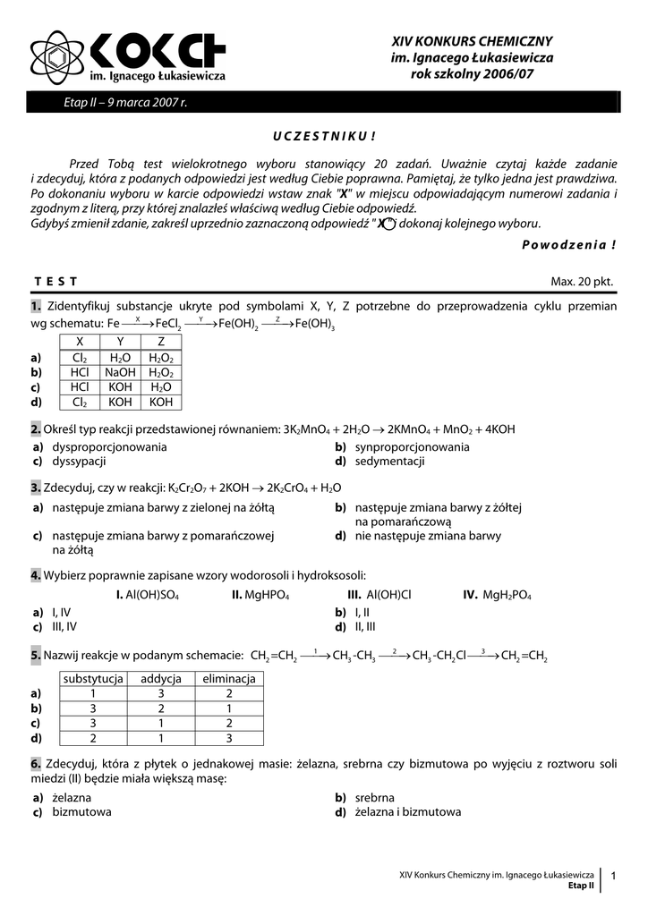 XIV KONKURS CHEMICZNY im. Ignacego Łukasiewicza rok szkolny 2006/07 WERSJA A Etap II – 9 marca 2007 r. UCZESTNIKU ! Przed Tobą test wielokrotnego wyboru stanowiący 20 zadań. Uważnie czytaj każde zadanie i zdecyduj, która z podanych odpowiedzi jest według Ciebie poprawna. Pamiętaj, że tylko jedna jest prawdziwa. Po dokonaniu wyboru w karcie odpowiedzi wstaw znak "X" w miejscu odpowiadającym numerowi zadania i zgodnym z literą, przy której znalazłeś właściwą według Ciebie odpowiedź. Gdybyś zmienił zdanie, zakreśl uprzednio zaznaczoną odpowiedź " X " i dokonaj kolejnego wyboru. Powodzenia ! Max. 20 pkt. T ES T 1. Zidentyfikuj substancje ukryte pod symbolami X, Y, Z potrzebne do przeprowadzenia cyklu przemian X Y Z wg schematu: Fe → FeCl2 → Fe(OH)2 → Fe(OH)3 X Y Z Cl2 H 2 O H 2 O2 a) HCl NaOH H2O2 b) HCl KOH H2O c) Cl2 KOH KOH d) 2. Określ typ reakcji przedstawionej równaniem: 3K2MnO4 + 2H2O → 2KMnO4 + MnO2 + 4KOH a) dysproporcjonowania b) synproporcjonowania dyssypacji c) d) sedymentacji 3. Zdecyduj, czy w reakcji: K2Cr2O7 + 2KOH → 2K2CrO4 + H2O a) następuje zmiana barwy z zielonej na żółtą c) następuje zmiana barwy z pomarańczowej na żółtą b) następuje zmiana barwy z żółtej na pomarańczową d) nie następuje zmiana barwy 4. Wybierz poprawnie zapisane wzory wodorosoli i hydroksosoli: I. Al(OH)SO4 II. MgHPO4 a) I, IV c) III, IV III. Al(OH)Cl b) I, II d) II, III IV. MgH2PO4 1 2 3 5. Nazwij reakcje w podanym schemacie: CH2 =CH2 → CH3 -CH3 → CH3 -CH2 Cl → CH2 =CH2 a) b) c) d) substytucja 1 3 3 2 addycja 3 2 1 1 eliminacja 2 1 2 3 6. Zdecyduj, która z płytek o jednakowej masie: żelazna, srebrna czy bizmutowa po wyjęciu z roztworu soli miedzi (II) będzie miała większą masę: a) żelazna c) bizmutowa b) srebrna d) żelazna i bizmutowa XIV Konkurs Chemiczny im. Ignacego Łukasiewicza Etap II 1 7. Rozróżnij, w których probówkach wytrąci się osad: AgNO3 I H2SO4 II HCl a) I, II, III ZnCl2 BaCl2 III Na2SO4 b) I, III, IV CuSO4 IV Cu V NaOH c) II, V HNO3 d) IV, V 8. Zdecyduj, który uczeń postępował prawidłowo celem zbadania, czy chlorek amonowy ulega hydrolizie: - Andrzej podgrzał chlorek amonowy, Robert dodał do chlorku amonowego zasady i badał zapach, Krzysztof trzymał wilgotny papierek lakmusowy nad probówką z chlorkiem amonowym, Marcin dodał do chlorku amonowego wody i zanurzył uniwersalny papierek wskaźnikowy. a) Krzysztof b) Andrzej c) Marcin d) Robert 9. Zinterpretuj zapis uproszczony: 238 U (α , n ) 241 Pu: a) Izotop uranu– 238 ulega samorzutnemu rozpadowi tworząc izotop plutonu – 241 i emitując jądra helu c) Izotop uranu – 92 ulega fuzji z jądrami helu tworząc izotop plutonu – 94 i emitując neutrony b) Izotop uranu– 238 ulega reakcji jądrowej z jądrami helu tworząc izotop plutonu – 241 i emitując neutrony d) Izotop uranu – 238 ulega wymuszonemu rozpadowi tworząc izotop plutonu – 241 i emitując promieniowanie neutronowe 10. Nazwij pierwiastek, który tworzy fioletowo czarne kryształy, a ze skrobią tworzy związek o ciemnoniebieskim zabarwieniu: a) jod b) brom c) fluor d) chlor 11. Dobierz barwę płomienia palnika do spalanego jonu: I – bar II – potas III – sód X – zielony Y – fiołkowy Z –pomarańczowoczerwony a) I – X, II – Y, III – Z c) I – Z, II – Y, III – X b) I – Y, II – Z, III – X d) I – X, II – Z, III – Y 12. Ustal wzór katalizatora oraz wzór produktu przejściowego dla pewnej reakcji przebiegającej w dwóch etapach: I etap: 2 Al + 3 I2 → 2 AlI3 II etap: 4 AlI3 + 3 O2 → 2 Al2 O3 + 6 I2 a) katalizator – I2, produkt przejściowy – AlI3 c) katalizator – O2, produkt przejściowy - I2 b) katalizator – AlI3, produkt przejściowy – I2 d) katalizator – O2, produkt przejściowy – AlI3 13. Określ substancje ukryte pod symbolami X, Y, Z w podanym chemografie: Cu(OH)2 CuO CaO C2H5OH → X → Y →Z a) b) c) d) X CH3CHO C 2H 4 CH3CHO CH3COOH Y Z CH3COOH CH3COOCa CH3CHO CH3COOH CH3COOH (CH3COO)2Ca CH3COOCu CH3CHO 14. Nazwij charakterystyczną reakcję zachodzącą podczas kontaktu kwasu azotowego (V) z białkiem: a) biuretowa b) ksantoproteinowa c) denaturacja d) koagulacja XIV Konkurs Chemiczny im. Ignacego Łukasiewicza Etap II 2 15. Określ stan skupienia podanych w tabeli związków w warunkach normalnych. Właściwości fizyczne T topnienia [OC] T wrzenia [OC] fenol 41 182 a) fenol – ciecz; formaldehyd – gaz; aceton - ciecz c) fenol – ciecz; formaldehyd – gaz; aceton – ciało stałe formaldehyd -92 -21 aceton -95 56,3 b) fenol – ciało stałe; formaldehyd – gaz; aceton – ciecz d) fenol – ciało stałe; formaldehyd – ciecz; aceton - gaz 16. Wybierz spośród tlenków azotu te o właściwościach kwasotwórczych: a) N2O3, N2O5 b) N2O3, NO2, N2O5 c) N2O, NO, N2O5 d) N2O, NO 17. Dokończ zdanie: „Emisja jednego elektronu z jądra atomowego powoduje...”. a) zmniejszenie liczby nukleonów o jeden b) zmniejszenie liczby neutronów o jeden i zwiększenie liczby protonów o jeden d) zwiększenie liczby neutronów o jeden i zmniejszenie liczby protonów o jeden c) zwiększenie liczby nukleonów o jeden i zmniejszenie liczby elektronów o jeden 18. Wskaż probówkę, w której nastąpi odbarwienie roztworu nadmanganianu potasu: K2SO4 Na2SO3 H2O2 KOH KMnO4 + KOH a) KMnO4 + H2SO4 b) KMnO4 + H2O c) KMnO4 + H2O d) 19. Zdecyduj, jaki izotop stanowi szósty człon w szeregu: 219Rn, 215Po, 215At, 211Bi, 211Po. a) 207 Pb b) 211 At c) 207 At d) 215 Rn 20. Określ właściwą zależność wartości stałych dysocjacji dla kolejnych etapów dysocjacji w przypadku kwasu trójhydronowego: a) K3 > K2 > K1 b) K1 > K2 > K3 c) są jednakowe d) K2 > K1 > K3 UCZESTNIKU ! Przed Tobą 2 zadania otwarte. Rozwiąż je stosując zasady matematyki, właściwe prawa chemiczne, wyeksponuj przeliczanie jednostek i uwzględnij komentarz pisemny. Każde zadanie winno znaleźć rozwiązanie na odpowiednich stronach (obliczenia pomocnicze 