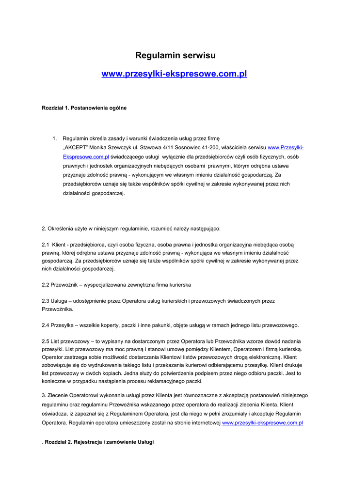 Regulamin serwisu www.przesylki-ekspresowe.com.pl Rozdział 1. Postanowienia ogólne 1. Regulamin określa zasady i warunki świadczenia usług przez firmę „AKCEPT” Monika Szewczyk ul. Stawowa 4/11 Sosnowiec 41-200, właściciela serwisu www.PrzesylkiEkspresowe.com.pl świadczącego usługi wyłącznie dla przedsiębiorców czyli osób fizycznych, osób prawnych i jednostek organizacyjnych niebędących osobami prawnymi, którym odrębna ustawa przyznaje zdolność prawną - wykonującym we własnym imieniu działalność gospodarczą. Za przedsiębiorców uznaje się także wspólników spółki cywilnej w zakresie wykonywanej przez nich działalności gospodarczej. 2. Określenia użyte w niniejszym regulaminie, rozumieć należy następująco: 2.1 Klient - przedsiębiorca, czyli osoba fizyczna, osoba prawna i jednostka organizacyjna niebędąca osobą prawną, której odrębna ustawa przyznaje zdolność prawną - wykonująca we własnym imieniu działalność gospodarczą. Za przedsiębiorców uznaje się także wspólników spółki cywilnej w zakresie wykonywanej przez nich działalności gospodarczej. 2.2 Przewoźnik – wyspecjalizowana zewnętrzna firma kurierska 2.3 Usługa – udostępnienie przez Operatora usług kurierskich i przewozowych świadczonych przez Przewoźnika. 2.4 Przesyłka – wszelkie koperty, paczki i inne pakunki, objęte usługą w ramach jednego listu przewozowego. 2.5 List przewozowy – to wypisany na dostarczonym przez Operatora lub Przewoźnika wzorze dowód nadania przesyłki. List przewozowy ma moc prawną i stanowi umowę pomiędzy Klientem, Operatorem i firmą kurierską. Operator zastrzega sobie możliwość dostarczania Klientowi listów przewozowych drogą elektroniczną. Klient zobowiązuje się do wydrukowania takiego listu i przekazania kurierowi odbierającemu przesyłkę. Klient drukuje list przewozowy w dwóch kopiach. Jedna służy do potwierdzenia podpisem przez niego odbioru paczki. Jest to konieczne w przypadku nastąpienia procesu reklamacyjnego paczki. 3. Zlecenie Operatorowi wykonania usługi przez Klienta jest równoznaczne z akceptacją postanowień niniejszego regulaminu oraz regulaminu Przewoźnika wskazanego przez operatora do realizacji zlecenia Klienta. Klient oświadcza, iż zapoznał się z Regulaminem Operatora, jest dla niego w pełni zrozumiały i akceptuje Regulamin Operatora. Regulamin operatora umieszczony został na stronie internetowej www.przesyłki-ekspresowe.com.pl . Rozdział 2. Rejestracja i zamówienie Usługi 4. Operator w ramach Usługi zobowiązuje się do udostępnienia Klientom usług kurierskich i przewozowych świadczonych przez Przewoźników. 5. Usługa świadczona jest poprzez stronę www.Przesylki-Ekspresowe.com.pl lub w innej formie uzgodnionej z Operatorem. 6. W celu zlecenia realizacji należy wypełnić druk zlecenia na stronie www.Przesylki-Ekspresowe.com.pl w zakładce ,,Zamów Kuriera ‘’. 6.1 Dopuszcza się złożenie zlecenia poprzez wysłanie e-maila na adres: [email protected]. Wiadomość taka powinna zawierać wszystkie informacje zawarte w formularzu „Zamawianie kuriera”, a w szczególności: pełne dane nadawcy i odbiorcy przesyłki, rodzaj przesyłki i wariant usługi, ilość, wymiary i waga paczek, data i godziny możliwego odbioru przesyłki, klauzulę z informacją o akceptacji regulaminu Operatora. W celu właściwej weryfikacji Klienta e-mail powinien być wysłany z adresu podanego podczas rejestracji. Operator zastrzega sobie prawo do nierealizowania usług zleconych z adresów trzecich. 7. Minimalny przedział godzinowy do odbioru przesyłki wynosi 3 godziny. 8. Klient zobowiązuje się do rzetelnego i zgodnego ze stanem faktycznym informowania o zawartości, wymiarach i wadze przesyłki, a także do starannego zapakowania przesyłki, uniemożliwiającego zniszczenie zawartości oraz innych paczek przewożonych przez kuriera. 8.1 Wytyczne dotyczące prawidłowego pakowania zamieszczone są na stronie www.PrzesylkiEkspresowe.com.pl w zakładce ,,pakowanie’’ 9. Klient może zlecać realizację usługi poprzez witrynę www.Przesylki-Ekspresowe.com.pl przez całą dobę, 7 dni w tygodniu. Zlecenia otrzymane przez Operatora po godzinie10:00 oraz w soboty, niedziele i dni wolne od pracy będą przekazywane do realizacji następnego dnia roboczego. Rozdział 3. Realizacja Usługi 10. Po otrzymaniu zamówienia od Klienta, Operator wysyła zlecenie realizacji usługi do właściwego oddziału Przewoźnika. 11. Po dokonaniu zamówienia Usługi, Klient jest zobowiązany do wydrukowania przesłanych dokumentów i oznaczenia przesyłki poprzez trwałe naklejenie listu przewozowego. 12. W razie wysyłania kilku paczek do jednego odbiorcy Klient zobowiązany jest do wydrukowania lub wypisania oddzielnego listu przewozowego na każdą z paczek. Niedostosowanie się do tego wymogu spowoduje naliczenie opłaty manipulacyjnej zgodnie z obowiązującym cennikiem. 13. Ponowne wykorzystanie tego samego listu przewozowego do nadania kolejnych paczek, spowoduje naliczenie kary umownej określonej w cenniku odpowiedniego Przewoźnika. 14. W przypadku nadania przesyłek "za pobraniem" (COD) Operator zobowiązuje się przekazać Klientowi sumę pobrania na rachunek bankowy wskazany przez Klienta, niezwłocznie po jej otrzymaniu od Przewoźnika. W przypadku nie zwrócenia sumy pobrań do 14 dni roboczych od dostarczenia przesyłki odbiorcy, klient zobowiązany jest poinformować Operatora o zaistniałej sytuacji. Rozdział 4. Odpowiedzialność Operatora i postępowanie reklamacyjne 15. Operator ponosi odpowiedzialność za prawidłowe przekazanie zlecenie Przewoźnikowi 16. Przekazanie zlecenia Przewoźnikowi nie gwarantuje jego przyjęcia do realizacji. W miarę możliwości o odmowie przyjęcia zlecenia Klient będzie informowany poprzez e-mail. 17. Reklamacje należy zgłaszać w formie elektronicznej poprzez e-mail na adres [email protected] lub pocztą na adres pocztowy Operatora.