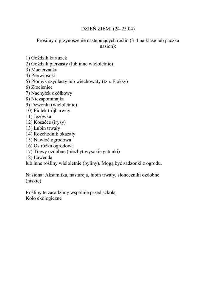 DZIEŃ ZIEMI (24-25.04) Prosimy o przynoszenie następujących roślin (3-4 na klasę lub paczka nasion): 1) Goździk kartuzek 2) Goździk pierzasty (lub inne wieloletnie) 3) Macierzanka 4) Pierwiosnki 5) Płomyk szydlasty lub wiechowaty (tzn. Floksy) 6) Złocieniec 7) Nachyłek okółkowy 8) Niezapominajka 9) Dzwonki (wieloletnie) 10) Fiołek trójbarwny 11) Jeżówka 12) Kosaćce (irysy) 13) Łubin trwały 14) Rozchodnik okazały 15) Nawłoć ogrodowa 16) Ostróżka ogrodowa 17) Trawy ozdobne (niezbyt wysokie gatunki) 18) Lawenda lub inne rośliny wieloletnie (byliny). Mogą być sadzonki z ogrodu. Nasiona: Aksamitka, nasturcja, łubin trwały, słoneczniki ozdobne (niskie) Rośliny te zasadzimy wspólnie przed szkołą. Koło ekologiczne