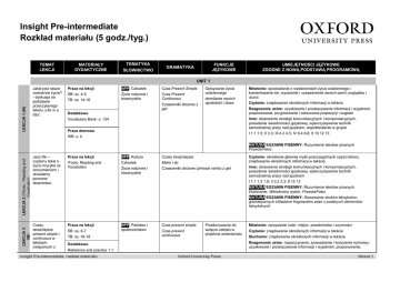 Insight Pre-intermediate Rozkład materiału (5 godz./tyg.) TEMAT LEKCJI MATERIAŁY DYDAKTYCZNE TEMATYKA SŁOWNICTWO FUNKCJE JĘZYKOWE GRAMATYKA UMIEJĘTNOŚCI JĘZYKOWE ZGODNE Z NOWĄ PODSTAWĄ PROGRAMOWĄ LEKCJA 1 (IA) UNIT 1 Jakie jest nasze codzienne życie? - dyskusja na podstawie przeczytanego tekstu „Life in a day”. Praca na lekcji NPP: Człowiek Czas Present Simple SB: ss. 4-5 Życie rodzinne i towarzyskie Czas Present Continuous TB: ss. 14-16 Czasowniki złożone z get Opisywanie życia codziennego określanie swoich upodobań i obaw Mówienie: opowiadanie o wydarzeniach życia codziennego i komentowanie ich, wyrażanie i uzasadnianie swoich opinii, poglądów i uczuć Czytanie: znajdowanie określonych informacji w tekście Reagowanie ustne: uzyskiwanie i przekazywanie informacji i wyjaśnień, proponowanie, przyjmowanie i odrzucanie propozycji i sugestii Dodatkowo Inne: stosowanie strategii komunikacyjnych i kompensacyjnych, posiadanie świadomości językowej, wykorzystywanie technik samodzielnej pracy nad językiem, współdziałanie w grupie Vocabulary Bank: s. 134 Praca domowa I 1.1 1.5; II 3.3; III 4.2 4.5; IV 6.4 6.6; 9 10 12 13 WB: s. 4 LEKCJA 3 (IB) LEKCJA 2 (iTools – Reading and Vocabulary) MATURA EGZAMIN PISEMNY: Rozumienie tekstów pisanych Prawda/Fałsz Jazz life – czytamy tekst o życiu muzyka ze zrozumieniem i utrwalamy poznane słownictwo. Praca na lekcji NPP: Kultura Czasy teraźniejsze iTools: Reading and Vocabulary Człowiek Make i do Czytanie: określanie głównej myśli poszczególnych części tekstu, znajdowanie określonych informacji w tekście Życie rodzinne i towarzyskie Czasowniki złożone (phrasal verbs) z get Inne: stosowanie strategii komunikacyjnych i kompensacyjnych, posiadanie świadomości językowej, wykorzystywanie technik samodzielnej pracy nad językiem I 1.1 1.5 1.9; II 3.2 3.3; 9 12 13 MATURA EGZAMIN PISEMNY: Rozumienie tekstów pisanych Dobieranie, Wielokrotny wybór, Prawda/Fałsz MATURA EGZAMIN PISEMNY: Stosowanie struktur leksykalnogramatycznych Układanie fragmentów zdań z podanych elementów leksykalnych Czasy teraźniejsze present simple i continuous w tekstach związanych z Praca na lekcji SB: ss. 6-7 TB: ss. 16-18 NPP: Państwo i społeczeństwo Czas present simple Czas present continuous Przekonywanie do wzięcia udziału w projekcie wolontariatu Czytanie: znajdowanie określonych informacji w tekście Słuchanie: znajdowanie określonych informacji w tekście Reagowanie ustne: rozpoczynanie, prowadzenie i kończenie rozmowy, uzyskiwanie i przekazywanie informacji i wyjaśnień, proponowanie, Dodatkowo Reference and practice 1.1: Insight Pre-Intermediate: rozkład materiału Mówienie: opisywanie ludzi, miejsc, przedmiotów i czynności Oxford University Press Strona 1 wolontariatem. WB: s. 104 przyjmowanie i odrzucanie propozycji i sugestii Praca domowa Inne: stosowanie strategii komunikacyjnych i kompensacyjnych, posiadanie świadomości językowej, wykorzystywanie technik samodzielnej pracy nad językiem, współdziałanie w grupie WB: s. 5 I 1.14; II 2.3 3.3; III 4.1; IV 6.2 6.4 6.6; 9 10 12 13 LEKCJA 4 (iTools: Grammar &Listening) MATURA EGZAMIN PISEMNY: Stosowanie struktur leksykalnogramatycznych Układanie fragmentów zdań z podanych elementów leksykalnych Utrwalamy poznane struktury gramatyczne i ćwiczymy umiejętność rozumienia ze słuchu. Praca na lekcji Różne formy podróżowania – uzyskiwanie I udzielanie informacji. Praca na lekcji iTools: Grammar &Listening Czas present simple Słuchanie: znajdowanie określonych informacji w tekście Czas present continuous Inne: stosowanie strategii komunikacyjnych i kompensacyjnych, posiadanie świadomości językowej, wykorzystywanie technik samodzielnej pracy nad językiem Przedimki I 1.14; II 2.3; 9 12 13 MATURA EGZAMIN PISEMNY: Rozumienie ze słuchu Wielokrotny wybór SB: ss. 8-9 TB: ss. 18-20 Dodatkowo Vocabulary Bank: s. 134 Praca domowa LEKCJA 5 (1C) NPP: Państwo i społeczeństwo WB: s. 6 NPP: Życie rodzinne i towarzyskie Podróżowanie i turystyka Kolokacje z make i do Czasy teraźniejsze Opisywanie swoich doświadczeń na temat podróżowania Dyskutowanie na temat różnych form podróżowania Uzyskiwanie i udzielanie informacji na temat siebie i innych osób, przyjaciół, rodziny i różnych form spędzania czasu wolnego Mówienie: opisywanie swoich doświadczeń, opowiadanie o wydarzeniach życia codziennego, wyrażanie i uzasadnianie swoich opinii, poglądów i uczuć, przedstawianie zalet i wad różnych rozwiązań i poglądów, opisywanie ludzi, miejsc, czynności Słuchanie: znajdowanie określonych informacji w tekście, określanie intencji nadawcy/autora tekstu, określanie kontekstu wypowiedzi Reagowanie ustne: uzyskiwanie i przekazywanie informacji i wyjaśnień, wyrażanie swoich opinii i preferencji oraz pytanie o opinie i preferencje innych, aktywne uczestniczenie w rozmowie i dyskusji, komentowanie, zgadzanie się lub kwestionowanie zdania innych uczestników dyskusji, nawiązywanie kontaktów towarzyskich, rozpoczynanie, prowadzenie i kończenie rozmowy, stosowanie form grzecznościowych Inne: stosowanie strategii komunikacyjnych i kompensacyjnych, posiadanie świadomości językowej, wykorzystywanie technik samodzielnej pracy nad językiem, współdziałanie w grupie I 1.5 1.8; II 2.3 2.4 2.5; III 4.1 4.2 4.5 4.7 4.9; IV 6.1 6.2 6.3 6.4 6.8; 9 10 12 13 Poziom rozszerzony: IV 6.2 6.3 MATURA EGZAMIN USTNY: Mówienie Opis ilustracji MATURA EGZAMIN PISEMNY: Rozumienie tekstów słuchanych Wielokrotny wybór, Prawda/Fałsz Insight Pre-Intermediate: rozkład materiału Oxford University Press Strona 2 LEKCJA 6 Communication worksheets) LEKCJA 7 (1D) Ćwiczymy umiejętności mówienia, uzyskując I udzielając informacje o sobie. Praca na lekcji NPP: Człowiek Czas present simple Teacher’s resource disc: s. 157 Czas present continuous Worksheets 1A, 1B Czasowniki złożone (phrasal verbs) z get (one handout for each student) Uzysk