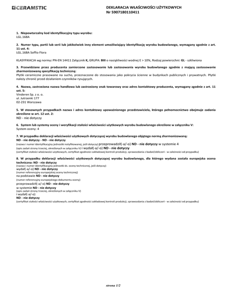 DEKLARACJA WŁAŚCIWOŚCI UŻYTKOWYCH Nr 5907180110411 1. Niepowtarzalny kod identyfikacyjny typu wyrobu: LGL.168A 2. Numer typu, partii lub serii lub jakikolwiek inny element umożliwiający identyfikację wyrobu budowlanego, wymagany zgodnie z art. 11 ust. 4: LGL.168A Soffio Flora KLASYFIKACJA wg normy: PN-EN 14411 Załącznik K, GRUPA: BIII o nasiąkliwości wodnej E > 10%, Rodzaj powierzchni: GL - szkliwiona 3. Przewidziane przez producenta zamierzone zastosowanie lub zastosowania wyrobu budowlanego zgodnie z mającą zastosowanie zharmonizowaną specyfikacją techniczną: Płytki ceramiczne prasowane na sucho, przeznaczone do stosowania jako pokrycia ścienne w budynkach publicznych i prywatnych. Płytki należy chronić przed działaniem czynników rysujących. 4. Nazwa, zastrzeżona nazwa handlowa lub zastrzeżony znak towarowy oraz adres kontaktowy producenta, wymagany zgodnie z art. 11 ust. 5: Vinderen Sp. z o. o. ul. Jutrzenki 177 02-231 Warszawa 5. W stosownych przypadkach nazwa i adres kontaktowy upoważnionego przedstawiciela, którego pełnomocnictwo obejmuje zadania określone w art. 12 ust. 2: ND - nie dotyczy 6. System lub systemy oceny i weryfikacji stałości właściwości użytkowych wyrobu budowlanego określone w załączniku V: System oceny: 4 7. W przypadku deklaracji właściwości użytkowych dotyczącej wyrobu budowlanego objętego normą zharmonizowaną: ND - nie dotyczy - ND - nie dotyczy (nazwa i numer identyfikacyjny jednostki notyfikowanej, jeśli dotyczy) przeprowadził(-a/-o) ND - nie dotyczy w systemie 4 (opis zadań strony trzeciej, określonych w załączniku V) i wydał(-a/-o) ND - nie dotyczy (certyfikat stałości właściwości użytkowych, certyfikat zgodności zakładowej kontroli produkcji, sprawozdania z badań/obliczeń - w zależności od przypadku) 8. W przypadku deklaracji właściwości użytkowych dotyczącej wyrobu budowlanego, dla którego wydana została europejska ocena techniczna: ND - nie dotyczy (nazwa i numer identyfikacyjny jednostki ds. oceny technicznej, jeśli dotyczy) wydał(-a/-o) ND - nie dotyczy (numer referencyjny europejskiej oceny technicznej) na podstawie ND - nie dotyczy (numer referencyjny europejskiego dokumentu oceny) przeprowadził(-a/-o) ND - nie dotyczy w systemie ND - nie dotyczy (opis zadań strony trzeciej, określonych w załączniku V) i wydał(-a/-o) ND - nie dotyczy (certyfikat stałości właściwości użytkowych, certyfikat zgodności zakładowej kontroli produkcji, sprawozdania z badań/obliczeń - w zależności od przypadku) strona 1/2 DEKLARACJA WŁAŚCIWOŚCI UŻYTKOWYCH Nr 5907180110411 9. Deklarowane właściwości użytkowe. Uwagi do tabeli: 1. Kolumna 1 zawiera wykaz zasadniczych charakterystyk określonych w zharmonizowanych specyfikacjach technicznych dla zamierzonego zastosowania lub zamierzonych zastosowań wskazanych w pkt 3 powyżej. 2. Dla każdej zasadniczej charakterystyki wymienionej w kolumnie 1 i zgodnie z wymaganiami art. 6 kolumna 2 zawiera deklarowane właściwości użytkowe, wyrażone, jako poziom lub klasa, lub w sposób opisowy, powiązane z odpowiednimi zasadniczymi charakterystykami. Zawiera litery „NPD" (właściwości użytkowe nieustalone; ang. No Performance Determined), o ile właściwości użytkowe nie zostały zadeklarowane. 3. Dla każdej zasadniczej charakterystyki wymienionej w kolumnie 1 kolumna 3 zawiera: a) datowane odniesienie do odpowiedniej normy zharmonizowanej oraz w stosownych wypadkach numer referencyjny zastosowanej specjalnej lub odpowiedniej dokumentacji technicznej; lub b) datowane odniesienie do odpowiedniego europejskiego dokumentu oceny, w przypadku, gdy jest on dostępny, oraz numer referencyjny zastosowanej europejskiej oceny technicznej. Nasiąkliwość wodna E [%] E > 10 EN14411:2012 Siła łamiąca [N] minimum 600 EN14411:2012 Wytrzymałość na zginanie [N/mm2] ≥ 12 EN14411:2012 Odporność na ścieranie szkliwa PEI/ ilość obrotów NPD - właściwości użytkowe nieustalone EN14411:2012 Odporność na szok termiczny NPD - właściwości użytkowe nieustalone EN14411:2012 Mrozoodporność NPD - właściwości użytkowe nieustalone EN14411:2012 Antypoślizgowość NPD - właściwości użytkowe nieustalone EN14411:2012 Odporność na ogień A1fl EN14411:2012 Odporność na plamienie / zabrudzenia min. klasa 3 EN14411:2012 Promieniotwórczość naturalna [Bq/kg] f1 <= 1, f2 <= 200 EN14411:2012 W przypadku, gdy na podstawie art. 37 lub 38 zastosowana została specjalna dokumentacja techniczna, wymagania, z którymi wyrób jest zgodny: Atest PZH nr HR/B/44/2012 10. Właściwości użytkowe wyrobu określone w pkt 1 i 2 są zgodne z właściwościami użytkowymi deklarowanymi w pkt 9. Niniejsza deklaracja właściwości użytkowych wydana zostaje na wyłączną odpowiedzialność producenta określonego w pkt 4. W imieniu producenta podpisał(-a) Warszawa, 08.10.2015 strona 2/2