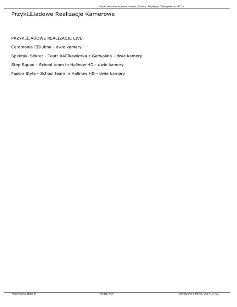 Audio wizualna oprawa imprez. Eventy. Projekcje. Wynajem sprzętu Przykładowe Realizacje Kamerowe PRZYKŕADOWE REALIZACJE LIVE: Ceremonia ślubna - dwie kamery Spektakl Sekret - Teatr Rękawiczka z Garwolina - dwie kamery Step Squad - School team in Halinow HD - dwie kamery Fusion Style - School team in Halinow HD - dwie kamery http://www.ation.pl Kreator PDF Utworzono 8 March, 2017, 04:21