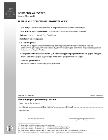 PLAN PRACY DYPLOMOWEJ MAGISTERSKIEJ Tytuł pracy: Kodowanie rozproszone w bezprzewodowych sieciach sensorowych Tytuł pracy w języku angielskim: Distributed coding in wireless sensor networks Opiekun pracy: dr inŜ. Piotr Wasilewski Dodatkowy opiekun pracy: Cel i zakres pracy: Celem pracy będzie opracowanie metody transmisji danych w bezprzewodowych sieciach sensorowych pracujących w standardzie ZigBee wykorzystującej kodowanie rozproszone zgodnie z twierdzeniem Slepian-Wolfa. Wymagania w stosunku do studenta (np. znajomość języka programowania lub języka obcego): Bierna znajomość języka angielskiego, umiejętność programowania w języku C. Literatura podstawowa: Literatura zostanie dostarczona przez promotora Łódź, dn. 2009-06-03 (podpis opiekuna) Deklaruję wybór powyŜszego tematu Imię i nazwisko studenta: ............................................................................................................................. nr albumu: ........................ rodzaj studiów1 ....................... kierunek ........................................................... specjalność .................................................................................................................................................... ................................. (data) ..................................................... (podpis studenta) –––––––––––––––––––––––– 1 Wybrać rodzaj studiów stosując oznaczenia jak poniŜej: S1 – studia stacjonarne 1-go stopnia, NS1 – studia niestacjonarne 1-go stopnia, S2 – studia stacjonarne 2-go stopnia, NS2 – studia niestacjonarne 2-go stopnia, SM – stacjonarne jednolite magisterskie, SI – stacjonarne inŜynierskie, NSI – niestacjonarne inŜynierskie, SMU – stacjonarne magisterskie uzupełniające, NSMU – niestacjonarne magisterskie uzupełniające