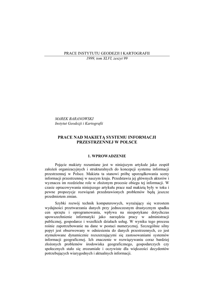 PRACE INSTYTUTU GEODEZJI I KARTOGRAFII 1999, tom XLVI, zeszyt 99 MAREK BARANOWSKI Instytut Geodezji i Kartografii PRACE NAD MAKIETĄ SYSTEMU INFORMACJI PRZESTRZENNEJ W POLSCE 1. WPROWADZENIE Pojęcie makiety rozumiane jest w niniejszym artykule jako zespół założeń organizacyjnych i strukturalnych do koncepcji systemu informacji przestrzennej w Polsce. Makieta ta stanowi próbę uporządkowania sceny informacji przestrzennej w naszym kraju. Przedstawia jej głównych aktorów i wyznacza im rozdzielne role w złożonym procesie obiegu tej informacji. W czasie opracowywania niniejszego artykułu prace nad makietą były w toku i pewne propozycje rozwiązań przedstawionych problemów będą jeszcze przedmiotem zmian. Szybki rozwój technik komputerowych, wyrażający się wzrostem wydajności przetwarzania danych przy jednoczesnym drastycznym spadku cen sprzętu i oprogramowania, wpływa na niespotykane dotychczas upowszechnienie informatyki jako narzędzia pracy w administracji publicznej, gospodarce i wszelkich działach usług. W wyniku tego procesu rośnie zapotrzebowanie na dane w postaci numerycznej. Szczególnie silny popyt jest obserwowany w odniesieniu do danych przestrzennych, co jest stymulowane dynamicznie rozszerzającymi się zastosowaniami systemów informacji geograficznej. Ich znaczenie w rozwiązywaniu coraz bardziej złożonych problemów środowiska geograficznego, gospodarczych czy społecznych stało się zrozumiałe i oczywiste dla większości decydentów potrzebujących wiarygodnych i aktualnych informacji. 22 Marek Baranowski Każda rewolucja, wprowadzając fundamentalne zmiany, tworzy jednocześnie pewien nieporządek – żeby nie powiedzieć chaos – w dziedzinie, którą dotyka. Z taką rewolucją mamy dzisiaj do czynienia w obszarze systemów informacyjnych, a szczególnie systemów informacji przestrzennej. Stąd też podejmowane są próby uporządkowania tworzącej się sceny informacji przestrzennej. Jednym z ważniejszych przejawów tej działalności są prace prowadzone w ramach Projektu Badawczego Zamawianego pt. „Koncepcja systemu informacji przestrzennej w Polsce”. Nadrzędnym celem tego projektu jest uporządkowanie infrastruktury informacji przestrzennej w Polsce. Obserwowane rozproszenie działań i środków w zakresie tworzonych systemów informacji przestrzennej skłaniałoby może bardziej do zastąpienia słowa „uporządkowanie” słowem „stworzenie” przy określaniu tego celu. Tak czy inaczej infrastruktura ta staje się coraz bardziej niezbędnym warunkiem dalszego rozwoju tego typu systemów w Polsce. Na obserwowany stan informacji przestrzennej w naszym kraju składa się szereg zjawisk, które wymagają krótkiego omówienia. Przede wszystkim odczuwa się brak koordynacji działań w zakresie tworzenia systemów oraz samych danych przestrzennych. Często te same dane pozyskiwane są przez różne instytucje i firmy. Zasilają one nierzadko systemy powstające na tym samym terenie, o podobnym zakresie informacyjnym i funkcjonalnym. Nie został do tej pory opracowany program ujednoliconego i systematycznego tworzenia, aktualizowania i udostępniania podstawowych danych przestrzennych zarówno w skali całego kraju, jak i poszczególnych regionów. Użytkownicy systemów informacji przestrzennej oczekują opracowania ogólnopolskich standardów obowiązujących w administracji publicznej i tym samym stanowiących podstawę do ustanowienia standardu ogólnokrajowego. Nie chodzi tu jedynie o rozwiązanie problemu przekazu danych, ale o takie ujęcia danych przestrzennych, które pozwolą na stosowanie ich w różnych środowiskach sprzętowych i oprogramowania. Dotyczy to jednolitych zasad opisu położenia obiektów i zjawisk (układ współrzędnych), znormalizowanych jednostek odniesień przestrzennych, w których będą agregowane dane jednostkowe czy obowiązujących klasyfikacji i systemów kodowania obiektów i zjawisk przestrzennych. Niebagatelne znaczenie mają również prace normalizacyjne w zakresie definicji stosowanych w systemach informacji przestrzennej. Jedną z cech charakterystycznych informacji przestrzennej jest jej rozproszenie. Dotyczy to głównie źródeł jej pochodzenia. Wprawdzie większość danych związanych z osnową geometryczną obiektów i zjawisk przestrzennych powstaje w geodezji i kartografii, ale za ich charakterystyki zwykle są odpowiedzialne instytucje z innych branż. Rozproszenie to jest naturalne, wynika z różnorodności obiektów i zjawisk przestrzennych i Prace nad makietą systemu informacji przestrzennej w Polsce 23 występuje we wszystkich krajach. Wymusza ono podejmowanie działań koordynacyjnych i wymaga partnerstwa między poszczególnymi instytucjami. Podsumowując tę pobieżną analizę stanu infrastruktury informacji przestrzennej w Polsce oraz stojących przed nią wyzwań można stwierdzić, że kluczowymi pojęciami, nad którymi należy się skupić są integracja i koordynacja. 2. STRUKTURA SIP Przed opisaniem makiety systemu informacji przestrzennej niezbędne jest wprowadzenie pewnego uporządkowania do tej problematyki. Zacznijmy od głównych aktorów czy też partnerów infrastruktury informacji przestrzennej. Można ich podzielić na następujące grupy: twórcy informacji przestrzennej (IP), dysponenci IP, integrujący IP, dystrybutorzy IP, odbiorcy IP, koordynatorzy IP, propagatorzy IP, szkoleniowcy. Brak na tej liście bardzo istotnej grupy określanej mianem obsługi technicznej systemów informacyjnych, w skład której wchodzą programiści, operatorzy, administratorzy baz danych czy konserwatorzy systemów informatycznych. Stanowią oni niezbędne zaplecze dla każdego z wyżej wyróżnionych partnerów i mają niewątpliwie istotny wpływ na jakość procesów przetwarzania danych. Z uwagi jednak na ich rolę wspierającą nie będą występowali w dalszych analizach strukturalnych. Kolejna kategoria porządkowa to typy systemów informacji przestr