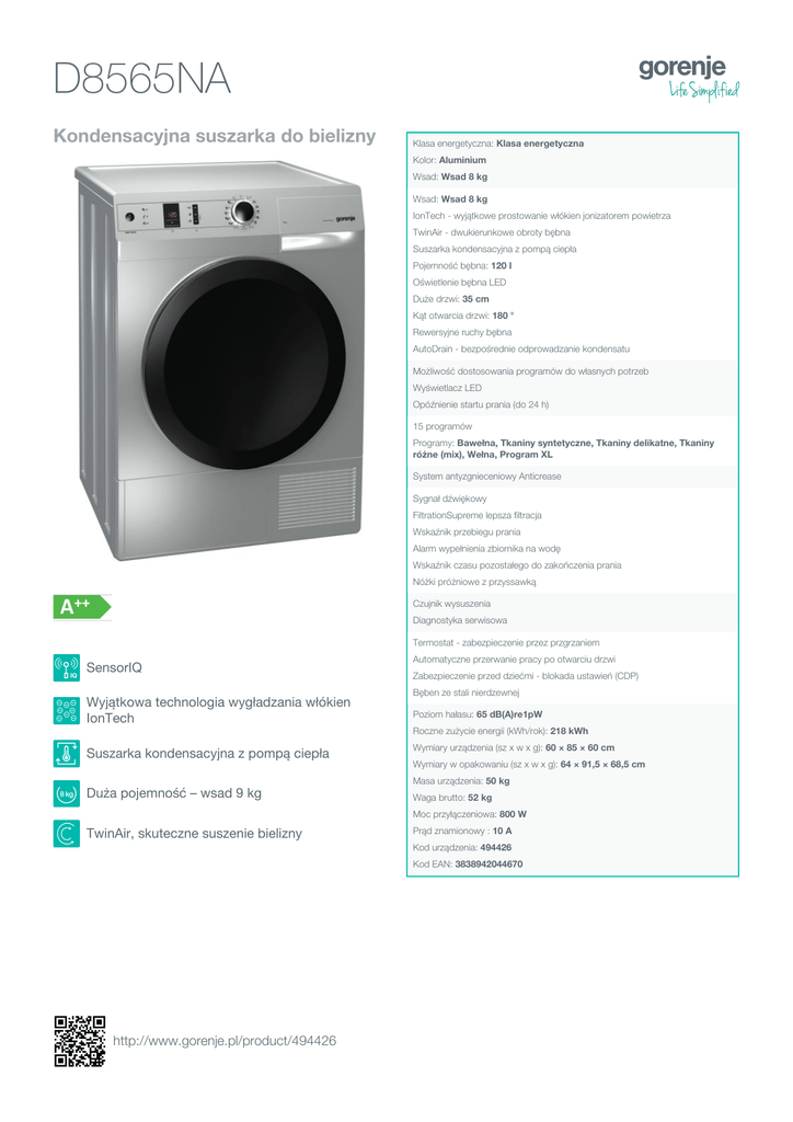 D8565NA Kondensacyjna suszarka do bielizny Klasa energetyczna: Klasa energetyczna Kolor: Aluminium Wsad: Wsad 8 kg Wsad: Wsad 8 kg IonTech - wyjątkowe prostowanie włókien jonizatorem powietrza TwinAir - dwukierunkowe obroty bębna Suszarka kondensacyjna z pompą ciepła Pojemność bębna: 120 l Oświetlenie bębna LED Duże drzwi: 35 cm Kąt otwarcia drzwi: 180 ° Rewersyjne ruchy bębna AutoDrain - bezpośrednie odprowadzanie kondensatu Możliwość dostosowania programów do własnych potrzeb Wyświetlacz LED Opóźnienie startu prania (do 24 h) 15 programów Programy: Bawełna, Tkaniny syntetyczne, Tkaniny delikatne, Tkaniny różne (mix), Wełna, Program XL System antyzgnieceniowy Anticrease Sygnał dźwiękowy FiltrationSupreme lepsza filtracja Wskaźnik przebiegu prania Alarm wypełnienia zbiornika na wodę Wskaźnik czasu pozostałego do zakończenia prania Nóżki próżniowe z przyssawką Czujnik wysuszenia Diagnostyka serwisowa Termostat - zabezpieczenie przez przgrzaniem SensorIQ Wyjątkowa technologia wygładzania włókien IonTech Automatyczne przerwanie pracy po otwarciu drzwi Zabezpieczenie przed dziećmi - blokada ustawień (CDP) Bęben ze stali nierdzewnej Poziom hałasu: 65 dB(A)re1pW Roczne zużycie energii (kWh/rok): 218 kWh Suszarka kondensacyjna z pompą ciepła Wymiary urządzenia (sz x w x g): 60 × 85 × 60 cm Wymiary w opakowaniu (sz x w x g): 64 × 91,5 × 68,5 cm Masa urządzenia: 50 kg Duża pojemność – wsad 9 kg Waga brutto: 52 kg Moc przyłączeniowa: 800 W TwinAir, skuteczne suszenie bielizny Prąd znamionowy : 10 A Kod urządzenia: 494426 Kod EAN: 3838942044670 http://www.gorenje.pl/product/494426