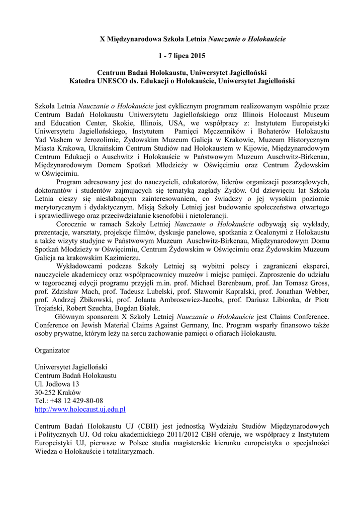X Międzynarodowa Szkoła Letnia Nauczanie o Holokauście 1 - 7 lipca 2015 Centrum Badań Holokaustu, Uniwersytet Jagielloński Katedra UNESCO ds. Edukacji o Holokauście, Uniwersytet Jagielloński Szkoła Letnia Nauczanie o Holokauście jest cyklicznym programem realizowanym wspólnie przez Centrum Badań Holokaustu Uniwersytetu Jagiellońskiego oraz Illinois Holocaust Museum and Education Center, Skokie, Illinois, USA, we współpracy z: Instytutem Europeistyki Uniwersytetu Jagiellońskiego, Instytutem Pamięci Męczenników i Bohaterów Holokaustu Yad Vashem w Jerozolimie, Żydowskim Muzeum Galicja w Krakowie, Muzeum Historycznym Miasta Krakowa, Ukraińskim Centrum Studiów nad Holokaustem w Kijowie, Międzynarodowym Centrum Edukacji o Auschwitz i Holokauście w Państwowym Muzeum Auschwitz-Birkenau, Międzynarodowym Domem Spotkań Młodzieży w Oświęcimiu oraz Centrum Żydowskim w Oświęcimiu. Program adresowany jest do nauczycieli, edukatorów, liderów organizacji pozarządowych, doktorantów i studentów zajmujących się tematyką zagłady Żydów. Od dziewięciu lat Szkoła Letnia cieszy się niesłabnącym zainteresowaniem, co świadczy o jej wysokim poziomie merytorycznym i dydaktycznym. Misją Szkoły Letniej jest budowanie społeczeństwa otwartego i sprawiedliwego oraz przeciwdziałanie ksenofobii i nietolerancji. Corocznie w ramach Szkoły Letniej Nauczanie o Holokauście odbywają się wykłady, prezentacje, warsztaty, projekcje filmów, dyskusje panelowe, spotkania z Ocalonymi z Holokaustu a także wizyty studyjne w Państwowym Muzeum Auschwitz-Birkenau, Międzynarodowym Domu Spotkań Młodzieży w Oświęcimiu, Centrum Żydowskim w Oświęcimiu oraz Żydowskim Muzeum Galicja na krakowskim Kazimierzu. Wykładowcami podczas Szkoły Letniej są wybitni polscy i zagraniczni eksperci, nauczyciele akademiccy oraz współpracownicy muzeów i miejsc pamięci. Zaproszenie do udziału w tegorocznej edycji programu przyjęli m.in. prof. Michael Berenbaum, prof. Jan Tomasz Gross, prof. Zdzisław Mach, prof. Tadeusz Lubelski, prof. Sławomir Kapralski, prof. Jonathan Webber, prof. Andrzej Żbikowski, prof. Jolanta Ambrosewicz-Jacobs, prof. Dariusz Libionka, dr Piotr Trojański, Robert Szuchta, Bogdan Białek. Głównym sponsorem X Szkoły Letniej Nauczanie o Holokauście jest Claims Conference. Conference on Jewish Material Claims Against Germany, Inc. Program wsparły finansowo także osoby prywatne, którym leży na sercu zachowanie pamięci o ofiarach Holokaustu. Organizator Uniwersytet Jagielloński Centrum Badań Holokaustu Ul. Jodłowa 13 30-252 Kraków Tel.: +48 12 429-80-08 http://www.holocaust.uj.edu.pl Centrum Badań Holokaustu UJ (CBH) jest jednostką Wydziału Studiów Międzynarodowych i Politycznych UJ. Od roku akademickiego 2011/2012 CBH oferuje, we współpracy z Instytutem Europeistyki UJ, pierwsze w Polsce studia magisterskie kierunku europeistyka o specjalności Wiedza o Holokauście i totalitaryzmach.