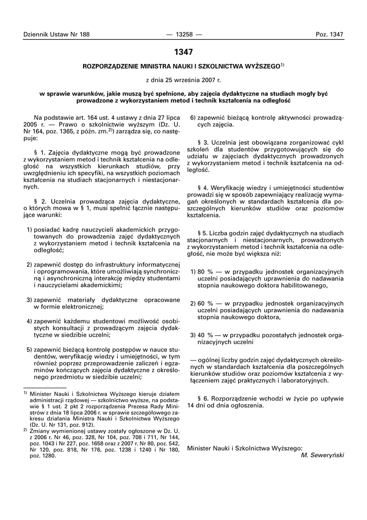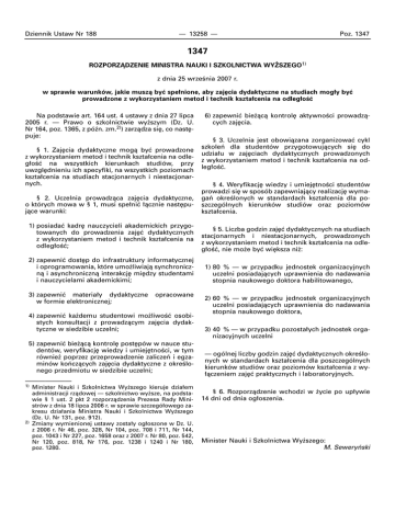 Dziennik Ustaw Nr 188 — 13258 — Poz. 1347 1347 ROZPORZÑDZENIE MINISTRA NAUKI I SZKOLNICTWA WY˚SZEGO1) z dnia 25 wrzeÊnia 2007 r. w sprawie warunków, jakie muszà byç spe∏nione, aby zaj´cia dydaktyczne na studiach mog∏y byç prowadzone z wykorzystaniem metod i technik kszta∏cenia na odleg∏oÊç Na podstawie art. 164 ust. 4 ustawy z dnia 27 lipca 2005 r. — Prawo o szkolnictwie wy˝szym (Dz. U. Nr 164, poz. 1365, z póên. zm.2)) zarzàdza si´, co nast´puje: § 1. Zaj´cia dydaktyczne mogà byç prowadzone z wykorzystaniem metod i technik kszta∏cenia na odleg∏oÊç na wszystkich kierunkach studiów, przy uwzgl´dnieniu ich specyfiki, na wszystkich poziomach kszta∏cenia na studiach stacjonarnych i niestacjonarnych. § 2. Uczelnia prowadzàca zaj´cia dydaktyczne, o których mowa w § 1, musi spe∏niç ∏àcznie nast´pujàce warunki: 1) posiadaç kadr´ nauczycieli akademickich przygotowanych do prowadzenia zaj´ç dydaktycznych z wykorzystaniem metod i technik kszta∏cenia na odleg∏oÊç; 2) zapewniç dost´p do infrastruktury informatycznej i oprogramowania, które umo˝liwiajà synchronicznà i asynchronicznà interakcj´ mi´dzy studentami i nauczycielami akademickimi; 3) zapewniç materia∏y dydaktyczne w formie elektronicznej; opracowane 4) zapewniç ka˝demu studentowi mo˝liwoÊç osobistych konsultacji z prowadzàcym zaj´cia dydaktyczne w siedzibie uczelni; 5) zapewniç bie˝àcà kontrol´ post´pów w nauce studentów, weryfikacj´ wiedzy i umiej´tnoÊci, w tym równie˝ poprzez przeprowadzenie zaliczeƒ i egzaminów koƒczàcych zaj´cia dydaktyczne z okreÊlonego przedmiotu w siedzibie uczelni; 6) zapewniç bie˝àcà kontrol´ aktywnoÊci prowadzàcych zaj´cia. § 3. Uczelnia jest obowiàzana zorganizowaç cykl szkoleƒ dla studentów przygotowujàcych si´ do udzia∏u w zaj´ciach dydaktycznych prowadzonych z wykorzystaniem metod i technik kszta∏cenia na odleg∏oÊç. § 4. Weryfikacj´ wiedzy i umiej´tnoÊci studentów prowadzi si´ w sposób zapewniajàcy realizacj´ wymagaƒ okreÊlonych w standardach kszta∏cenia dla poszczególnych kierunków studiów oraz poziomów kszta∏cenia. § 5. Liczba godzin zaj´ç dydaktycznych na studiach stacjonarnych i niestacjonarnych, prowadzonych z wykorzystaniem metod i technik kszta∏cenia na odleg∏oÊç, nie mo˝e byç wi´ksza ni˝: 1) 80 % — w przypadku jednostek organizacyjnych uczelni posiadajàcych uprawnienia do nadawania stopnia naukowego doktora habilitowanego, 2) 60 % — w przypadku jednostek organizacyjnych uczelni posiadajàcych uprawnienia do nadawania stopnia naukowego doktora, 3) 40 % — w przypadku pozosta∏ych jednostek organizacyjnych uczelni — ogólnej liczby godzin zaj´ç dydaktycznych okreÊlonych w standardach kszta∏cenia dla poszczególnych kierunków studiów oraz poziomów kszta∏cenia z wy∏àczeniem zaj´ç praktycznych i laboratoryjnych. ——————— 1) 2) Minister Nauki i Szkolnictwa Wy˝szego kieruje dzia∏em administracji rzàdowej — szkolnictwo wy˝sze, na podstawie § 1 ust. 2 pkt 2 rozporzàdzenia Prezesa Rady Ministrów z dnia 18 lipca 2006 r. w sprawie szczegó∏owego zakresu dzia∏ania Ministra Nauki i Szkolnictwa Wy˝szego (Dz. U. Nr 131, poz. 912). Zmiany wymienionej ustawy zosta∏y og∏oszone w Dz. U. z 2006 r. Nr 46, poz. 328, Nr 104, poz. 708 i 711, Nr 144, poz. 1043 i Nr 227, poz. 1658 oraz z 2007 r. Nr 80, poz. 542, Nr 120, poz. 818, Nr 176, poz. 1238 i 1240 i Nr 180, poz. 1280. § 6. Rozporzàdzenie wchodzi w ˝ycie po up∏ywie 14 dni od dnia og∏oszenia. Minister Nauki i Szkolnictwa Wy˝szego: M. Seweryƒski