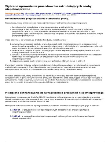 Wybrane uprawnienia pracodawców zatrudniających osoby niepełnosprawne Podstawa prawna: art. 26 oraz 26a - 26e ustawy z dnia 27 sierpnia 1997 roku o rehabilitacji zawodowej i społecznej oraz zatrudnianiu osób niepełnosprawnych (tekst jednolity: Dz.U. z 2016, poz. 2046). Dofinansowanie przystosowania stanowiska pracy. Pracodawca, który przez okres co najmniej 36 miesięcy zatrudni osoby niepełnosprawne bezrobotne lub poszukujące pracy niepozostające w zatrudnieniu; pozostające w zatrudnieniu u pracodawcy występującego o zwrot kosztów, z wyjątkiem przypadków, gdy przyczyną powstania niepełnosprawności w okresie zatrudnienia u tego pracodawcy było zawinione przez pracodawcę lub przez pracownika naruszenie przepisów, w tym przepisów prawa pracy, może otrzymać, na wniosek, ze środków Funduszu zwrot kosztów: 1. adaptacji pomieszczeń zakładu pracy do potrzeb osób niepełnosprawnych, w szczególności poniesionych w związku z przystosowaniem tworzonych lub istniejących stanowisk pracy dla tych osób, stosownie do potrzeb wynikających z ich niepełnosprawności; 2. adaptacji lub nabycia urządzeń ułatwiających osobie niepełnosprawnej wykonywanie pracy lub funkcjonowanie w zakładzie pracy; 3. zakupu i autoryzacji oprogramowania na użytek pracowników niepełnosprawnych oraz urządzeń technologii wspomagających lub przystosowanych do potrzeb wynikających z ich niepełnosprawności; 4. rozpoznania przez służby medycyny pracy potrzeb, o których mowa w pkt 1–3. Zwrot tych kosztów dotyczy wyłącznie dodatkowych kosztów pracodawcy wynikających z zatrudnienia osób niepełnosprawnych. Zwrot kosztów nie może przekraczać dwudziestokrotnego przeciętnego wynagrodzenia za każde przystosowane stanowisko pracy osoby niepełnosprawnej. Ponadto, pracodawca, który przez okres co najmniej 36 miesięcy zatrudni osobę niepełnosprawną zarejestrowaną w powiatowym urzędzie pracy jako bezrobotna albo poszukująca pracy niepozostającą w zatrudnieniu, może otrzymać, na wniosek, ze środków Funduszu zwrot kosztów wyposażenia stanowiska pracy do wysokości piętnastokrotnego przeciętnego wynagrodzenia. Miesięczne dofinansowanie do wynagrodzenia pracownika niepełnosprawnego. Pracodawcy przysługuje ze środków PFRON miesięczne dofinansowanie do wynagrodzenia pracownika niepełnosprawnegoo, o ile pracownik ten został ujęty w ewidencji zatrudnionych osób niepełnosprawnych prowadzonej przez Pełnomocnika Rządu ds. ON. Miesięczne dofinansowanie do wynagrodzenia pracownika niepełnosprawnego przysługuje w kwocie: 1. 1800 zł – w przypadku osób niepełnosprawnych zaliczonych do znacznego stopnia niepełnosprawności; 2. 1125 zł – w przypadku osób niepełnosprawnych zaliczonych do umiarkowanego stopnia niepełnosprawności; 3. 450 zł – w przypadku osób niepełnosprawnych zaliczonych do lekkiego stopnia niepełnosprawności. Powyższe kwoty są zwiększone o 600 zł w przypadku osób niepełnosprawnych, w odniesieniu do których orzeczono chorobę psychiczną, upośledzenie umysłowe, całościowe zaburzenia rozwojowe lub epilepsję oraz niewidomych. Miesięczne dofinansowanie nie przysługuje: 1. pracodawcy, który zatrudnia co najmniej 25 pracowników w przeliczeniu na pełny wymiar czasu pracy i nie osiąga wskaźnika zatrudnienia osób niepełnosprawnych w wysokości co najmniej 6 %; 2. na pracowników zaliczonych do umiarkowanego lub lekkiego stopnia niepełnosprawności, którzy mają ustalone prawo do emerytury; 3. jeżeli wynagrodzenie pracownika niepełnosprawnego nie zostało przekazane na jego rachunek bankowy lub rachunek w spółdzielczej kasie oszczędnościowo-kredytowej albo na adres zamieszkania tego pracownika, za pośrednictwem osób prawnych prowadzących działalność w zakresie doręczania kwot pieniężnych; 4. jeżeli miesięczne koszty płacy zostały poniesione przez pracodawcę z uchybieniem terminów, wynikających z odrębnych przepisów, przekraczającym 14 dni. Kwota miesięcznego dofinansowania nie może przekroczyć kwoty 90% faktycznie poniesionych miesięcznych kosztów płacy, a w przypadku pracodawcy wykonującego działalność gospodarczą - 75% tych kosztów. W przypadku gdy osoba niepełnosprawna jest zatrudniona u więcej niż jednego pracodawcy w wymiarze czasu pracy nieprzekraczającym ogółem pełnego wymiaru czasu pracy, miesięczne dofinansowanie przyznaje się na tę osobę pracodawcom, u których jest ona zatrudniona, w wysokości proporcjonalnej do wymiaru czasu pracy tej osoby. W przypadku, gdy osoba taka jest zatrudniona w wymiarze czasu pracy przekraczającym ogółem pełny wymiar czasu pracy, miesięczne dofinansowanie przyznaje się na tę osobę w wysokości nieprzekraczającej kwoty miesięcznego dofinansowania przyznawanego na osobę zatrudnioną w pełnym wymiarze czasu pracy. Miesięczne dofinansowanie w wysokości proporcjonalnej do wymiaru czasu pracy tej osoby w pierwszej kolejności przyznaje się pracodawcy, który wcześniej zatrudnił tę osobę. Dofinansowanie kosztów zatrudnienia asystenta osoby niepełnosprawnej. Pracodawca, który zatrudnia pracownika niepełnosprawnego, może otrzymać ze środków Funduszu zwrot: 1. miesięcznych kosztów zatrudnienia pracowników pomagających pracownikowi niepełnosprawnemu w pracy, 2. kosztów szkolenia tych pracowników – w zakresie czynności ułatwiających komunikowanie się z otoczeniem, a także czynności niemożliwych lub trudnych do samodzielnego wykonania przez pracownika niepełnosprawnego na stanowisku pracy, przy czym liczba godzin przeznaczonych wyłącznie na pomoc pracownikowi niepełnosprawnemu nie może przekraczać liczby godzin odpowiadającej 20% liczby godzin pracy pracownika w miesiącu. Powered by TCPDF (www.tcpdf.org)