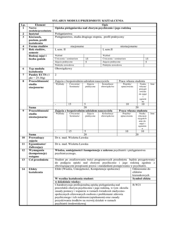 SYLABUS MODUŁU/PRZEDMIOTU KSZTAŁCENIA Lp. 1 2 3 4 5 6 7 8 Element Nazwa modułu/przedmiotu Opis Opieka pielęgniarska nad chorym psychicznie i jego rodziną Instytut Kierunek, poziom, profil kształcenia Forma studiów Rok studiów, semestr Rodzaj zajęć i liczba godzin Pielęgniarstwa Pielęgniarstwo, studia drugiego stopnia, profil praktyczny Typ modułu kształcenia Punkty ECTS (1 pkt = 25-30g) Pracochłonność studia stacjonarne Obowiązkowy stacjonarne I, sem.II Wykład Wykład Ćwiczenia / seminarium Zajęcia praktyczne Praktyka zawodowa 9 10 11 12 13 14 Efekty kształcenia Ćwiczenia / seminarium Zajęcia praktyczne Praktyka zawodowa Zajęcia z bezpośrednim udziałem nauczyciela Wykłady Ćwiczenia/ Seminaria/ Zajęcia praktyczne Konsultacje obowiązkowe 5 20 Zajęcia z bezpośrednim udziałem nauczyciela Wykłady Suma Prowadzący zajęcia Egzaminator/ Zaliczający Wymagania (kompetencje) wstępne Cel przedmiotu 15 5 15 5 2 Suma Pracochłonność studia niestacjonarne niestacjonarne I, sem. II 15 Ćwiczenia/ Seminaria/ Zajęcia praktyczne 15 5 20 Dr n. med. Wioletta Ławska Konsultacje obowiązkowe Praca własna studenta Projekty/ opracowania Nauka własna/ przygot owanie do zajęć i egzami nu Inne 10 10 20 Praca własna studenta Projekty/ opracowania Nauka własna/p rzygotow anie do zajęć i egzamin u 10 Inne 10 20 Dr n. med. Wioletta Ławska Wiedza, umiejętności i kompetencje z zakresu psychiatrii i pielęgniarstwa psychiatrycznego, Student po zrealizowaniu treści programowych przedmiotu będzie przygotowany do podjęcia opieki nad chorymi psychicznie i jego rodziną zgodnie z obowiązującymi przepisami prawa i standardami postępowania w psychiatrii. Efekt (Wiedza, Umiejętności, Kompetencje społeczne) Odniesienie do efektów kierunkowych W wyniku kształcenia student: Symbol efektu w dziedzinie wiedzy: Charakteryzuje profesjonalną opiekę pielęgniarską nad B.W21 przewlekle chorym psychicznie i jego rodziną, w tym określa zasady pomocy i wsparcia w ramach świadczeń medycznospołecznych oferowanych osobom z problemami zdrowia psychicznego i ich rodzinom (opiekunom) oraz zasady pozyskiwania środków na rozwój działań w ramach psychiatrii środowiskowej Forma i warunki potwierdzenia efektu kształcenia umiejętności wiedza 15 w dziedzinie umiejętności: Prowadzi psychoedukację pacjentów z zaburzeniami B.U19 psychicznymi i ich opiekunów, stosuje elementy psychoterapii dla osób z zaburzeniami psychicznymi, a także prowadzi treningi umiejętności społecznych jako formy rehabilitacji psychiatrycznej rozpoznaje sytuację życiową pacjenta w celu zapobiegania B.U20 jego izolacji społecznej wskazuje możliwości pomocy i wsparcia w ramach świadczeń B.U21 medyczno-społecznych oferowanych osobie z zaburzeniami psychicznymi i jej opiekunom nawiązuje współpracę i korzysta z pomocy osób znaczących B.U22 dla pacjenta. w dziedzinie kompetencji społecznych: Ponosi odpowiedzialność za udział w podejmowaniu decyzji B.K1 zawodowych Krytycznie ocenia własne i cudze działania, przy zachowaniu B.K2 szacunku dla różnic światopoglądowych i kulturowych Rozwiązuje dylematy etyczne w organizacji pracy własnej i B.K3 zespołu Ponosi odpowiedzialność za bezpieczeństwo własne i osób B.K5 znajdujących się pod jego opieką Przestrzega zasad etyki zawodowej w relacji z pacjentem i B.K6 zespołem terapeutycznym oraz w pracy badawczej Dba o wizerunek własnego zawodu B.K7 Efekt kształcenia Sposób potwierdzenia (weryfikacji) osiągany przez moduł/przedmiot Symbol efektu B.W21 prezentacja ustna sprawdzian ustny lub pisemny - kolokwium B.U19 B.U20 B.U21 B.U22 praca pisemna, konstruowanie poradnika dla pacjenta i /lub jego rodziny, standardu opieki, procesu pielęgnowania -prezentacja ustna, Kompetencja społeczne B.K1 obserwacja postawy studenta na zajęciach, B.K2 zaangażowanie w pracę, B.K3 ocena przez kolegów i koleżanki, B.K5 samoocena studenta. B.K6 B.K7 Wykład konwersatoryjny, praca z podręcznikiem, praca zbiorowa, studium przypadku, praca nad projektem, ćwiczenia teoretyczne, ćwiczenia praktyczne, zajęcia praktyczne, projekcje filmu, przeźroczy Przedmiot kończy się egzaminem po II semestrze Egzamin: Zaawansowana opieka specjalistyczna w pielęgniarstwie-obejmuje: II semestr: -opieka pielęgniarska nad pacjentem z cukrzycą -opieka pielęgniarska w przewlekłych chorobach nerek -opieka pielęgniarska nad chorym ze stwardnieniem rozsianym -opieka pielęgniarska nad dzieckiem przewlekle chorym -opieka pielęgniarska nad chorym psychicznie i jego rodziną Zasady dopuszczenia do egzaminu: uzyskanie zaliczenia z seminarium i zajęć praktycznych-wpis do Indywidualnej Karty Zaliczenia Przedmiotu oraz Dziennika Zaliczenia Efektów Kształcenia 16 17 Stosowane metody dydaktyczne Forma i warunki zaliczenia modułu, zasady dopuszczenia do egzaminu oraz zaliczenia poszczególnych zajęć Zasady zaliczenia seminarium: 1. obecność na zajęciach 100% 2. uzyskanie pozytywnej oceny (co najmniej dst) z prezentacji tematu zajęć 3. uzyskanie pozytywnej oceny (co najmniej dst) z kolokwium Zaliczenie zajęć praktycznych: obowiązkowa obecność 100% na zajęciach złożenie prac zaliczeniowych z zajęć praktycznych zaliczenie wszystkich kompetencji Zaliczenie seminarium i zajęć praktycznych: zaliczenie na ocenę, która obejmuje: (35% oceny wiedzy +50% oceny umiejętności +5% oceny kompetencji społecznych +10% oceny pracy zaliczeniowej) W przypadku nieobecności usprawiedliwionej zajęcia muszą być zrealizowane w innym terminie (ustalonym z koordynatorem przedmiotu). 18 Treści merytoryczne przedmiotu 19 Wykaz literatury podstawowej 20 Wykaz literatury uzupełniającej (pomocniczej) Forma egzaminu: Egzamin pisemny- test –pytania zamknięte oraz otwarte Warunki zaliczenia egzaminu –uzyskanie 60-70% pozytywnych odpowiedzi z egzamin pisemnego. Na ocenę końcową z egzaminu składa się: ocena z egzaminu pisemnego-80% oraz ocena z seminarium 