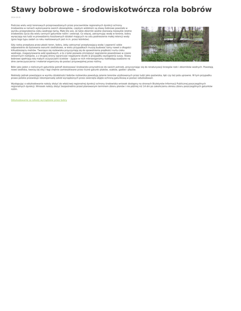 Stawy bobrowe - środowiskotwórcza rola bobrów 2014-10-31 Podczas wielu wizji terenowych przeprowadzanych przez pracowników regionalnych dyrekcji ochrony środowiska w ramach wykonywania swoich obowiązków, częstym widokiem są stawy bobrowe powstałe w wyniku przegrodzenia cieku wodnego tamą. Mało kto wie, że takie zbiorniki wodne stanowią niezwykle istotne środowisko życia dla wielu cennych gatunków roślin i zwierząt. Co więcej, zatrzymując wodę w terenie, bobry wyręczają nas ludzi w prowadzeniu kosztownych działań mających na celu podniesienie małej retencji wody (gros tego typu zadań co roku realizowanych jest m.in. przez leśników). Gdy rzeka przepływa przez płaski teren, bobry, żeby zatrzymać przepływającą wodę i zapewnić sobie odpowiednie do bytowania warunki siedliskowe, w wielu przypadkach muszą budować tamy nawet o długości kilkudziesięciu metrów. Tworzące się rozlewiska przyczyniają się do spowolnienia prędkości nurtu cieku wodnego, magazynowania wód opadowych, a to z kolei pozwala zmniejszyć zagrożenie powodziowe w czasie wiosennych roztopów, a z drugiej strony ograniczać negatywne skutki w przypadku wystąpienia suszy. Stawy bobrowe spełniają rolę małych oczyszczalni ścieków – żyjące w nich mikroorganizmy rozkładają osadzone na dnie zanieczyszczenia i materiał organiczny do postaci przyswajalnej przez rośliny. Bóbr jako jeden z nielicznych gatunków potrafi dostosować środowisko przyrodnicze do swoich potrzeb, przyczyniając się do renaturyzacji brzegów rzek i zbiorników wodnych. Powstają nowe siedliska, tworzą się olsy i łęgi chętnie zamieszkiwane przez liczne gatunki ptaków, ssaków, gadów i płazów. Niekiedy jednak powstające w wyniku działalności bobrów rozlewiska powodują zalanie terenów użytkowanych przez ludzi jako pastwiska, łąki czy też pola uprawne. W tym przypadku prawo polskie przewiduje rekompensatę szkód wyrządzonych przez zwierzęta objęte ochroną gatunkową w postaci odszkodowań. Występując o odszkodowanie należy złożyć do właściwej regionalnej dyrekcji ochrony środowiska wniosek dostępny na stronach Biuletynów Informacji Publicznej poszczególnych regionalnych dyrekcji. Wniosek należy złożyć bezpośrednio przed planowanym terminem zbioru plonów i nie później niż 14 dni po zakończeniu okresu zbioru poszczególnych gatunków roślin. Odszkodowanie za szkody wyrządzone przez bobry