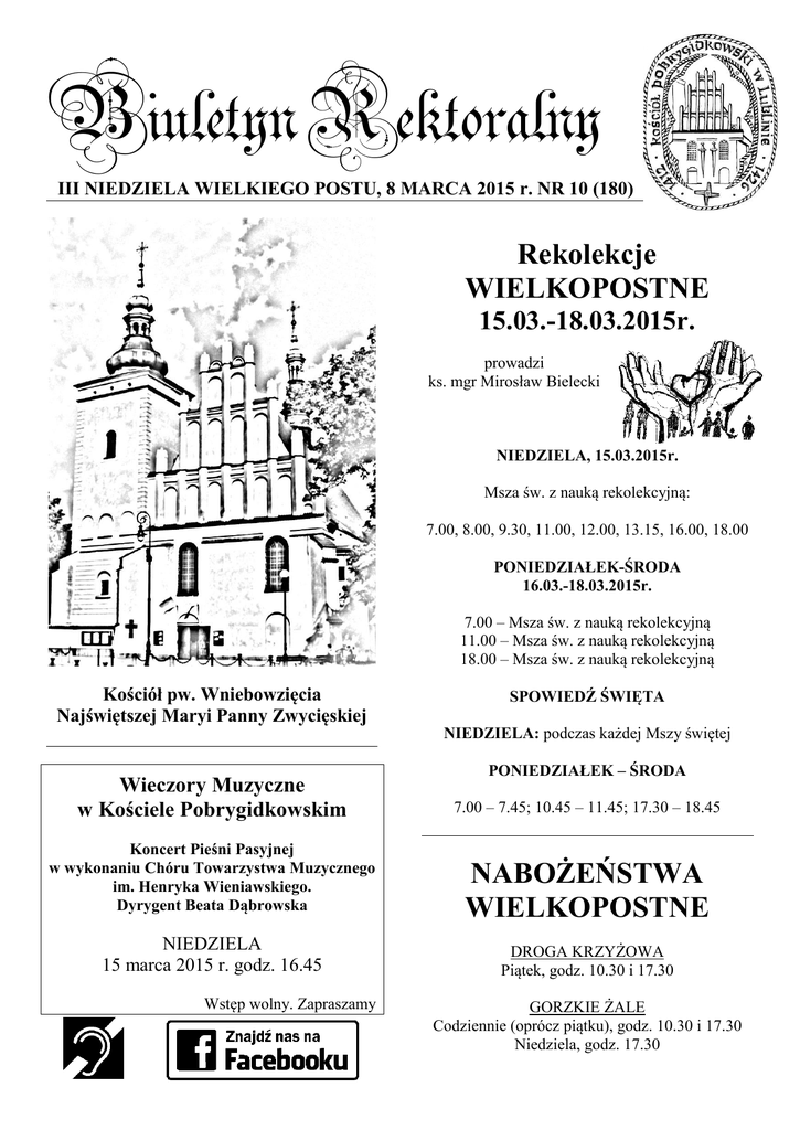 Biuletyn Rektoralny III NIEDZIELA WIELKIEGO POSTU, 8 MARCA 2015 r. NR 10 (180) Rekolekcje WIELKOPOSTNE 15.03.-18.03.2015r. prowadzi ks. mgr Mirosław Bielecki NIEDZIELA, 15.03.2015r. Msza św. z nauką rekolekcyjną: 7.00, 8.00, 9.30, 11.00, 12.00, 13.15, 16.00, 18.00 PONIEDZIAŁEK-ŚRODA 16.03.-18.03.2015r. 7.00 – Msza św. z nauką rekolekcyjną 11.00 – Msza św. z nauką rekolekcyjną 18.00 – Msza św. z nauką rekolekcyjną Kościół pw. Wniebowzięcia Najświętszej Maryi Panny Zwycięskiej Wieczory Muzyczne w Kościele Pobrygidkowskim Koncert Pieśni Pasyjnej w wykonaniu Chóru Towarzystwa Muzycznego im. Henryka Wieniawskiego. Dyrygent Beata Dąbrowska NIEDZIELA 15 marca 2015 r. godz. 16.45 Wstęp wolny. Zapraszamy SPOWIEDŹ ŚWIĘTA NIEDZIELA: podczas każdej Mszy świętej PONIEDZIAŁEK – ŚRODA 7.00 – 7.45; 10.45 – 11.45; 17.30 – 18.45 NABOŻEŃSTWA WIELKOPOSTNE DROGA KRZYŻOWA Piątek, godz. 10.30 i 17.30 GORZKIE ŻALE Codziennie (oprócz piątku), godz. 10.30 i 17.30 Niedziela, godz. 17.30 INTENCJE MSZALNE Poniedziałek, 9 marca 7.00 O zdrowie, Boże błogosławieństwo, opiekę Matki Bożej dla Bożeny i Marty oraz ich rodziny 7.00 O zdrowie, Boże błogosławieństwo, opiekę Matki Bożej dla Zbigniewa Bieńko 7.30 O zdrowie i udaną operacje dla Bożeny 11.00 +Ewa Rykowska-Gregorianka - 22 18.00 +Waldemar Kanadys –Gregorianka 22 18.00 O przerwanie grzechów pokoleniowych 18.00 +Zofia Mirowska /3r./ Wtorek, 10 marca 7.00 +Waldemar Kanadys –Gregorianka 23 7.00 O zdrowie i udaną operacje dla Bożeny 7.30 Dziękczynna za otrzymane łaski z prośbą O zdrowie, Boże błogosławieństwo, opiekę Matki Bożej dla Bronisławy 11.00 +Ewa Rykowska-Gregorianka 23 18.00 Za pomordowanych w Katyniu i ofiary katastrofy w Smoleńsku 18.00 +Federico (5r) Środa, 11 marca 7.00 O zdrowie i udaną operacje dla Bożeny 7.00 W intencji ofiarodawców 7.30 +Katarzyna i Stanisław, Marianna i Marcin, Helena i Zdzisław i zmarłych z rodziny 11.00 +Ewa Rykowska-Gregorianka 24 18.00 +Waldemar Kanadys –Gregorianka 24 18.00 +Ks. Józef, ks. Wincenty Czwartek, 12 marca 7.00 +Antoni, Maria, Wawrzyniec, Janina 7.30 O zdrowie i udaną operacje dla Bożeny 8.00 ZBIOROWA DO ŚW. JUDY 11.00 +Ewa Rykowska-Gregorianka 25 18.00 +Waldemar Kanadys –Gregorianka 25 18.00 +Helena Surmacz (15r), zm. z rodzin Trojnar i Surmacz Piątek, 13 marca 7.00 +Krystyna Mokrzycka 7.00 O zdrowie i udaną operacje dla Bożeny 7.30 Za ginących w katastrofach nieprzygotowanych na śmierć 11.00 ZBIOROWA DO ŚW. BRYGIDY 18.00 +Ewa Rykowska-Gregorianka 26 18.00 +Waldemar Kanadys –Gregorianka 26 Sobota, 14 marca 7.00 +Waldemar Kanadys –Gregorianka 27 7.30 O zdrowie i udaną operacje dla Bożeny 11.00 +Ewa Rykowska-Gregorianka 27 18.00 +Maria (32r), Antoni, Tadeusz, Janina, Franciszek, Stanisław, Anna, Rozalia, Zofia, Jan, Franciszek IV Niedziela Wielkiego Postu, 15 marca 7.00 +Ewa Rykowska-Gregorianka 28 8.00 O potrzebne łaski i błogosławieństwo Boże o łaskę zdrowia, dary Ducha Świętego dla Bożeny 8.00 O zdrowie i udaną operacje dla Bożeny 9.30 +Eugeniusz Jabłoński rocznica śmierci 11.00 +Ryszard Frączek (24r) 12.00 O Boże miłosierdzie, aby Duch Święty obdarzył swoimi darami Stanisława, Romana i Czesława w pełnieniu woli Bożej 12.00 +Wojciech Pazura w rocznicę śmierci 13.15 +Janina Stadnicka (13r), Stanisław Stadnicki (8r) 16.00 Dziękczynna za otrzymane łaski z prośbą O zdrowie, Boże błogosławieństwo, opiekę Matki Bożej dla Janiny, Mieczysława, Brygidy, Elżbiety i całej rodziny 18.00 +Waldemar Kanadys –Gregorianka 28 Msze święte w intencji naszych bliskich zmarłych bądź w intencji osób żyjących (z okazji imienin, urodzin, rocznic zawarcia związku małżeńskiego) można zamawiać w zakrystii przed lub po każdej mszy św. SŁOWO NA NIEDZIELĘ Postępujcie według ducha… Mijają dni wielkopostnej zadumy nad życiem. W te dni, bardziej niż kiedykolwiek, spoglądamy oczyma wiary i rozumu na plany Boga względem człowieka – ich symbolem była w ostatnią niedzielę ewangelia o Przemienieniu Pańskim, ukazująca perspektywę życia w chwale nieba. Ale jednocześnie uświadamiamy sobie zagrożenia płynące ze strony szatana, które mogą spowodować, że nasze życiowe drogi miną się z powołaniem do tej rzeczywistości Przemienionej. Mogą, bo jesteśmy wolni, ale nie muszą, bo też jesteśmy wolni, o czym przypomina zwycięstwo Jezusa w ewangelicznej scenie kuszenia z I niedzieli Wielkiego Postu. Także dzisiejsza Liturgia Słowa ukazuje drogę naszego powołania. Oto jesteśmy powołani, by być świątynią, mieszkaniem Ducha Świętego; nasze wnętrze nie może być swego rodzaju targowiskiem współczesnego świata, gdzie można kupić i sprzedać wszystko, także człowieka, jego wolność, prawdę, miłość, a nawet życie. „Postępujcie według ducha, a nie spełnicie pożądania ciała” – przestrzega św. Paweł w Liście do Galatów. Czyż tak nie jest? Wiedział o tym i nadal wie doskonale Chrystus. Jak pisze ewangelista: Wiedział On, co kryje się w człowieku. Bóg od początku znał serce człowieka, kochał człowieka, był obecny w jego ziemskim wędrowaniu. Stąd w historii człowieka pojawiają się słowa, które dają życie – 10 słów, dekalog, przykazania! Dziś może wielu bardziej kojarzą się z ciężarem, jako coś niewygodnego, ograniczającego człowieka, niż z miłością Boga do człowieka. Dziś Kościół odczytuje Dekalog u stóp krzyża. Kościół odczytuje prawo Dekalogu w perspektywie miłości Boga do człowieka, której ostateczną miarą jest Chrystus Ukrzyżowany. To On wyswobodził nas ku wolności, ku wolności w miłości, nade wszystko w miłości. Ona jest przykazaniem najważniejszym pośród wielu innych, gdyż sam Bóg jest miłością. O przemieniającej mocy miłości mówił bł. Jan Paweł II: „Człowiek musi mieć tę podstawową pewność, że jest miłowany, że jest afirmowany w c