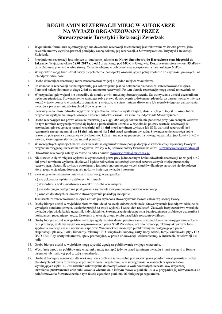 REGULAMIN REZERWACJI MIEJC W AUTOKARZE NA WYJAZD ORGANIZOWANY PRZEZ Stowarzyszenie Turystyki i Rekreacji Zwiedzak 1. 2. 3. 4. 5. 6. 7. 8. 9. 10. 11. 12. 13. 14. 15. 16. 17. Wypełnienie formularza rejestracyjnego lub dokonanie rezerwacji telefonicznej jest traktowane w świetle prawa, jako zawarcie umowy cywilno-prawnej pomiędzy osobą dokonującą rezerwacji, a Stowarzyszeniem Turystyki i Rekreacji Zwiedzak. Przedmiotem rezerwacji jest miejsce w autokarze jadącym na Narty, Snowboard do Harrachova oraz biegówki do Jakuszyc. Wyjazd autokaru 28.01.2017 r. o 6:15 z parkingu pod MOK w Głogowie. Koszt uczestnictwa wynosi 55 zł/os – cena obejmuje przejazd w obie strony. Cena nie obejmuje dobrowolnego ubezpieczenia narciarskiego 5 zł/os. W wyjeździe mogą brać udział osoby niepełnoletnie pod opieką osób mających pełną zdolność do czynności prawnych i na ich odpowiedzialność. Osoba dokonująca rezerwacji może zarezerwować więcej niż jedno miejsce w autokarze. Po dokonaniu rezerwacji osoba reprezentująca zobowiązana jest do dokonania płatności za zarezerwowane miejsca. Płatności należy dokonać w ciągu 2 dni od momentu rezerwacji. Po tym okresie rezerwacje mogą zostać unieważnione. W przypadku, gdy wyjazd nie doszedłby do skutku z wini umyślnej Stowarzyszenia, Stowarzyszenie zwróci uczestnikom wpłacone pieniądze. Stowarzyszenie zastrzega sobie prawo do potrącenia z dokonanej płatności za zarezerwowane miejsca kosztów, jakie poniosło w związku z organizacją wyjazdu, w sytuacji niezrealizowanie lub nienależytego zorganizowania wyjazdu z przyczyn niezależnych od Stowarzyszenia. Stowarzyszenie może odwołać wyjazd w przypadku nie zebrania wystarczającej ilości chętnych, to jest 30 osób, lub w przypadku wystąpienia innych losowych zdarzeń lub okoliczności, za które nie odpowiada Stowarzyszenie. Osoba rezerwująca ma prawo odwołać rezerwację w ciągu 48h od jej dokonania nie ponosząc przy tym żadnych kosztów. Po tym terminie rezygnacja wiązać się będzie z poniesieniem kosztów w wysokości połowy wartości rezerwacji w przypadku, gdy rezygnacja nastąpi wcześniej niż 14 dni przed terminem wyjazdu lub 80% wartości rezerwacji jeśli rezygnacja nastąpi na mniej niż 14 dni i nie mniej niż 2 dni przed terminem wyjazdu. Stowarzyszenie zastrzega sobie prawo do potrącenia z zwracanej kwoty, kosztów, których nie uda się przenieść na nowego uczestnika. (np. koszty biletów wstępu, które organizator będzie musiał ponieść). W szczególnych sytuacjach na wniosek uczestnika organizator może podjąć decyzje o zwrocie całej wpłaconej kwoty w przypadku rezygnacji uczestnika z wyjazdu. Prośby w tej sprawie należy kierować na adres: [email protected] Odwołania rezerwacji należy kierować na adres e-mail: [email protected] Nie stawienie się w miejscu wyjazdu o wyznaczonej porze przy jednoczesnym braku odwołania rezerwacji na więcej niż 2 dni przed terminem wyjazdu, skutkować będzie pokryciem całkowitej wartości rezerwowanych miejsc przez osobę rezerwującą. Uczestnik wyjazdu obowiązany jest pod rygorem negatywnych skutków dla niego stosować się do poleceń kierującego wyjazdem, dotyczących godziny i miejsca wyjazdu i powrotu. Stowarzyszenie ma prawo unieważnić rezerwację w przypadku: a.) nie dokonania wpłaty w ustalonych terminach b.) stwierdzenia braku możliwości kontaktu z osobą rezerwującą c.) uzasadnionego podejrzenia posługiwania się niewłaściwymi danymi podczas rezerwacji d.) osób co do których członkowie stowarzyszenia posiadają złe opinie. Jeśli kwota za zarezerwowane miejsca została już wpłacona stowarzyszenie zwróci całość wpłaconej kwoty. Osoby biorące udział w wyjeździe biorą w nim udział na swoją odpowiedzialność. Stowarzyszenie jest odpowiedzialne za wynajęcie autokaru, sprzętu, ustalenie przejść na trasie wyjazdu i wszelkich rozliczeń. Za swoje bezpieczeństwo w trakcie wyjazdu odpowiada każdy uczestnik indywidualnie. Stowarzyszenie nie zapewnia bezpieczeństwa osobistego uczestnika i posiadanych przez niego rzeczy. Uczestnik zrzeka się z tego tytułu wszelkich roszczeń cywilnych. Osoby biorące udział w wyjeździe wyrażają zgodę na utrwalanie, przetwarzanie oraz publikowanie swojego wizerunku w celu promocji, reklamy wyjazdów organizowanych przez STiR Zwiedzak, oraz do promocji, reklamy aktywnych form spędzania wolnego czasu i uprawiania sportów. Wizerunek ten może być publikowany na następujących polach eksploatacji: plakaty, ulotki, bilboardy, reklamy LED, wizytówki, kupony, karty, bony, teczki, torby, widokówki, płyty CD, DVD i Blu-Ray, spoty reklamowe, spoty promocyjne, w prasie drukowanej i elektronicznej, w internecie, w telewizji i w radio. Osoby biorące udział w wyjeździe mogą wycofać zgodę na publikowanie swojego wizerunku. Wycofanie zgody na publikowanie wizerunku może nastąpić jedynie przed terminem wyjazdu i musi nastąpić w formie pisemnej lub mailowej pod groźbą nieważności. Osoba dokonująca rezerwacji dla większej ilości osób niż samej siebie jest zobowiązana poinformować pozostałe osoby, dla których dokonała rezerwacji, o postanowieniach regulaminu, a w szczególności o zasadach bezpieczeństwa wynikających z pkt. 13. Jest również zobowiązana do zweryfikowania woli pozostałych uczestników dotyczącej utrwalania, przetwarzania oraz publikowania wizerunku, o którym mowa w punkcie 14, a w przypadku jej niewyrażenia do poinformowania Stowarzyszenia o tym fakcie zgodnie z punktem 16 niniejszego regulaminu.
