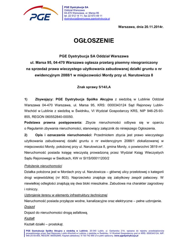 PGE Dystrybucja SA Oddział Warszawa 04-470 Warszawa, ul. Marsa 95 tel. 22 512 14 11, fax 22 673 49 11 [email protected] Warszawa, dnia 20.11.2014r. OGŁOSZENIE PGE Dystrybucja SA Oddział Warszawa ul. Marsa 95, 04-470 Warszawa ogłasza przetarg pisemny nieograniczony na sprzedaŜ prawa wieczystego uŜytkowania zabudowanej działki gruntu o nr ewidencyjnym 2088/1 w miejscowości Mordy przy ul. Narutowicza 8 Znak sprawy 5/14/LA 1) Zbywający: PGE Dystrybucja Spółka Akcyjna z siedzibą w Lublinie Oddział Warszawa 04-470 Warszawa, ul. Marsa 95, KRS: 0000343124 Sąd Rejonowy LublinWschód w Lublinie z siedzibą w Świdniku, VI Wydział Gospodarczy KRS, NIP 946-25-93855, REGON 060552840-00050. Podstawa prawna postępowania: Zbycie nieruchomości odbywa się w oparciu o Regulamin zbywania nieruchomości, stanowiący załącznik do niniejszego Ogłoszenia. 2) Opis i oznaczenie nieruchomości: Przedmiotem zbycia jest prawo wieczystego uŜytkowania zabudowanej działki gruntu o nr ewidencyjnym 2088/1 zlokalizowanej w miejscowości Mordy, połoŜonej przy ul. Narutowicza 8, gmina Mordy, o powierzchni 3819 m². Nieruchomość posiada księgę wieczystą prowadzoną przez Wydział Ksiąg Wieczystych Sądu Rejonowego w Siedlcach, KW nr SI1S/00011200/2 PołoŜenie nieruchomości Działka połoŜona jest w Mordach przy ul. Narutowicza – głównej ulicy przelotowej o kategorii drogi wojewódzkiej (nr 803). Naprzeciwko znajduje się zabytkowy zespół pałacowy. W niewielkiej odległości znajdują się dwa bloki mieszkalne. Zabudowa ma charakter zagrodowy i rolniczy. Uzbrojenie terenu w elementy infrastruktury technicznej Nieruchomość posiada przyłącze wodne, kanalizacyjne oraz elektryczne – pełne uzbrojenie. Dojazd Dojazd do nieruchomości drogą asfaltową. Kształt Kształt działki – prostokąt. PGE Dystrybucja Spółka Akcyjna z siedzibą w Lublinie, 20-340 Lublin, ul. Garbarska 21A, wpisana do rejestru przedsiębiorców prowadzonego przez Sąd Rejonowy Lublin-Wschód w Lublinie z siedzibą w Świdniku, VI Wydział Gospodarczy pod nr KRS: 0000343124, NIP: 946-25-93-855, REGON: 060552840, Kapitał zakładowy: 9 730 742 890 zł w pełni opłacony. www.pgedystrybucja.pl Stan zagospodarowania nieruchomości Działka jest zabudowana budynkami i budowlami dawnego posterunku energetycznego. Działka ogrodzona. Teren działki nie jest utwardzony. Budynki i budowle Budynek posterunku energetycznego Budynek o funkcji mieszkalnej, parterowy, niepodpiwniczony, murowany z betonu komórkowego, stropodach Ŝelbetowy, dach kryty papą. Powierzchnia zabudowy 143 m2. Powierzchnia uŜytkowa 122 m2. Wymiary 13x11x3,18 m. Kubatura 455 m3. Budynek garaŜowy Budynek parterowy, murowany z prefabrykatów, stropy Ŝelbetowe, dach kryty papą. Powierzchnia zabudowy 37,44 m2. Powierzchnia uŜytkowa 25 m2. Wymiary 6,8x5,5x2,7 m. Kubatura 101,08 m2. Budynek gospodarczy Budynek parterowy, murowany, stropodach Ŝelbetowy, dach kryty papą. Powierzchnia zabudowy 42 m2, powierzchnia uŜytkowa 35 m2. Wymiary 7x6x2,97 m. Kubatura 125 m3. Ogrodzenie Ogrodzenie z siatki ma słupkach Ŝelbetowych długość 216 mb. Brama wjazdowa i furtka. 3) ObciąŜenia nieruchomości, inne zobowiązania i sposób określenia ceny ofertowej: Nieruchomość wolna jest od obciąŜeń i innych zobowiązań. Kupujący ustanowi nieodpłatną słuŜebność przesyłu w związku z istnieniem trzech linii średniego napięcia oraz linii niskiego napięcia. Podstawą ustalenia ceny najkorzystniejszej oferty będzie zaoferowana cena sprzedaŜy netto, do której doliczony zostanie podatek VAT zgodnie z obowiązującymi przepisami. Cała zaoferowana cena sprzedaŜy nieruchomości musi wpłynąć na konto PGE Dystrybucja S.A. Oddział Warszawa, najpóźniej na trzy dni przed dniem podpisania umowy sprzedaŜy. 4) Opis sposobu przygotowania oferty: a. Oferent moŜe złoŜyć tylko jedną ofertę b. Ofertę naleŜy przygotować w języku polskim, czytelnie. c. Ofertę naleŜy złoŜyć na formularzu stanowiącym załącznik do niniejszego ogłoszenia. d. Do oferty naleŜy dołączyć kopię dowodu wniesienia wadium oraz jeŜeli Oferentem jest osoba prawna lub inna osoba fizyczna prowadząca działalność gospodarczą aktualny odpis z właściwego rejestru albo aktualne zaświadczenie o wpisie do ewidencji działalności gospodarczej, jeŜeli odrębne przepisy wymagają wpisu PGE Dystrybucja Spółka Akcyjna z siedzibą w Lublinie, 20-340 Lublin, ul. Garbarska 21A, wpisana do rejestru przedsiębiorców prowadzonego przez Sąd Rejonowy Lublin-Wschód w Lublinie z siedzibą w Świdniku, VI Wydział Gospodarczy pod nr KRS: 0000343124, NIP: 946-25-93-855, REGON: 060552840, Kapitał zakładowy: 9 730 742 890 zł w pełni opłacony. www.pgedystrybucja.pl 2z5 do rejestru lub zgłoszenia do ewidencji działalności gospodarczej, wystawione nie wcześniej niŜ 6 miesięcy przed upływem terminu składania ofert. e. Ofertę naleŜy składać w trwale zamkniętych kopertach. NaleŜy stosować koperty zewnętrzne i wewnętrzne. Koperta zewnętrzna musi być zaadresowana do Zbywającego następująco: PGE Dystrybucja S.A. Oddział warszawa 04-470 Warszawa, ul. Marsa 95 z dopiskiem: „OFERTA PRZETARGOWA NA SPRZEDAś NIERUCHOMOŚCI - MORDY otworzyć nie wcześniej niŜ dnia 14.01.2015r. godz. 14:00” Koperta wewnętrzna powinna być zaadresowana i oznakowana tak, jak koperta zewnętrzna, a ponadto opatrzona pełną nazwą i dokładnym adresem (ulica, numer lokalu, miejscowość, numer kodu pocztowego) Oferenta składającego daną ofertę. f. Oferta i wszystkie dokumenty dołączone do oferty muszą być podpisane przez osoby upowaŜnione do występowania w imieniu Oferenta, ujawnione we właściwym rejestrze, zaświadczeniu o wpisie do ewidencji działalności gospodarczej lub posiadające pełnomocnictwo szczególne lub rodzajowe, które naleŜy załączyć do oferty. 5) Informacje o terminie i miejscu, w którym moŜna zapoznać się z dodatkowymi warunkami przet