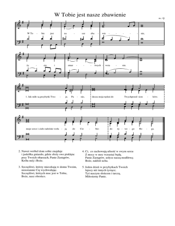 W Tobie jest nasze zbawienie # ˙ & ˙ W To ?# ˙ ˙ - # & ˙˙ ży œ ?# ˙ - œ œœ œœ ˙œ œ bie jest na - œ œ œ œ œ #˙ ˙ œœ ˙œ . œ cie i zmar - œ˙ ˙ # & W W 1. Jak miłe są przybytki Two œœ # ˙˙ - je, œœ sze zba Pa - œ - œ - œ œw œ œ - ˙ - nie, w w ww nie. w w œ ˙ œw - ˙œ œœ œœ nie, dusza moja tęskni do Twychprzed - sion W W œœ œœ œ˙ œœ œœ ˙˙ œœ ˙œ ją do Cie œ œ œ w - W W œœ œ œ wie twych - wsta œ ww œ œ ˙˙ # & W W W W - ˙ œ ˙ œ ˙ ?# - œœ - ?# W W moje serce i ciało radośnie woła - ˙w. œ œ #œ œ œ œ œ œ œ œ œ œœ m.: Q ˙ ˙ ˙˙ œ - ˙˙ œœ œœ bie: do ży - we - go ˙˙ œœ œœ œ œ œ œ 2. Nawet wróbel dom sobie znajduje i jaskółka gniazdo, gdzie złoży swe pisklęta: przy Twoich ołtarzach, Panie Zastępów, Królu mój i Boże. 4. Ci, co zachowują ufność w swym sercu Z mocy w moc wzrastać będą. Panie Zastępów, usłysz naszą modlitwę; Boże, nakłoń ucha. 3. Szczęśliwi, którzy mieszkają w domu Twoim, nieustannie Cię wychwalając. Szczęśliwi, których moc jest w Tobie, Boże, nasz obrońco. 5. Jeden dzień w przybytkach Twoich lepszy niż innych tysiące; Tyś naszym słońcem i tarczą, Miłosierny Panie. Bo ˙˙ ˙˙ œ - œ ków; ˙ ˙ ˙˙ - ga. ˙˙