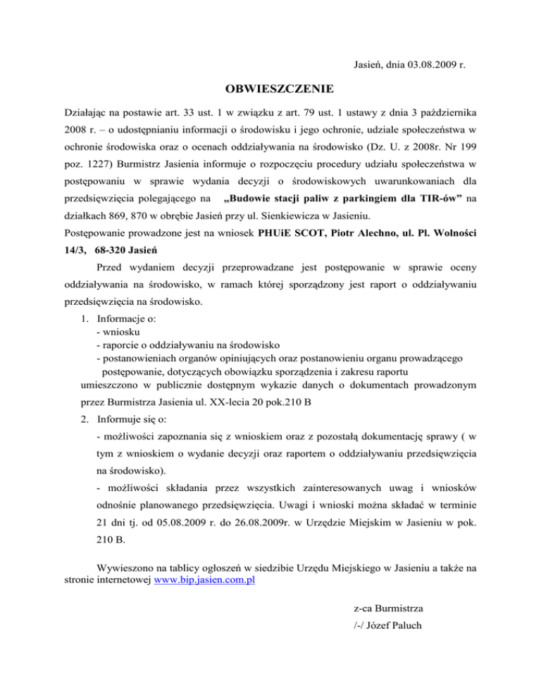 Jasień, dnia 03.08.2009 r. OBWIESZCZENIE Działając na postawie art. 33 ust. 1 w związku z art. 79 ust. 1 ustawy z dnia 3 października 2008 r. – o udostępnianiu informacji o środowisku i jego ochronie, udziale społeczeństwa w ochronie środowiska oraz o ocenach oddziaływania na środowisko (Dz. U. z 2008r. Nr 199 poz. 1227) Burmistrz Jasienia informuje o rozpoczęciu procedury udziału społeczeństwa w postępowaniu w sprawie wydania decyzji o środowiskowych uwarunkowaniach dla przedsięwzięcia polegającego na „Budowie stacji paliw z parkingiem dla TIR-ów” na działkach 869, 870 w obrębie Jasień przy ul. Sienkiewicza w Jasieniu. Postępowanie prowadzone jest na wniosek PHUiE SCOT, Piotr Alechno, ul. Pl. Wolności 14/3, 68-320 Jasień Przed wydaniem decyzji przeprowadzane jest postępowanie w sprawie oceny oddziaływania na środowisko, w ramach której sporządzony jest raport o oddziaływaniu przedsięwzięcia na środowisko. 1. Informacje o: - wniosku - raporcie o oddziaływaniu na środowisko - postanowieniach organów opiniujących oraz postanowieniu organu prowadzącego postępowanie, dotyczących obowiązku sporządzenia i zakresu raportu umieszczono w publicznie dostępnym wykazie danych o dokumentach prowadzonym przez Burmistrza Jasienia ul. XX-lecia 20 pok.210 B 2. Informuje się o: - moŜliwości zapoznania się z wnioskiem oraz z pozostałą dokumentację sprawy ( w tym z wnioskiem o wydanie decyzji oraz raportem o oddziaływaniu przedsięwzięcia na środowisko). - moŜliwości składania przez wszystkich zainteresowanych uwag i wniosków odnośnie planowanego przedsięwzięcia. Uwagi i wnioski moŜna składać w terminie 21 dni tj. od 05.08.2009 r. do 26.08.2009r. w Urzędzie Miejskim w Jasieniu w pok. 210 B. Wywieszono na tablicy ogłoszeń w siedzibie Urzędu Miejskiego w Jasieniu a takŜe na stronie internetowej www.bip.jasien.com.pl z-ca Burmistrza /-/ Józef Paluch