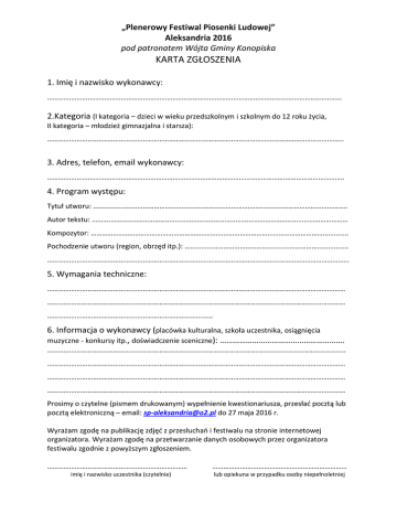 „Plenerowy Festiwal Piosenki Ludowej” Aleksandria 2016 pod patronatem Wójta Gminy Konopiska KARTA ZGŁOSZENIA 1. Imię i nazwisko wykonawcy: ………………….………………………………………………………………………………………………………………………… 2.Kategoria (I kategoria – dzieci w wieku przedszkolnym i szkolnym do 12 roku życia, II kategoria – młodzież gimnazjalna i starsza): …………………………………………………………………………………………………………………………………………….. 3. Adres, telefon, email wykonawcy: ……………….………………………………….…………………………………………………………….………………………….. 4. Program występu: Tytuł utworu: ………………………………………………………………………….…………………………………………….. Autor tekstu: ……….………………………………………………………………………………………………………………… Kompozytor: ………………………………………………………………………………………………………………………….. Pochodzenie utworu (region, obrzęd itp.): …………………………………………………………………………….. ……………………………………………………………………………………………………………………………………………….. 5. Wymagania techniczne: ……………………………………………………………………………………………………………………………………………… ……………………………………………………………………………………………………………………………………………… ……………………………………………………………………………… 6. Informacja o wykonawcy (placówka kulturalna, szkoła uczestnika, osiągnięcia muzyczne - konkursy itp., doświadczenie sceniczne): …………………………………………………. …………………………………………………………………………………………………….……………………………………….. ……………………………………………………………………………………………………………………………………………… ……………………………………………………………………………………………………………………………………………… ……………………………………………………………………………………………………………………………………………… Prosimy o czytelne (pismem drukowanym) wypełnienie kwestionariusza, przesłać pocztą lub pocztą elektroniczną – email: [email protected] do 27 maja 2016 r. Wyrażam zgodę na publikację zdjęć z przesłuchań i festiwalu na stronie internetowej organizatora. Wyrażam zgodę na przetwarzanie danych osobowych przez organizatora festiwalu zgodnie z powyższym zgłoszeniem. ………………………………………….……………………… imię i nazwisko uczestnika (czytelnie) …………….………………………………………………… lub opiekuna w przypadku osoby niepełnoletniej