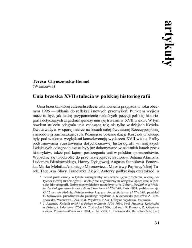 artykuły Teresa Chynczewska-Hennel (Warszawa) Unia brzeska XVII stulecia w polskiej historiografii Unia brzeska, której czterechsetlecie ustanowienia przypada w roku obecnym 1996 — skłania do refleksji i nowych przemyśleń. Punktem wyjścia może tu być, jak sadzę przypomnienie niektórych pozycji polskiej historiografii dotyczących zagadnień genezy unii i jej trwania w XVII wieku1 . W tym bowiem stuleciu odegrała unia znaczącą rolę nie tylko w dziejach Kościołów, zaważyła w sporej mierze na losach całej ówczesnej Rzeczypospolitej i narodów ją zamieszkujących. Późniejsze bolesne dzieje Kościoła unickiego były pod wieloma względami konsekwencją wydarzeń XVII wieku. Próby podsumowania i zestawienia dotychczasowej historiografii w mniejszych i większych odstępach czasu były już dokonywane w ostatnich latach przez historyków, także pod kątem postrzegania unii w polskim społeczeństwie. Wypadnie się tu odwołać do prac następujących autorów: Juliana Atamana, Ludomira Bieńkowskiego, Hanny Dylągowej, Augusta Stanisława Fenczaka, Marka Melnika, Antoniego Mironowicza, Mirosławy Papierzyńskiej-Turek, Tadeusza Śliwy, Franciszka Ziejki2 . Autorzy podkreślają częstokroć, iż 1 2 Temat podniesiony w tytule zasługiwałby na szersze ujęcie problemu, w całej dotychczasowej historiografii. Wiele prac zagranicznych odegrało sporą rolę w polskiej historiografii. Dobrym przykładem może być tu: A. Jobert, De Luther a Mohila. La Pologne dans la crise de la Chretiente 1517-1648, Paris 1974; polska wersja, Od Lutra do Mohyły. Polska wobec kryzysu chrześcijaństwa 1517-1648, przekład E. Sękowska, przedmowa do polskiego wydania J. Kłoczowski, posłowie Z. Libiszowska, Warszawa 1994, Inst. Wydawn. PAX, Oficyna Wydawn. Volumen. J. Ataman, Kościół unicki w Polsce w latach 1596-1696, [w:] Historia Kościołów w Polsce, t. I do roku 1764, cz. 2 od roku 1506, pod red. B. Kumora, Z. Obertyńskiego, Poznań—Warszawa 1974, s. 261-309; L. Bieńkowski, Brzeska Unia, [w:] 31 na postrzeganie unii wyraźny wpływ mają osobiste, pozanaukowe doświadczenia samych piszących, zdeterminowanych przynależnością narodową i w jeszcze większym stopniu — wyznaniową. Ten ostatni czynnik, zdaniem części historyków, ma istotny wpływ na charakter powstających prac. Historiografia polska ery nowożytnej, zapoczątkowująca historyczne rozważania wokół unii brzeskiej, która powstawała w XIX wieku w warunkach braku polskiej państwowości, miała swą wyraźną specyfikę — zdominowana była silnie przez sytuację polityczną. Na wcześniejszy, istniejący w wiekach poprzednich stosunek wyznawców Kościoła rzymskokatolickiego do Cerkwi nałożył się wizerunek jednego z zaborców — prawosławnego cara Rosji. Powstawał w związku z tym pewien schematyczny obraz stosunków wyznaniowych w dawnej Rzeczypospolitej, w którym na plan pierwszy wysuwali się wierni rzymskokatoliccy stojący w obronie nie tylko „prawdziwej wiary” ale też tworzący i zabezpieczający przedmurze chrześcijaństwa (antemurale christianitas). Poczucie wypełnienia tak pojmowanej przez poprzednie stulecia misji miało niewątpliwy wpływ na prace historyków w XIX wieku. Unia brzeska, zdaniem jednego z twórców krakowskiej szkoły historycznej Waleriana Kalinki (1826-1886), utrwalała ducha katolickiego i wytyczała szlak „do dalszego pochodu na Wschód”3 . Co więcej, historyk ten zanegował w istocie jakąkolwiek pozytywną rolę Kościoła prawosławnego w tworzeniu cy- 3 32 Encyklopedia Katolicka, t. II, pod red. F. Gryglewicza, R. Łukaszyka, Z. Sułowskiego, Lublin 1985, s. 1128; tegoż, Organizacja Kościoła Wschodniego w Polsce, [w:] Kościół w Polsce, wieki XVI—XVIII, pod red. J. Kłoczowskiego, t. II, Kraków 1969, s. 781-1034 (do dziejów Kościoła prawosławnego w Rzeczypospolitej autor proponuje pozycje uwzględnione przez: J. Wolińskiego, Polska i Kościół prawosławny. Zarys historyczny, Lwów 1936); H. Dylągowa, Kościół Unicki na ziemiach Rzeczypospolitej 1596-1918. Zarys problematyki, „Przegląd Wschodni”, 1992/93, t. II, z. 2 (6), s. 257-287; A. S. Fenczak, Kościół greckokatolicki w Polsce do roku 1772 jako dzieło swojej epoki (w poszukiwaniu szerszych perspektyw badawczych), [w:] Polska — Ukraina 1000 lat sąsiedztwa, t. II; Studia z dziejów chrześcijaństwa na pograniczu kulturowym i etnicznym, pod red. S. Stępnia, Przemyśl 1994, s. 85108; M . M elnik, Geneza unii brzeskiej w świetle prac syntetycznych w historiografii polskiej po 1945 roku, [w:] Polacy o Ukraińcach, Ukraińcy o Polakach. M ateriały z sesji naukowej pod red. T. Stegnera, Gdańsk 1993, s. 60-69; A. M ironowicz, Podlaskie ośrodki i organizacje prawosławne w XVI i XVII wieku, Białystok 1991, s. 10-62 (rozdz. I Unia brzeska w świetle historiografii); M . Papierzyńska-Turek, Prawosławie i grekokatolicyzm w polskiej historiografii i publicystyce histor ycznej, [w:] Spotkania Polsko-Ukraińskie, redakcja naukowa Z . M ańkowski, Lublin 1992, s . 45-57; T. Śliwka, Kościół unick i w Polsce w latach 1596-1696; Kościół prawosławny w Rzeczypospolitej w latach 1596-1696, [w:] Historia Kościoła w Polsce, s. 259-261; 309-323; F. Ziejka, Czytania podlaskie. Unia i unici w piśmiennictwie polskim na przełomie XIX-XX wieku, [w:] Unia brzeska geneza, dzieje i konsekwencje w kulturze narodów słowiańskich, pod red. R. Łużnego, F. Ziejki, A. Kępińskiego, Kraków 1994, s. 218-237. W. Kalinka, Schyz ma i unia. Dwie konferencje powiedziane w koś ciele P. Maryi w Krakowie 16 i 17 marca 1883 r., Lwów 1883, s. 24. wilizacji. Oto jego słowa: „Odciąty od wspólnego pnia i przez imperatora do maszyny państwowej wcielony, Kościół schizmatycki usechł, zesztywniał, stracił wszelką twórczość i moc rodzajną. I kiedy na Zachodzie, z łona Kościoła, tryskały wciąż nowe prądy cywilizacyjne; kiedy, dzięki miłosnej pracy zakonów, koczują