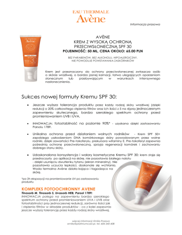 Informacja prasowa AVÈNE KREM Z WYSOKĄ OCHRONĄ PRZECIWSŁONECZNĄ SPF 30 POJEMNOŚĆ: 50 ML, CENA OKOŁO: 65.00 PLN BEZ PARABENÓW, BEZ ALKOHOLU, HIPOALERGICZNY, NIE POWODUJE POWSTAWANIA ZASKÓRNIKÓW Krem jest przeznaczony do ochrony przeciwsłonecznej zwłaszcza osób o skórze wrażliwej, o bardzo jasnej karnacji, łatwo ulegających oparzeniom słonecznym lub przebywającym w warunkach intensywnego nasłonecznienia. Sukces nowej formuły Kremu SPF 30: Jeszcze wyższa tolerancja produktu przez każdy rodzaj skóry wrażliwej (dzięki redukcji o 20% całkowitego stężenia filtrów oraz ich ilości z 5 na 4)przy jednoczesnym zapewnieniu skutecznego, bardzo szerokiego spektrum ochrony przed promieniowaniem UVB i UVA. INNOWACJA: fotostabilność na poziomie 90%* - uzyskana dzięki zastosowaniu Parsolu 1789. Unikalna ochrona przed działaniem wolnych rodników Udoskonalona konsystencja i walory kosmetyczne Kremu SPF 30: krem staje się - Krem SPF 50+ zapobiega uszkodzeniom DNA komórkowego skóry powodowanym przez wolne rodniki, dzięki zawartości Pre-tokoferylu, prekursora witaminy E. Pre-tokoferyl zapewnia pośrednią ochronę przeciwsłoneczną, sprzyja regeneracji komórek i zachowaniu dobrego stanu skóry. przeźroczysty po aplikacji na skórę, nie pozostawia białego nalotu - dzięki usunięciu dwutlenku tytanu (ekran mineralny). Nie pozostawia uczucia lepkości, doskonale się wchłania. Woda termalna Avène działa kojąco i łagodząco na skórę. *po 2h ekspozycji na promieniowanie UV po zastosowaniu produktu KOMPLEKS FOTOOCHRONNY AVENE Tinosorb M, Tinosorb S, Uvasorb HEB, Parsol 1789: INNOWACJA polega na zapewnieniu bardzo szerokiego spektrum ochrony przed promieniowaniem UVA i UVB oraz fotostabilności przy jednoczesnej redukcji, zarówno ilości jak i stężenia filtrów w składzie produktów - co z kolei zapewnia jeszcze wyższą tolerancję przez każdy rodzaj skóry wrażliwej. więcej informacji: Emilia Poszwa [email protected], tel. 604 240 408