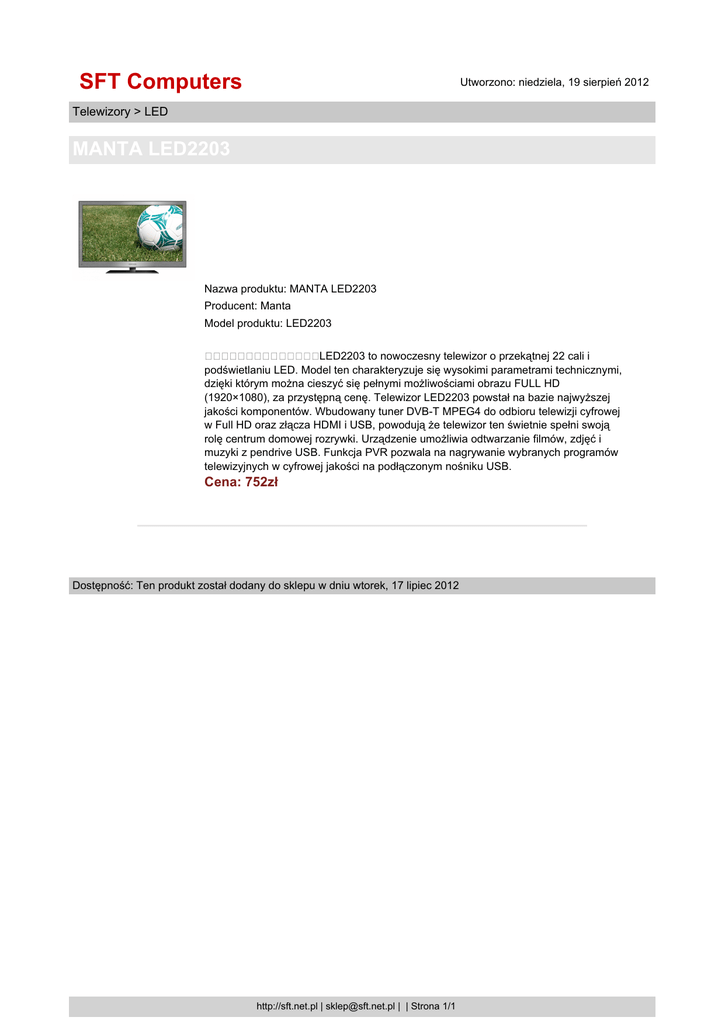 SFT Computers Utworzono: niedziela, 19 sierpień 2012 Telewizory > LED MANTA LED2203 Nazwa produktu: MANTA LED2203 Producent: Manta Model produktu: LED2203 LED2203 to nowoczesny telewizor o przekątnej 22 cali i podświetlaniu LED. Model ten charakteryzuje się wysokimi parametrami technicznymi, dzięki którym można cieszyć się pełnymi możliwościami obrazu FULL HD (1920×1080), za przystępną cenę. Telewizor LED2203 powstał na bazie najwyższej jakości komponentów. Wbudowany tuner DVB-T MPEG4 do odbioru telewizji cyfrowej w Full HD oraz złącza HDMI i USB, powodują że telewizor ten świetnie spełni swoją rolę centrum domowej rozrywki. Urządzenie umożliwia odtwarzanie filmów, zdjęć i muzyki z pendrive USB. Funkcja PVR pozwala na nagrywanie wybranych programów telewizyjnych w cyfrowej jakości na podłączonym nośniku USB. Cena: 752zł Dostępność: Ten produkt został dodany do sklepu w dniu wtorek, 17 lipiec 2012 http://sft.net.pl | [email protected] | | Strona 1/1