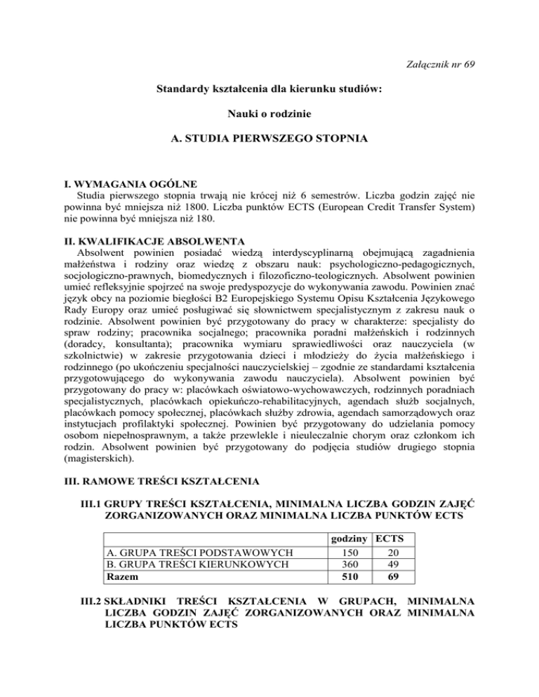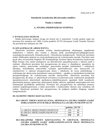 Załącznik nr 69 Standardy kształcenia dla kierunku studiów: Nauki o rodzinie A. STUDIA PIERWSZEGO STOPNIA I. WYMAGANIA OGÓLNE Studia pierwszego stopnia trwają nie krócej niŜ 6 semestrów. Liczba godzin zajęć nie powinna być mniejsza niŜ 1800. Liczba punktów ECTS (European Credit Transfer System) nie powinna być mniejsza niŜ 180. II. KWALIFIKACJE ABSOLWENTA Absolwent powinien posiadać wiedzą interdyscyplinarną obejmującą zagadnienia małŜeństwa i rodziny oraz wiedzę z obszaru nauk: psychologiczno-pedagogicznych, socjologiczno-prawnych, biomedycznych i filozoficzno-teologicznych. Absolwent powinien umieć refleksyjnie spojrzeć na swoje predyspozycje do wykonywania zawodu. Powinien znać język obcy na poziomie biegłości B2 Europejskiego Systemu Opisu Kształcenia Językowego Rady Europy oraz umieć posługiwać się słownictwem specjalistycznym z zakresu nauk o rodzinie. Absolwent powinien być przygotowany do pracy w charakterze: specjalisty do spraw rodziny; pracownika socjalnego; pracownika poradni małŜeńskich i rodzinnych (doradcy, konsultanta); pracownika wymiaru sprawiedliwości oraz nauczyciela (w szkolnictwie) w zakresie przygotowania dzieci i młodzieŜy do Ŝycia małŜeńskiego i rodzinnego (po ukończeniu specjalności nauczycielskiej – zgodnie ze standardami kształcenia przygotowującego do wykonywania zawodu nauczyciela). Absolwent powinien być przygotowany do pracy w: placówkach oświatowo-wychowawczych, rodzinnych poradniach specjalistycznych, placówkach opiekuńczo-rehabilitacyjnych, agendach słuŜb socjalnych, placówkach pomocy społecznej, placówkach słuŜby zdrowia, agendach samorządowych oraz instytucjach profilaktyki społecznej. Powinien być przygotowany do udzielania pomocy osobom niepełnosprawnym, a takŜe przewlekle i nieuleczalnie chorym oraz członkom ich rodzin. Absolwent powinien być przygotowany do podjęcia studiów drugiego stopnia (magisterskich). III. RAMOWE TREŚCI KSZTAŁCENIA III.1 GRUPY TREŚCI KSZTAŁCENIA, MINIMALNA LICZBA GODZIN ZAJĘĆ ZORGANIZOWANYCH ORAZ MINIMALNA LICZBA PUNKTÓW ECTS A. GRUPA TREŚCI PODSTAWOWYCH B. GRUPA TREŚCI KIERUNKOWYCH Razem godziny ECTS 150 20 360 49 510 69 III.2 SKŁADNIKI TREŚCI KSZTAŁCENIA W GRUPACH, MINIMALNA LICZBA GODZIN ZAJĘĆ ZORGANIZOWANYCH ORAZ MINIMALNA LICZBA PUNKTÓW ECTS A. GRUPA TREŚCI PODSTAWOWYCH Treści kształcenia w zakresie: 1. Filozofii i etyki 2. Psychologii 3. Socjologii 2. Pedagogiki B. GRUPA TREŚCI KIERUNKOWYCH Treści kształcenia w zakresie: 1. Wiedzy o rodzinie w kontekście naukowym 2. Wiedzy o rodzinie w kontekście praktyki społecznej godziny ECTS 150 20 60 30 30 30 360 49 III.3 WYSZCZEGÓLNIENIE TREŚCI I EFEKTÓW KSZTAŁCENIA A. GRUPA TREŚCI PODSTAWOWYCH 1. Kształcenie w zakresie filozofii i etyki Treści kształcenia: Podstawowe pojęcia i zagadnienia filozofii. Główne kierunki i orientacje filozoficzne na przestrzeni dziejów. Istota poznania, sposoby interpretacji rzeczywistości. Zagadnienie prawdy. Filozoficzne i teologiczne rozumienie świata, człowieka i Boga. Struktura, właściwości, przyczyny, analogie i normatywny wymiar bytu. Kultura jako specyficzny sposób wyraŜania się ludzkiej natury. Filozoficzne ujęcie nauczania i wychowania. Elementy filozofii przyrody oŜywionej. Etyka a inne nauki o moralności. Personalistyczna norma moralności. Źródła moralności czynu ludzkiego. Zagadnienia prawa naturalnego i sumienia. Godność i integralność osoby ludzkiej. Moralny wymiar płciowości człowieka. Podstawowe zasady i normy bioetyczne. Zjawiska kulturowe wobec rozwoju człowieka i rodziny. Efekty kształcenia – umiejętności i kompetencje: rozumienia podstawowych pojęć filozoficznych; krytycznej interpretacji rzeczywistości; rozumienia człowieka jako bytu osobowego; filozoficznego pojmowania nauczania i wychowania; określania norm postępowania; oceny zjawisk kulturowych; identyfikowania, analizowania i rozwiązywania dylematów moralnych. 2. Kształcenie w zakresie psychologii Treści kształcenia: Psychologia jako nauka o człowieku. Główne nurty w psychologii. Biologiczne podstawy psychiki człowieka. Pojęcie procesów psychicznych. Procesy poznawcze w kategoriach odbioru i przetwarzania informacji. Percepcja, myślenie i rozwiązywanie problemów. Pamięć. Uczenie się – elementarne i złoŜone formy uczenia się. Emocje. Motywacje. Osobowość – podstawowe koncepcje, struktura osobowości. RóŜnice indywidualne – inteligencja, temperament, styl poznawczy. Poznawanie innych i samego siebie. Psychologiczne i biologiczne ujęcie rozwoju człowieka. Efekty kształcenia – umiejętności i kompetencje: rozumienia róŜnych nurtów psychologii i koncepcji człowieka; studiowania i analizowania literatury psychologicznej; identyfikowania procesów psychicznych i mechanizmów funkcjonowania człowieka; wykorzystywania wiedzy z zakresu psychologii w edukacji; posługiwania się metodami poznawania nauczanych; samopoznania i samodoskonalenia; określania róŜnic indywidualnych i wynikających z nich implikacji dla wychowania i kształcenia. 2 3. Kształcenie w zakresie socjologii Treści kształcenia: Geneza, istota i rozwój socjologii. Teorie socjologiczne. Teorie wpływu społecznego. Elementy oraz rodzaje struktur społecznych – ich znaczenie w Ŝyciu społecznym jednostek. Środowisko społeczne – kręgi społeczne, wspólnoty, społeczności lokalne. Grupy społeczne, grupy przynaleŜności i grupy odniesienia – struktura grup, układ ról. Teoria roli społecznej. Interakcje społeczne – symboliczna natura ludzkich interakcji, klasyfikacja podczas interakcji, interakcje z grupami odniesienia i nieobecnymi. Konflikty społeczne i sposoby ich rozwiązywania. Efekty kształcenia – umiejętności i kompetencje: dostrzegania, analizowania i interpretowania róŜnych zjawisk społecznych; wykorzystywania wiedzy socjologicznej oraz procedur badawczych do diagnozowania i wyjaśniania proble
