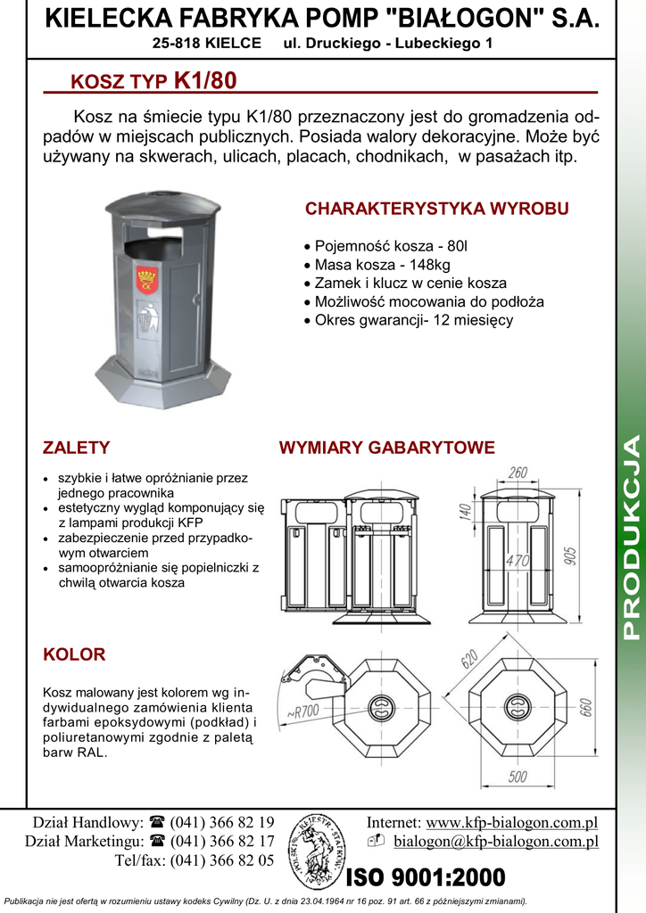 KOSZ TYP K1/80 Kosz na śmiecie typu K1/80 przeznaczony jest do gromadzenia odpadów w miejscach publicznych. Posiada walory dekoracyjne. Może być używany na skwerach, ulicach, placach, chodnikach, w pasażach itp. CHARAKTERYSTYKA WYROBU · Pojemność kosza - 80l · Masa kosza - 148kg · Zamek i klucz w cenie kosza · Możliwość mocowania do podłoża · Okres gwarancji- 12 miesięcy ZALETY WYMIARY GABARYTOWE · szybkie i łatwe opróżnianie przez jednego pracownika · estetyczny wygląd komponujący się z lampami produkcji KFP · zabezpieczenie przed przypadkowym otwarciem · samoopróżnianie się popielniczki z chwilą otwarcia kosza KOLOR Kosz malowany jest kolorem wg indywidualnego zamówienia klienta farbami epoksydowymi (podkład) i poliuretanowymi zgodnie z paletą barw RAL. Dział Handlowy: ( (041) 366 82 19 Dział Marketingu: ( (041) 366 82 17 Tel/fax: (041) 366 82 05 Internet: www.kfp-bialogon.com.pl - [email protected] Publikacja nie jest ofertą w rozumieniu ustawy kodeks Cywilny (Dz. U. z dnia 23.04.1964 nr 16 poz. 91 art. 66 z późniejszymi zmianami).