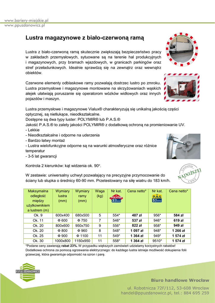 Lustra magazynowe z biało-czerwoną ramą Lustra z biało-czerwoną ramą skutecznie zwiększają bezpieczeństwo pracy w zakładach przemysłowych, sytuowane są na terenie hal produkcyjnych i magazynowych, przy bramach wjazdowych, w granicach parkingów oraz stref przeładunkowych. Idealnie sprawdzą się na zewnątrz oraz wewnątrz obiektów. Czerwone elementy odblaskowe ramy pozwalają dostrzec lustro po zmroku. Lustra przemysłowe i magazynowe montowane na skrzyżowaniach wąskich alejek ułatwiają poruszanie się operatorom wózków widłowych oraz innych pojazdów i maszyn. Lustra przemysłowe i magazynowe Vialux® charakteryzują się unikalną jakością części optycznej, są nietłukące, nieodkształcalne. Dostępne są dwa typy luster: POLYMIR® lub P.A.S.® Jakość P.A.S.® to zalety jakości POLYMIR® z dodatkową ochroną na promieniowanie UV. - Lekkie - Nieodkształcalne i odporne na uderzenia - Bardzo łatwy montaż - Lustra wielofunkcyjne odporne są na warunki atmosferyczne oraz różnice temperatur - 3-5 lat gwarancji Kontrola 2 kierunków: kąt widzenia ok. 90o. W zestawie: uniwersalny uchwyt pozwalający na precyzyjne przymocowanie do ściany lub słupka o średnicy 60-90 mm. Przetestowany na siłę wiatru do 183 km/h. Maksymalna odległość między użytkownikiem a lustrem (m) Ok. 9 Ok. 11 Ok. 20 Ok. 20 Ok. 25 Ok. 30 Wymiary lustra (mm) Wymiary ramy (mm) Waga (kg) Nr kat. Cena netto* Nr kat. Cena netto* 600x400 Ф 600 800x600 Ф 800 Ф 900 1000x800 680x500 Ф 750 950x750 Ф 960 Ф 1100 1150x950 5 7 9 8 11 11 554* 546* 556* 548* 549* 558* 487 zł 537 zł 822 zł 1 097 zł 1 364 zł 1 364 zł 956* 946* 958* 948* 949* 9510* 584 zł 619 zł 949 zł 1 266 zł 1 574 zł 1 574 zł *Podane ceny zawierają rabat 23%. W przypadku większych zamówień udzielamy korzystnych rabatów! Dodatkowa ochrona za pomocą ogrzewania elektrycznego: do każdego lustra istnieje możliwość dokupienia folii grzewczej, która gwarantuje odporność na szron i parę.
