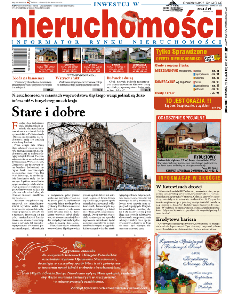 zł w tym VAT 22% � � � � � � � � � �� � � � � � �� � � � � � � � � � � � � � � Tylko Sprawdzone OFERTY NIERUCHOMOŚCI KOZY CENA 860 000 zł Oferta Nr 44A418 tel. 501 751 606 KATOWICE CENA 210 000 zł ŻYWIEC CENA 320 000 zł Oferta Nr 44A411 tel. 502 229 595 Oferta Nr 1A624 tel. 694 469 899 W TYM WYDANIU M.IN.: Moda na kamienice Wzmożony obrót kamienicami i ciągłe zainteresowanie przygotowywanymi transakcjami. str. 2 Wszyscy i nikt Znalezienie nabywcy na nieruchomość polega na dotarciu do tego jednego jedynego klienta. str. 4 ŚWINNA CENA 140 000 zł Oferta Nr 1A583 tel. 694 469 899 ŁODYGOWICE CENA 65 000 zł Oferta Nr 1A453 tel. 694 469 901 Budynek z duszą Obok nowych budowli niesamowitym zainteresowaniem klientów cieszą się obiekty poprzemysłowe, które stają str. 6 się tzw. „loftami”. Nieruchomości w miastach województwa śląskiego wciąż jednak są dużo tańsze niż w innych regionach kraju Stare i dobre Oferty z regionu Śląska: MIESZKANIOWE wg regionów: bielski - str. 11 częstochowski - str. 14 katowicki - str. 15 KOMERCYJNE wg regionów: bielski - str. 13 częstochowski - str. 14 katowicki - str. 19 Oferty z kraju: - str. 23 TO JEST OKAZJA !!! Szybko, bezpiecznie, z zyskiem! str 24 F atalny stan techniczny wielu śródmiejskich kamienic nie przeszkadza inwestorom w zakupie kolejnych obiektów. Po Katowicach i Bielsku śródmiejskie nieruchomości stają się atrakcją wielu innych miast. Przez długie lata Górny Śląsk uchodził wśród inwestorów zainteresowanych nieruchomościami, za mało atrakcyjny zakątek Polski. Ta sytuacja zmienia się coraz bardziej dynamicznie. W Katowicach, Chorzowie, czy Sosnowcu coraz bardziej doskwierać zaczyna brak nowoczesnych powierzchni biurowych. Nic więc dziwnego, że śródmiejskie kamienice stały się łakomym kąskiem umożliwiającym realizacje wielu ciekawych pomysłów. Budynki zagospodarowywane są już nie tylko na cele mieszkalne, ale również biurowe, handlowe, czy hotelowe. Zdaniem specjalistów zajmujących się nieruchomościami wyraźnie widać już, że na terenie województwa śląskiego pojawili się inwestorzy z zewnątrz. Interesują się nie tylko zamieszkałymi kamienicami, ale również niszczejącymi i od wielu lat niewykorzystywanymi obiektami poprzemysłowymi. Mieszkania R RYDUŁTOWY Powierzchnia użytkowa: 112 m2; Powierzchnia działki: 857m2 Nowy dom parterowy z poddaszem mieszkalnym, podpiwniczony. Parter domu zmieniony na lokal gastronomiczny. Cena 475 000 zł KONTAKT: STANISŁAW DOMIAN tel.(32) 4562183 INFORMACJE W SKRÓCIE W Katowicach drożej w budynkach, gdzie jeszcze niedawno przygotowywali się do pracy górnicy, czy hutnicy stanowią dzisiaj modną ofertę rynkową. Problemem na razie jest tylko bardzo wysoka cena, która zawierać musi nie tylko koszty renowacji całych obiektów, ale również aranżacji bardzo dużych powierzchni jakie są tam do zagospodarowania. Nieruchomości w miastach województwa śląskiego wciąż E K W trzecim kwartale 2007 roku ceny na rynku wtórnym, podobnie jak na rynku pierwotnym, ustabilizowały się. Najwcze2 Parterowy. Pow. 60 m , działka 464 m2. 2 pokoje, duża cyjnych punktach. Zdaje się jedśniej dynamikę utraciła Warszawa. Od maja ceny ofert sprzekuchnia z oknem, nak, że czasy „urawniłowki” też łazienka z WC. Ogrzewanie piecowe. daży zmieniały się tu w tempie zaledwie 0%-1%. Ceny w PoDo remontu. Garaż wolnostojący. mamy już za sobą. Pośrednicy znaniu dopiero w lipcu przestały rosnąć i ustabilizowały się dostają w tej sprawie jasne syna poziomie 6,1 tys. zł/m2. Indeksy cen w Krakowie, Trójmiegnały od kupujących. Oczywiście i Wrocławiu pokazują wręcz nieśmiałą tendencję spadście mieszkania w wielkiej płykową. Jedynie w Katowicach październik przyniósł podwyżki cie będą miały jeszcze przez cen mieszkań. długi czas swoich nabywców, ale warunek przeprowadzenia udanej transakcji musi być jasny: metr kwadratowy podłogi Coraz większa jest grupa Polaków, których stać na zaciąganie może być jedynym elenie kredytów hipotecznych. Tym niemniej i tak ponad połowa mentem ustalonej ceny. naszych rodaków zarabia mniej niż bariera ustanowiona. jednak są dużo tańsze niż w innych regionach kraju. Dzieje się tak dlatego, że jest tu sporo mieszkań usytuowanych w blokowiskach, budowanych najczęściej z wielkiej płyty w latach sześćdziesiątych i siedemdziesiątych. Do tej pory ich właściciele wystawiając na sprzedaż zajmowane mieszkanie, żądali cen porównywalnych z obiektami budowanymi z cegły i zlokalizowanymi w bardzo atrakL A Kredytowa bariera M A ?einim ein ęiC ajzako eŻ CENA: 3 ZAMÓW GAZETĘ W SWOIM KIOSKU Z PRASĄ Grudzień 2007 Nr 12 (112) Polskiej Federacji Rynku Nieruchomości POD PATRONATEM: Bielsko - Częstochowsko - Katowickie Stowarzyszenia Pośredników w Obrocie Nieruchomościami CHESZ MIEĆ PEWNOŚĆ, Że okazja Cię nie minie? Że okazja Cię nie minie? Nagroda Medialna TRENDY Grudzień 12/2007 (112) Mieszkania: AKTUALNIE W OFERCIE: 276 mieszkań w tym: 1 pokojowych - 42 oferty 2 pokojowych - 96 ofert 3 pokojowych - 97 ofert 4 pokojowych - 35 ofert 5 pokojowych> - 5 ofert Najtańsze w ofercie: 48.000 zł 2-pokojowe 40,50 m2 w Wieprzu pow. żywiecki Najdroższe w ofercie: 850.000 zł 5-pokojowe 159 m2 Bielsko-Biała z-B w cenie ok. 120.000 zł – skrócone przykłady z bieżącej oferty www.son.pl Mieszkania CHORZÓW – 2 pok. pow. 50 m2 Bardzo dobrze skomunikowana lokalizacja. Mieszkanie 2-pokojowe, z niskimi kosztami eksploatacji. Spokojna okolica. 9 piętro. BYTOM – 2 pok. pow. 58 m2 Piętro I. Atrakcyjne mieszkanie dwupokojowe w dzielnicy Stroszek. Super wygodne i komfortowe, po remoncie. (...) (...) ZABRZE – 2 pok. pow. 45 m2 Rozkładowe mieszkanie, położone w spokojnej zielonej dzielnicy Zabrza - k/ stadionu Górnika Zabrze. I piętro w kamienicy. Dwa ustawne pokoje z osobnymi wej