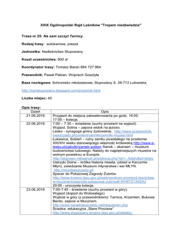 XXIX Ogólnopolski Rajd Leśników "Tropem niedźwiedzia" Trasa nr 25: Na sam szczyt Tarnicy. Rodzaj trasy: autokarowa, piesza Jednostka: Nadleśnictwo Stuposiany Koszt uczestnictwa: 800 zł Koordynator trasy: Tomasz Baran 664 727 964 Przewodnik: Paweł Pabian, Wojciech Gosztyła Baza noclegowa: Schronisko młodzieżowe, Stuposiany 9, 38-713 Lutowiska, http://ssmstuposiany.blogspot.com/p/cennik.html Liczba miejsc: 40 Opis trasy: Dzień 21.06.2016 22.06.2016 23.06.2016 Opis Przyjazd do miejsca zakwaterowania po godz. 16:00. 17:00 – kolacja. 7:00 – 7:30 – śniadanie (suchy prowiant na wyjazd). Wyjazd. Solina – zapora widok na jezioro. Lesko - synagoga gminy żydowskiej , http://www.przewodnikbieszczady.pl/content/cenniki/cenniki-muzea.html Łukawica, Sobień – ruiny zamku powstałego na przełomie XIII/XIV wieku stanowiącego własność królewską http://www.elesko.pl/zabytki/zamek-sobien Sanok – skansen – muzeum budownictwa ludowego. Należy do najpiękniejszych muzeów na wolnym powietrzu w Europie. http://skansen.mblsanok.pl/a/strona.php?dir=../bilety&id=bilety Ustrzyki Dolne – krótka historia miasta, (obiad w Karczmie Młyn), zwiedzanie Muzeum młynarstwa i wsi MŁYN. http://mlynbieszczady.pl/ Spacer do Pokazowej Zagrody Żubrów. http://www.krosno.lasy.gov.pl/web/centrum-promocji-lesnictwaw-mucznem/zagroda-pokazowa-zubrow#.WH9TZ1XhDIU 20:00 - uroczysta kolacja. 7:00-7:45 - śniadanie (suchy prowiant w góry). Wyjazd (dojazd do Wołosatego) Wyjście w góry (z przewodnikiem): Tarnica, Krzemień, Bukowe Berdo, zejście w Mucznem. http://www.twojebieszczady.net/regulamin.php Ścieżka edukacyjna „Stare Procisne” http://www.stuposiany.krosno.lasy.gov.pl/obiekty- 24.06.2016 edukacyjne#.WH9DLlXhDIU Zwiedzanie Pawilonu Wystawowego przy Centrum Promocji Leśnictwa w Mucznem. 20:00 - uroczysta kolacja. 9:00-9:30 – Śniadanie Przyjazd do MOSiR w Sanoku. http://www.mosir-sanok.pl/ 13:00 – 22:00 podsumowanie Rajdu. Stuposiany 25: Na sam szczyt Tarnicy https://drive.google.com/open?id=1UG4FpkqacaigDM0PZkglocNUaM8&usp=sharing