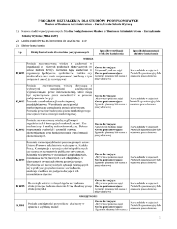 PROGRAM KSZTAŁCENIA DLA STUDIÓW PODYPLOMOWYCH Master of Business Administration - Zarządzanie Szkoła Wyższą 1) Nazwa studiów podyplomowych: Studia Podyplomowe Master of Business Administration - Zarządzanie Szkołą Wyższa (MBA ZSW) 2) Liczba punktów ECTS konieczna do uzyskania: 110 3) Efekty kształcenia: Lp. Sposób weryfikacji efektów kształcenia Efekty kształcenia dla studiów podyplomowych Sposób dokumentacji efektów kształcenia WIEDZA Posiada zaawansowaną wiedzę z zachowań w organizacji o różnych podłożach historycznych (w Ocena formująca: sensie historii firmy), rozróżnia typy zachowań w Aktywność podczas zajęć K_W01 organizacji (polityczne, symboliczne, ludzkie czy Ocena podsumowująca: strukturalne) oraz może rozpoznawać problemy z tym Egzamin pisemny lub ocena z pracy domowej związane i umieć je rozwiązywać Karta udziału w zajęciach Protokół egzaminacyjny lub oceniona praca domowa Posiada zaawansowaną wiedzę dotyczącą z wybranymi narzędziami analitycznymi wypracowanymi przez mikroekonomię, które mogą być wykorzystane przez menedżerów w procesie Ocena formująca: podejmowania decyzji. Aktywność podczas zajęć Karta udziału w zajęciach Protokół egzaminacyjny lub K_W02 Poznanie zasad orientacji marketingowej Ocena podsumowująca: Egzamin pisemny lub ocena z oceniona praca domowa przedsiębiorstwa. Wyrobienie umiejętności pracy domowej marketingowego zarządzania przedsiębiorstwem. Poznanie procedur budowania planu marketingowego oraz opracowania strategii marketingowej. Posiada zaawansowaną wiedzę o głównych zagadnieniach i koncepcjach makroekonomii. Zna mechanizmy i analizę makroekonomiczną. Dobrze K_W03 rozpoznanje trudności i czynniki wzrostu ekonomicznego oraz funkcjonowanie transformacji ekonomicznych. Rozumie niekompatybilności poszczególnych ustaw: Ustawa Prawo o szkolnictwie wyższym vs. Kodeks Pracy, Konstytucja a sytuacja szkół niepublicznych czy ustawa o partnerstwie publiczno-prywatnym. Rozumie rolę prawa w stosunkach gospodarczych, rozumienia norm prawnych i ich interpretacji w K_W04 klasycznych sytuacjach obrotu gospodarczego . Wychodząc od rzeczywistych sytuacji zdarzających się w praktyce gospodarowania i zarządzania, analizuje możliwe do podjęcia decyzje i ich uzasadnienia etyczne K_W05 Ma rozległa wiedze z róznych typów zarządzania strategicznego, badania otoczenia firmy i budowy gruop strategicznych i Ocena formująca: Aktywność podczas zajęć Ocena podsumowująca: Egzamin pisemny lub ocena z pracy domowej Karta udziału w zajęciach Protokół egzaminacyjny lub oceniona praca domowa Ocena formująca: Aktywność podczas zajęć Ocena podsumowująca: Egzamin pisemny lub ocena z pracy domowej Karta udziału w zajęciach Protokół egzaminacyjny lub oceniona praca domowa Ocena formująca: Aktywność podczas zajęć Ocena podsumowująca: Egzamin pisemny lub ocena z pracy domowej Karta udziału w zajęciach Protokół egzaminacyjny lub oceniona praca domowa UMIEJĘTNOŚCI K_U01 Posiada umiejętności przywódcze słuchaczy w oparciu o wybrany model Ocena formująca: Aktywność podczas zajęć Ocena podsumowująca: Egzamin pisemny lub ocena z Karta udziału w zajęciach Protokół egzaminacyjny lub oceniona praca domowa 1 pracy domowej K_U02 Rozpoznaje, różne typy zarządzania strategicznego w zależności od bieżących potrzeb firmy Ocena formująca: Aktywność podczas zajęć Ocena podsumowująca: Egzamin pisemny lub ocena z pracy domowej Umie "czytać" i interpretować informacji o sytuacji Ocena formująca: majątkowej i finansowej podmiotu gospodarczego Aktywność podczas zajęć K_U03 zawartych w sprawozdaniu finansowym oraz w Ocena podsumowująca: Egzamin pisemny lub ocena z księgach rachunkowych. Karta udziału w zajęciach Protokół egzaminacyjny lub oceniona praca domowa Karta udziału w zajęciach Protokół egzaminacyjny lub oceniona praca domowa pracy domowej Ocena formująca: Aktywność podczas zajęć Ocena podsumowująca: Egzamin pisemny lub ocena z pracy domowej Karta udziału w zajęciach Protokół egzaminacyjny lub oceniona praca domowa Umie podchodzić strategicznie do systemu zarządzania zasobami ludzkimi (ZZL) swojej firmy, Ocena formująca: Rozumie jak ZZL wpływa na przewagę Aktywność podczas zajęć K_U05 Ocena podsumowująca: konkurencyjną przedsiębiorstwa, umie zmierzyć Egzamin pisemny lub ocena z wydajność systemu ZZL w przedsiębiorstwie. pracy domowej Karta udziału w zajęciach Protokół egzaminacyjny lub oceniona praca domowa K_U04 Umie ocenić sytuację przedsiębiorstwa z punktu widzenia finansów. Potrafi przeprowadzać procedure oceny efektywności inwestycji Ocena formująca: Aktywność podczas zajęć Ocena podsumowująca: Egzamin pisemny lub ocena z pracy domowej Ocena formująca: Umie zbudowac podstawy strategii przedsiębiorstwa Aktywność podczas zajęć na podstawie analizy SWAT, TOWS i macierzy Ocena podsumowująca: Egzamin pisemny lub ocena z BCC. pracy domowej Umie występować publiczne, komunikować się K_U06 niewerbalnie i negocjować K_U07 Karta udziału w zajęciach wykładowych Protokół egzaminacyjny lub oceniona praca domowa Karta udziału w zajęciach Protokół egzaminacyjny lub oceniona praca domowa KOMPETENCJE INTERPERSONALNE I SPOŁECZNE K_K01 Przejawia otwartą i aktywną postawę wobec personelu. Ma cechy przywódcze. Umie integrować działania róznych pionów struktury zarządzania K_K02 Wykazuje wrażliwość etyczną w rozważaniu problemów prawnych i ekonomicznych działania firmy. K_K03 Posiada umiejętność dostrzegania i uwzględniania różnic pomiędzy kulturami, zwłaszcza w dziedzinie zarządzania zasobami ludzkimi oraz marketingu. Rozumie istotę i zasady negocjacji. K_K04 Jest gotowy do współpracy ze specjalistami zewnętrznymi dla szkoły wyższej reprezentującymi różne dziedziny nowoczesnego zarządzani(outsourcing, audyt, leasing) K_K05 Ma świadomość że najważniejszym