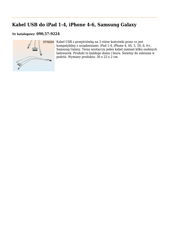 Kabel USB do iPad 1-4, iPhone 4-6, Samsung Galaxy Nr katalogowy: 090,57-9224 Kabel USB z przejściówką na 3 różne końcówki przez co jest kompatybilny z urządzeniami: iPad 1-4, iPhone 4, 4S, 5, 5S, 6, 6+, Samsung Galaxy. Teraz wystarczy jeden kabel zamiast kilku osobnych ładowarek. Produkt to każdego domu i biura. Świetny do zabrania w podróż. Wymiary produktu: 30 x 23 x 2 cm.