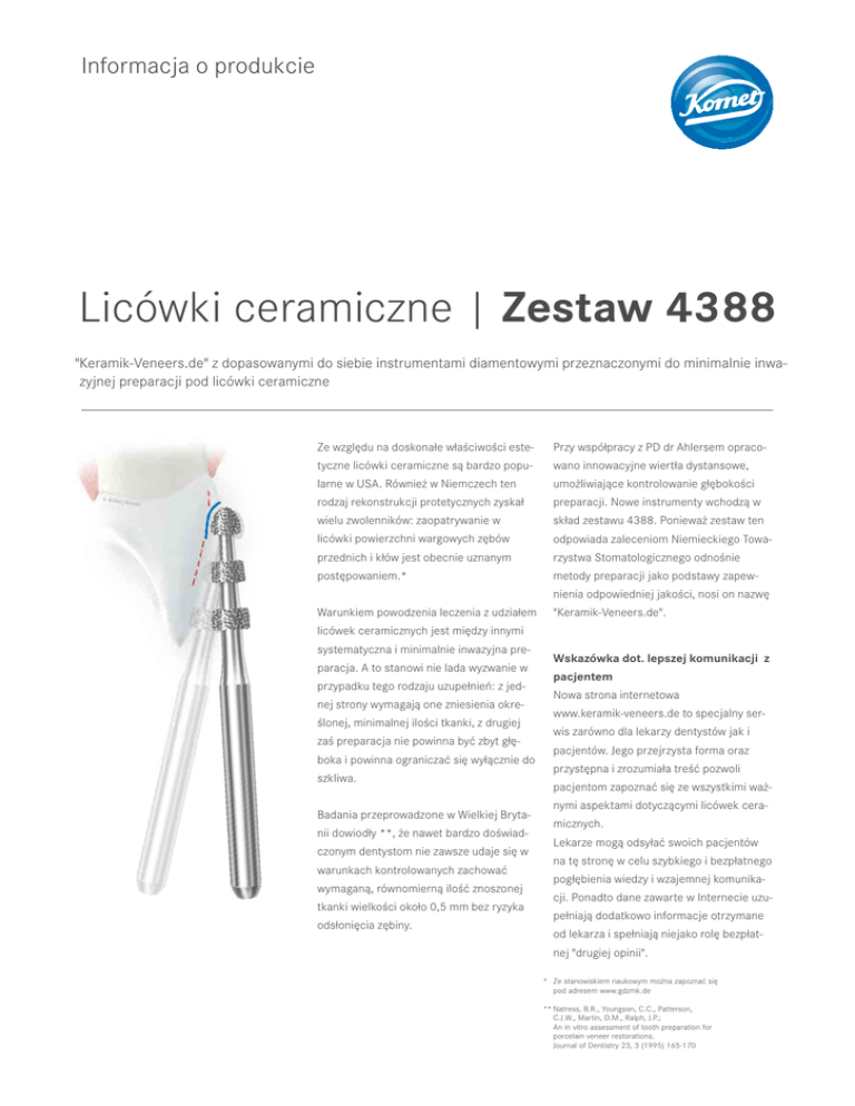 Informacja o produkcie Licówki ceramiczne | Zestaw 4388 "Keramik-Veneers.de" z dopasowanymi do siebie instrumentami diamentowymi przeznaczonymi do minimalnie inwazyjnej preparacji pod licówki ceramiczne Ze względu na doskonałe właściwości este- Przy współpracy z PD dr Ahlersem opraco- tyczne licówki ceramiczne są bardzo popu- wano innowacyjne wiertła dystansowe, larne w USA. Również w Niemczech ten umożliwiające kontrolowanie głębokości rodzaj rekonstrukcji protetycznych zyskał preparacji. Nowe instrumenty wchodzą w wielu zwolenników: zaopatrywanie w skład zestawu 4388. Ponieważ zestaw ten licówki powierzchni wargowych zębów odpowiada zaleceniom Niemieckiego Towa- przednich i kłów jest obecnie uznanym rzystwa Stomatologicznego odnośnie postępowaniem.* metody preparacji jako podstawy zapewnienia odpowiedniej jakości, nosi on nazwę Warunkiem powodzenia leczenia z udziałem "Keramik-Veneers.de". licówek ceramicznych jest między innymi systematyczna i minimalnie inwazyjna preparacja. A to stanowi nie lada wyzwanie w przypadku tego rodzaju uzupełnień: z jednej strony wymagają one zniesienia określonej, minimalnej ilości tkanki, z drugiej zaś preparacja nie powinna być zbyt głęboka i powinna ograniczać się wyłącznie do szkliwa. Badania przeprowadzone w Wielkiej Brytanii dowiodły **, że nawet bardzo doświadczonym dentystom nie zawsze udaje się w warunkach kontrolowanych zachować wymaganą, równomierną ilość znoszonej tkanki wielkości około 0,5 mm bez ryzyka odsłonięcia zębiny. Wskazówka dot. lepszej komunikacji z pacjentem Nowa strona internetowa www.keramik-veneers.de to specjalny serwis zarówno dla lekarzy dentystów jak i pacjentów. Jego przejrzysta forma oraz przystępna i zrozumiała treść pozwoli pacjentom zapoznać się ze wszystkimi ważnymi aspektami dotyczącymi licówek ceramicznych. Lekarze mogą odsyłać swoich pacjentów na tę stronę w celu szybkiego i bezpłatnego pogłębienia wiedzy i wzajemnej komunikacji. Ponadto dane zawarte w Internecie uzupełniają dodatkowo informacje otrzymane od lekarza i spełniają niejako rolę bezpłatnej "drugiej opinii". * Ze stanowiskiem naukowym można zapoznać się pod adresem www.gdzmk.de ** Natress, B.R., Youngson, C.C., Patterson, C.J.W., Martin, D.M., Ralph, J.P.; An in vitro assessment of tooth preparation for porcelain veneer restorations. Journal of Dentistry 23, 3 (1995) 165-170 Licówka na powierzchni wargowej zęba przedniego 1. Przy użyciu nowych wierteł dystansowych 868B.314.018/020 należy naj- 1 5 5. Tkankę twardą znajdującą się między rowkami orientacyjnymi znosi się przy pierw wypreparować rowki retencyjne użyciu wiertła diamentowego w kształcie na powierzchni wargowej, rozpoczyna- stożka 868.314.016. Wzajemne dopa- jąc od części przyszyjkowej. sowanie kształtu wiertła dystansowego oraz wiertła diamentowego znacznie 2. Wąsie elementy wiertła z nasypem diamentowym umożliwiają bezproblemowe wykonanie rowków retencyjnych ułatwia ten etap postępowania. Dzięki 2 6 bez ryzyka wytworzenia nadmiernego skróconej części roboczej wiertła diamentowego jego obrót jest bardzo spokojny. ciepła. 6. W zestawie znajduje się również finir 3. Stożkowy kształt części roboczej diamentowy (8868.314.016) o kształcie wiertła oraz jego zaokrąglony wierzcho- odpowiadającym wiertłu diamento- łek zapobiegają przekroczeniu przewidzianej głębokości preparacji nawet w 3 7 przypadku zbyt stromej pozycji. wemu. Umożliwia on ostrożne wygładzenie powierzchni, zgodnie z wymaganiami dla tego typu uzupełnień. 4. Rowki orientacyjne definiują wymaganą, maksymalną ilość znoszonej 7. Instrument o mniejszej średnicy tkanki określając tym samym głębokość (868.314.012) przeznaczony jest do ostatecznej preparacji. 4 preparacji powierzchni stycznych oraz preparacji mniejszych zębów, zwłaszcza w odcinku przedni żuchwy. Również to wiertło ma swój odpowiednik w postaci finira 8868.314.012. Przed: Ząb sieczny wymagający rekonstrukcji Po: Ząb sieczny z licówką ceramiczną in situ Licówka na powierzchni Wskazówki dot. stosowania: podniebiennej kła 1. Leczenie zaburzeń czynnościowych wymaga niekiedy odbudowy nadmiernie • Zaleca się stosowanie przede wszyst- 1 kim w czerwonej kątnicy przy zacho- startych kolców siecznych kłów.* waniu liczby obrotów podanej na Preparację typu chamfer na całym opakowaniu. obwodzie można przeprowadzić przy • Należy zawsze pracować z wystarcza- użyciu wiertła w kształcie jajka jącym chłodzeniem sprayem wodnym 379.314.023 z typowym dla instrumentów firmy Komet, eliptycznie zaokrąglonym "wierzchołkiem". (co najmniej 50 ml/min.) 2 2. Również i tutaj mamy do dyspozycji finir diamentowy w kształcie jajka 8379.314.023 o odpowiednio dopasowanym kształcie, umożliwiający odpowiednie wygładzenie preparacji, a zwłaszcza przejścia do brzegu siecz- 3 nego. 3. Łagodny, ale wyraźny stopień typu chamfer zapobiega powstaniu zbyt delikatnych krawędzi uzupełnień ceramicznych cementowanych na powierzchni podniebiennej. Eliptyczny "wierzchołek" finiru pozwala na preparację w centralnej części powierzchni podniebiennej delikatnego rowka jako elementu pomocniczego podczas cementowania licówki. Przed: Abrazja kła Po: Rekonstrukcja powierzchni czynnościowej kła *Ze stanowiskiem naukowym można zapoznać się pod adresem www.dgzmk.de. Cechy charakterystyczne zestawu 4388 i instrumentów w nim zawartych: • Nowe wiertła dystansowe (8688) defi- • Dwie dopasowane do siebie wielkości niują głębokość preparacji (0,3 i 0,4 pozwalają na przeprowadzenie wszel- mm). Dzięki temu ostateczna głębo- kich zabiegów w odcinku przednim. kość preparacji po wygładzeniu powierzchni kikuta wynosi 0,4 lub 0,5 • Wiertło diamentowe w kształcie jajka (379) i przynależny do niego finir mm. (8379) umożliwiają wykonanie licó• Wąskie wiertła diamentowe o nie za wek na powierzch